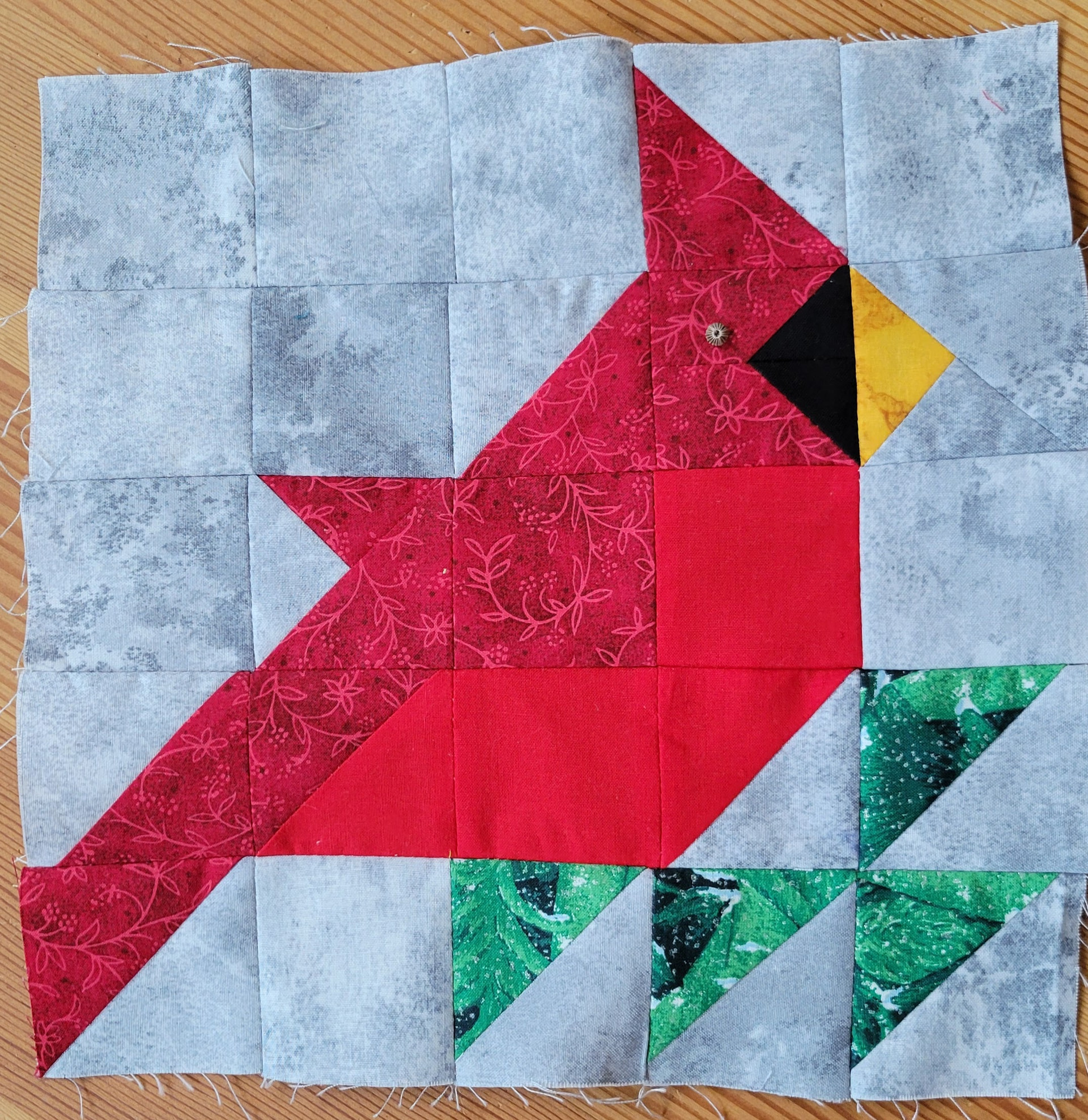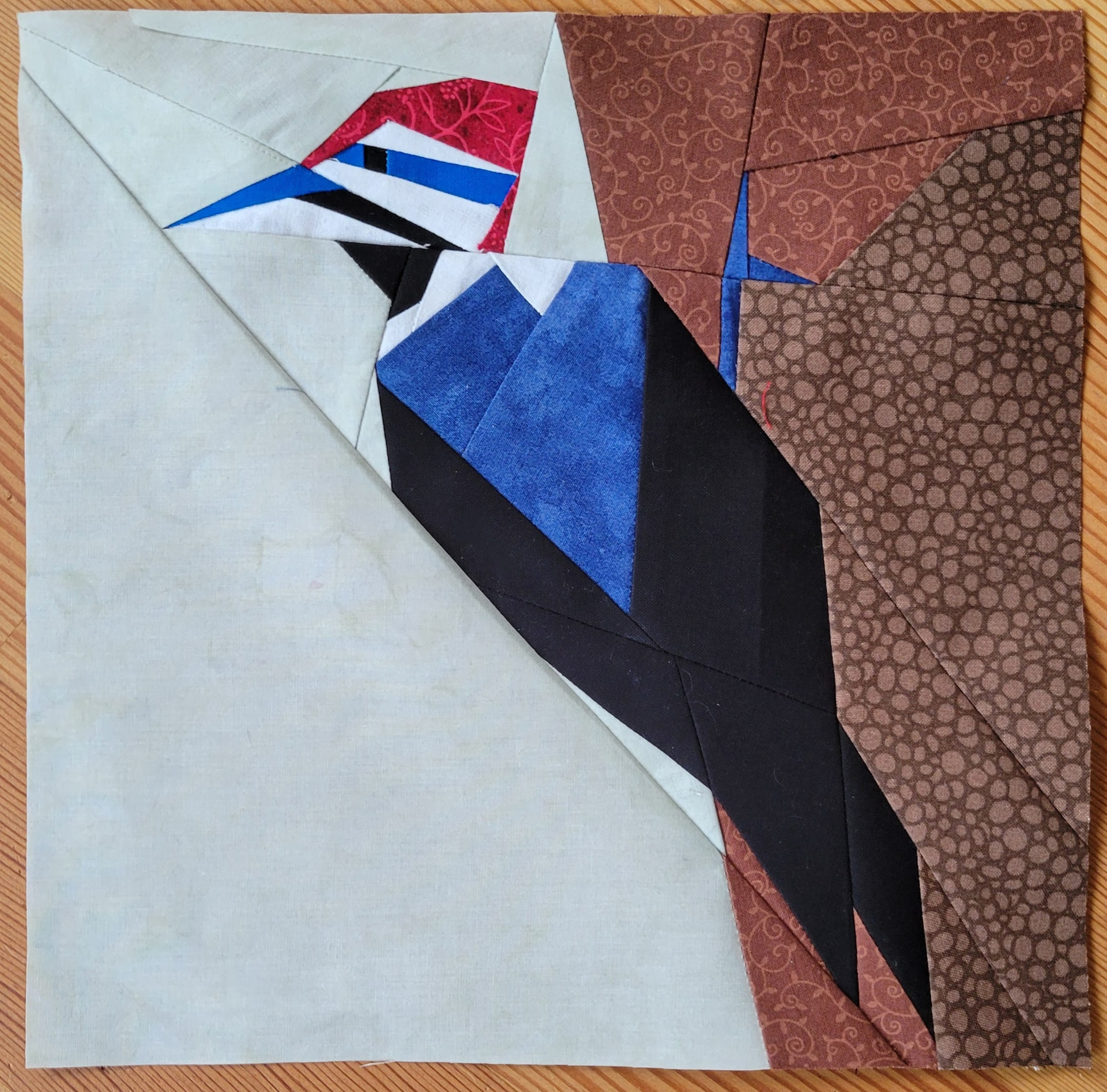 Pileated woodpeckers are fascinating to me. I love catching a glimpse now and then. This is a modified paper piecing from https://www.etsy.com/listing/1891307058/pileated-woodpecker-fpp-backyard-birds. I ended up drafting my own pattern; I felt there were just too many tiny bits. This one has tiny bits too, just fewer. It was a challenge to my dyslexic challenged mind. Yesterday I ripped out more seams than I could count. But today I finished it up. It is a 10โ finished square.