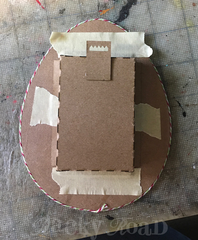 The niche was put in place and the flaps glued to the back of the egg. Masking tape held down the flaps during drying time. The hanger was also glued on at this time.