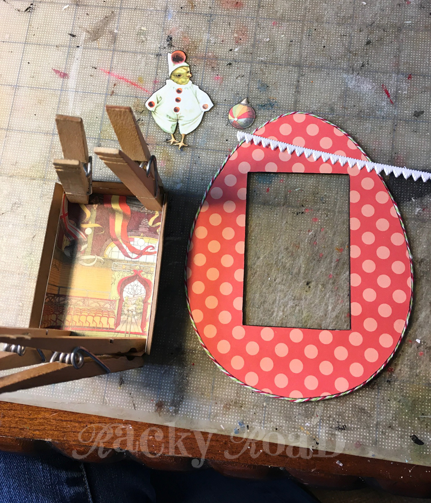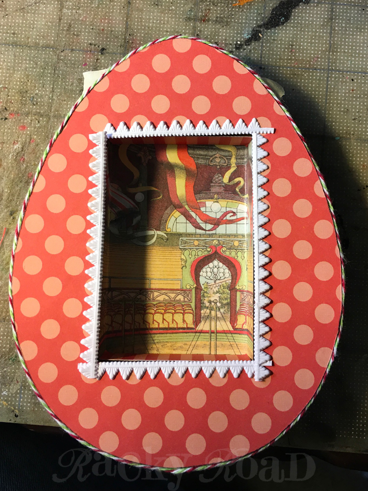 White Dresden trim around the opening reminds me of those sugar eggs with the scene in them that I used to love as a kid. I tried it out to make sure I liked it before gluing it down. In the photo below, the flags in the circus background have not yet been doubled up. That was my next step.