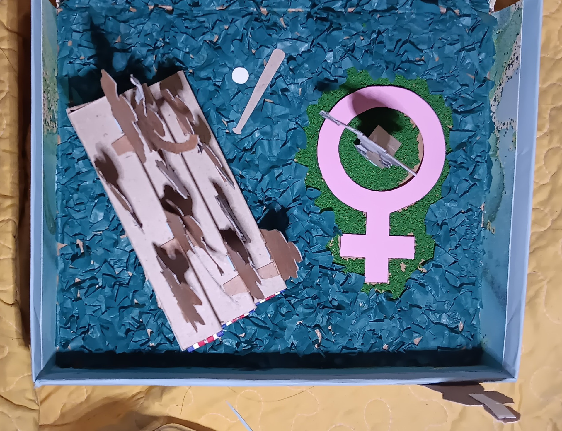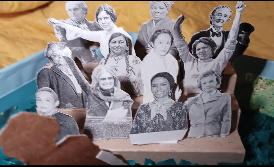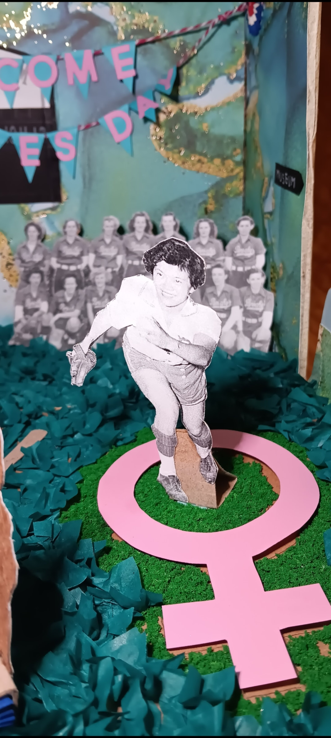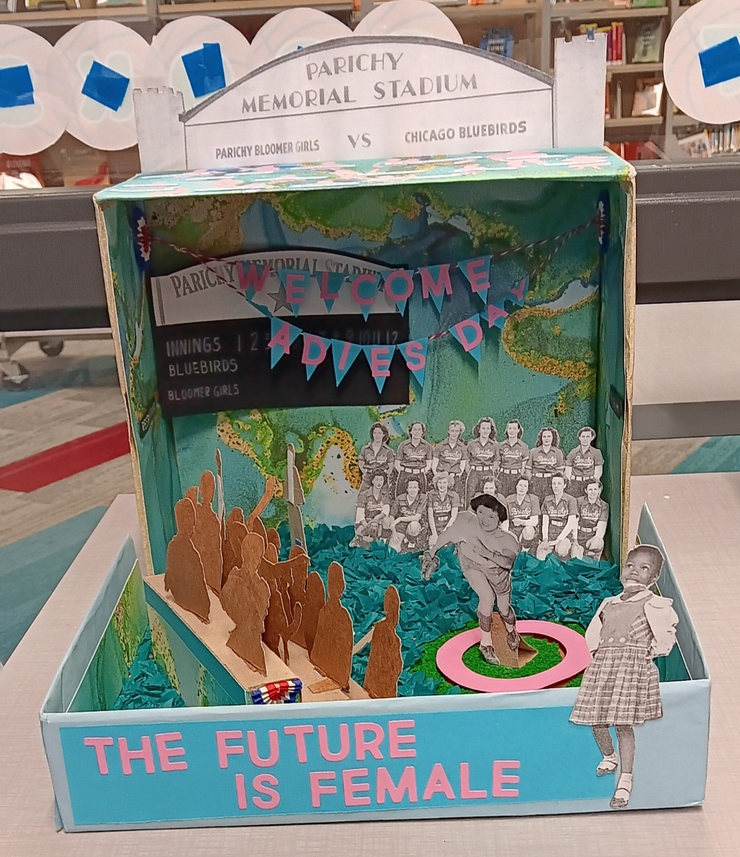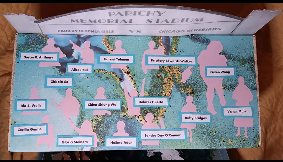 I made this diorama for a library program/contest, where you would pick an article from the local paper and make a diorama out of it. Mine was about a “league of her own” type baseball team called the Parichy Bloomer Girls, sponsoring a Ladies Day. One of the pitchers was Gwen Wong, a Chinese-American. I happened to find a book about Chinese-American history in a little free library and used some of the book’s illustrations for the outside of the diorama. I took some liberties and made the baseball fans various activists and trailblazers.