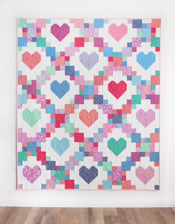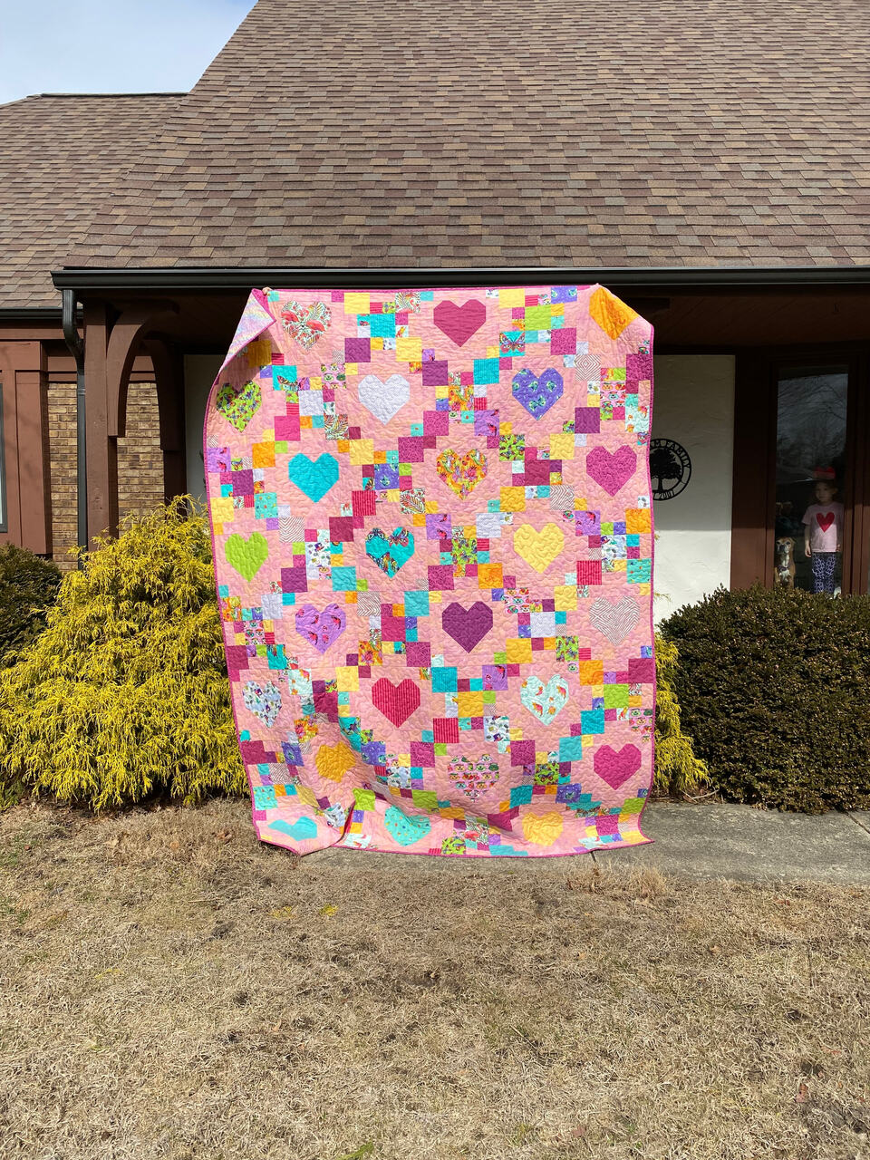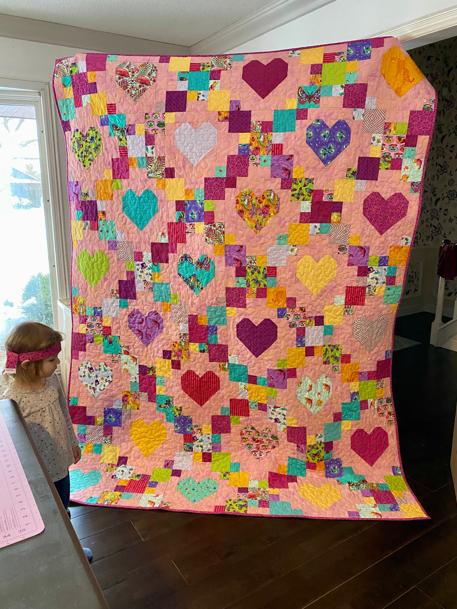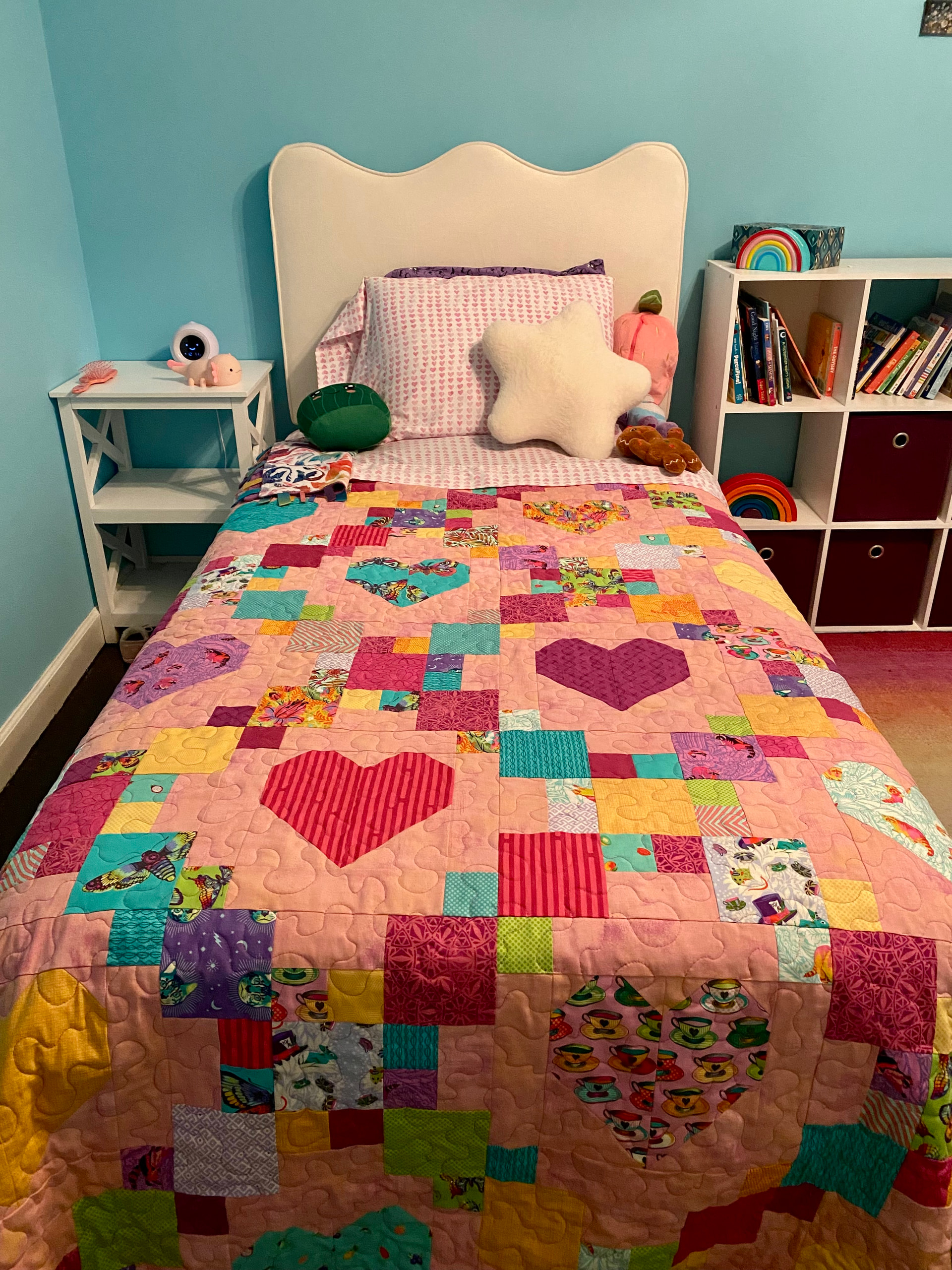 So I ordered a twin mattress and a cute set of sheets. But what about a bed quilt? My quilter’s soul couldn’t justify picking up a cheap polyester comforter, so I googled around for twin size patterns that were good for kids. This Heartsy pattern came up and Ada saw it on my screen and loved it. Nearly everything she wears or picks out lately is either pink, or covered in hearts. When I asked why she told me in an exasperated tone, “Mama, I love love!”