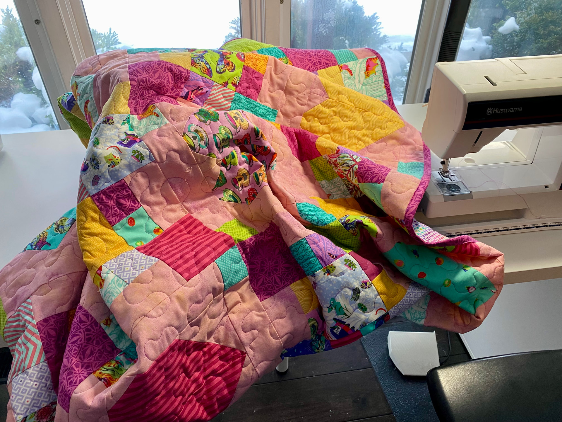 And here’s the whole collection, including backing (far left), background (pink Grunge), binding (top pink print), and the blender prints (rainbow in the center). Yep. The color palette is a 4 year old’s fever dream. When I had the top assembled on the floor, my husband came downstairs, took one look and said “I know it’s not actually Lisa Frank, but I totally expect this to be on a Trapper Keeper.”