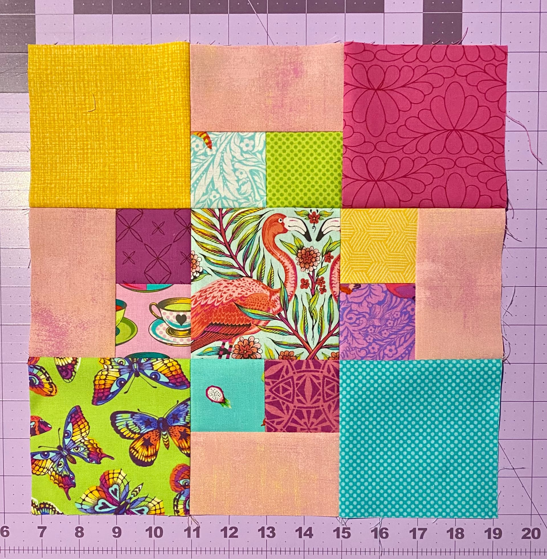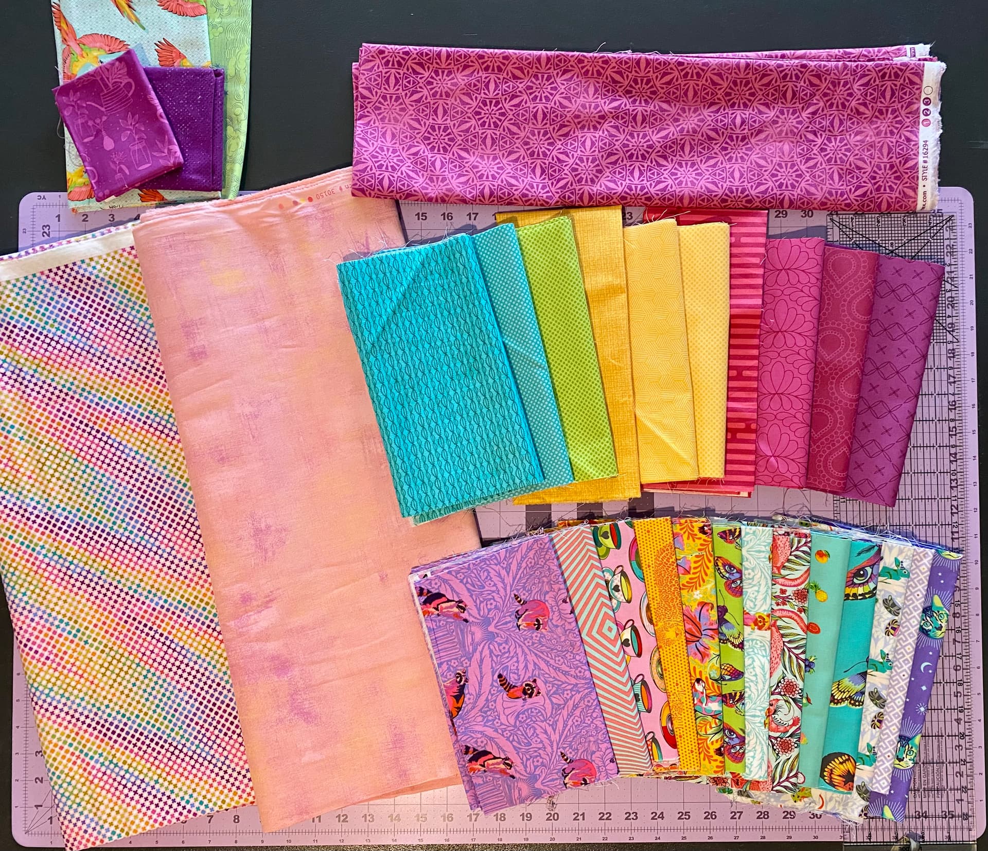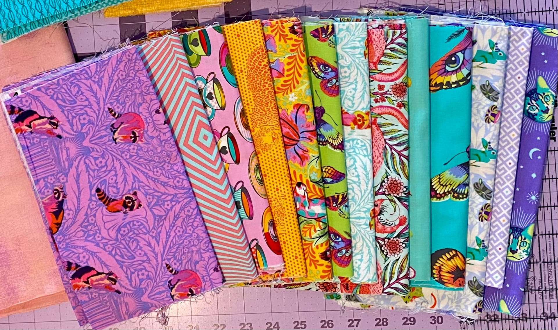 A twin calls for 25 fat quarters or regular quarter yard cuts. I looked around for a FQ bundle online, but didn’t see anything that wowed me. Then I remembered that I have a bunch of Tula Pink scrap cuts that are 1/4 yard! I pulled out 13 that I thought would work, and headed to the local quilt shop, where I picked up 12 more prints, background, binding and backing. (While she loves pink right now, her room is painted turquoise and yellow and decorated with rainbows, so I was attempting to tie everything together.) These are the 13 from stash.
