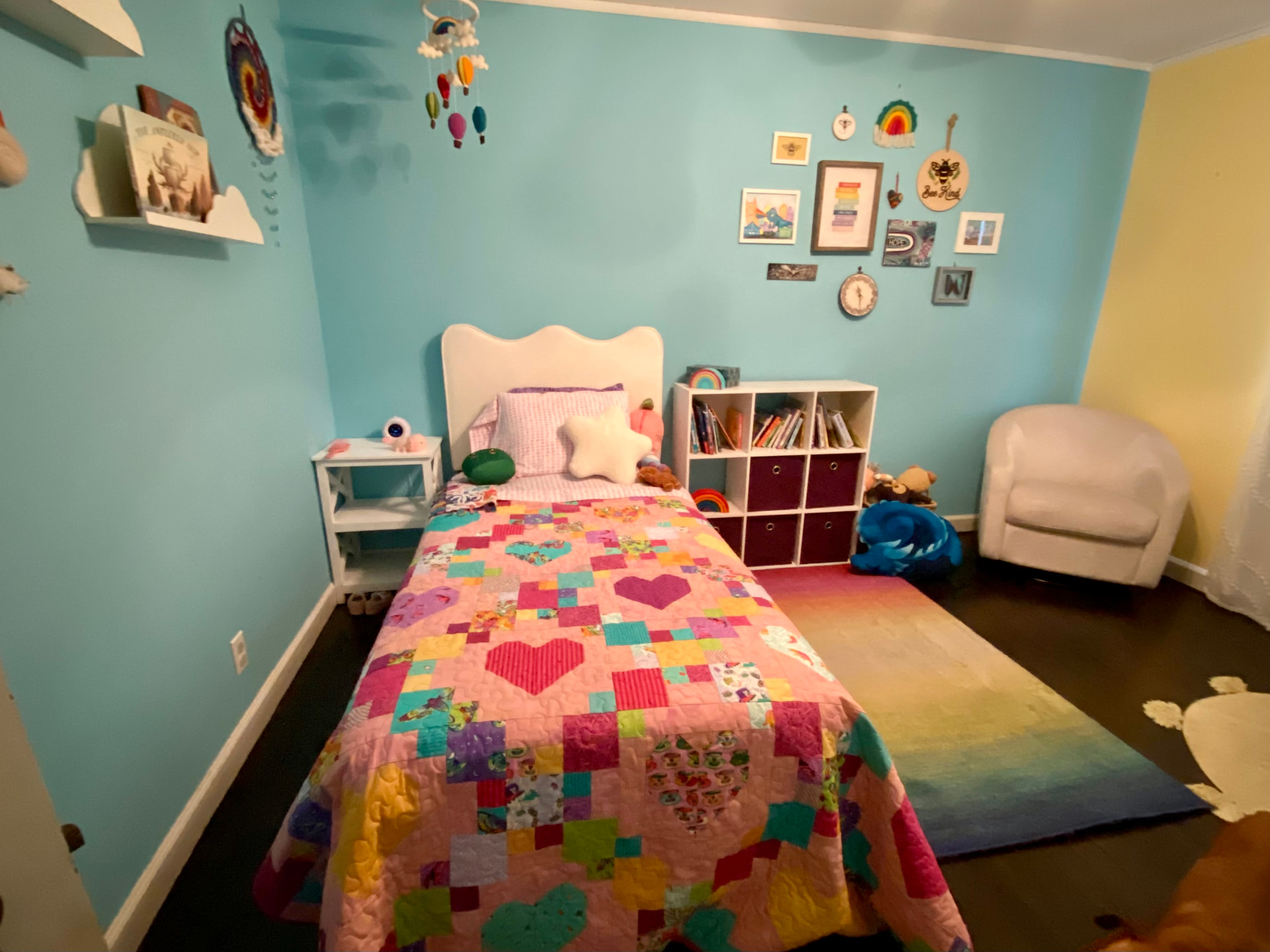 And a wider shot of her room at large, trying to show how the colors fit in. (And so many LC-made treasures on her wall!)