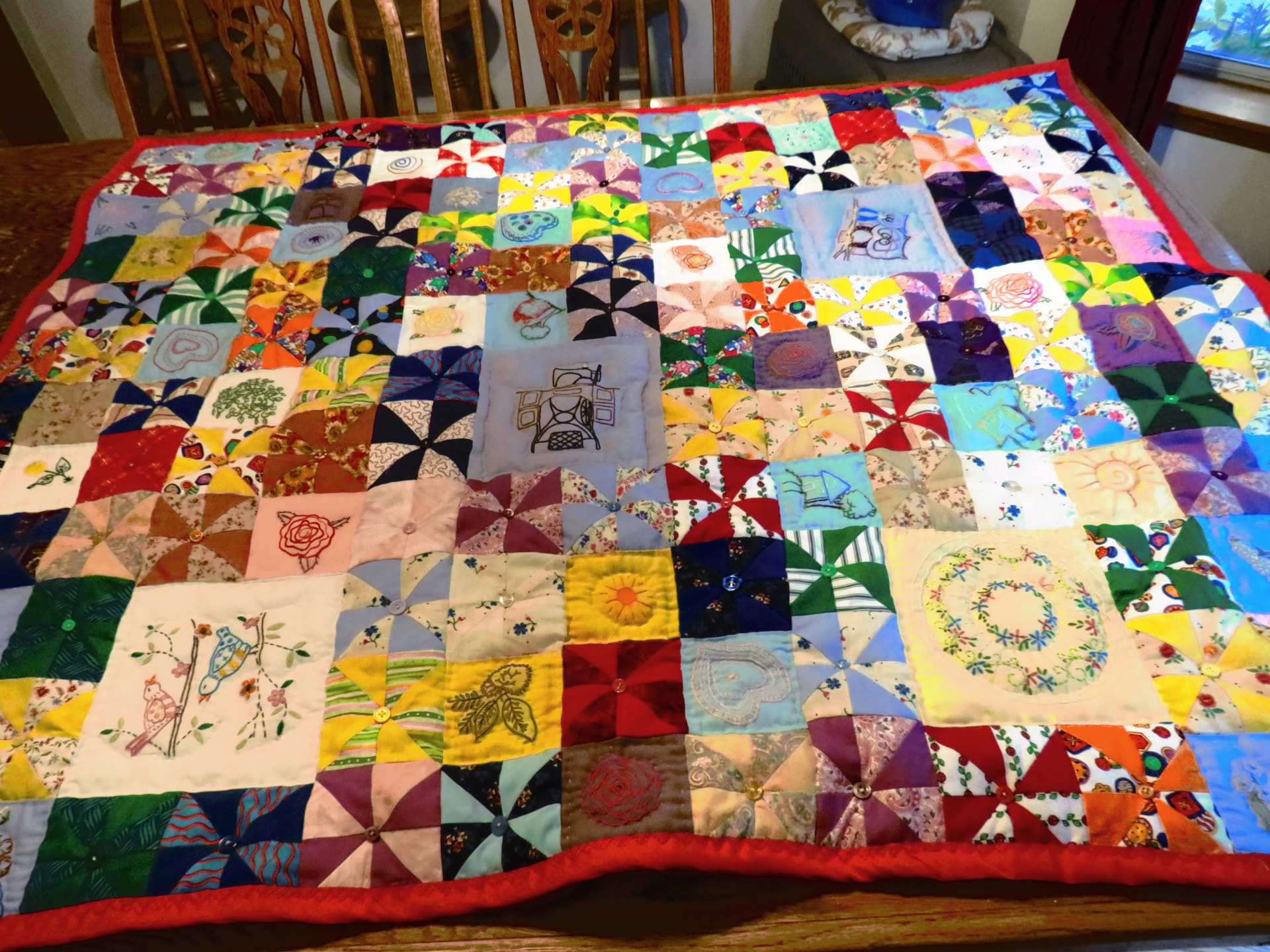Welcome! What a lovely project you have shared! I love the colorful pinwheel blocks as well as the embroidered pieces. Nice way to combine them into something beautiful. Hope your husband is doing well after chemo. Taking care of yourself through crafting will help him as well.