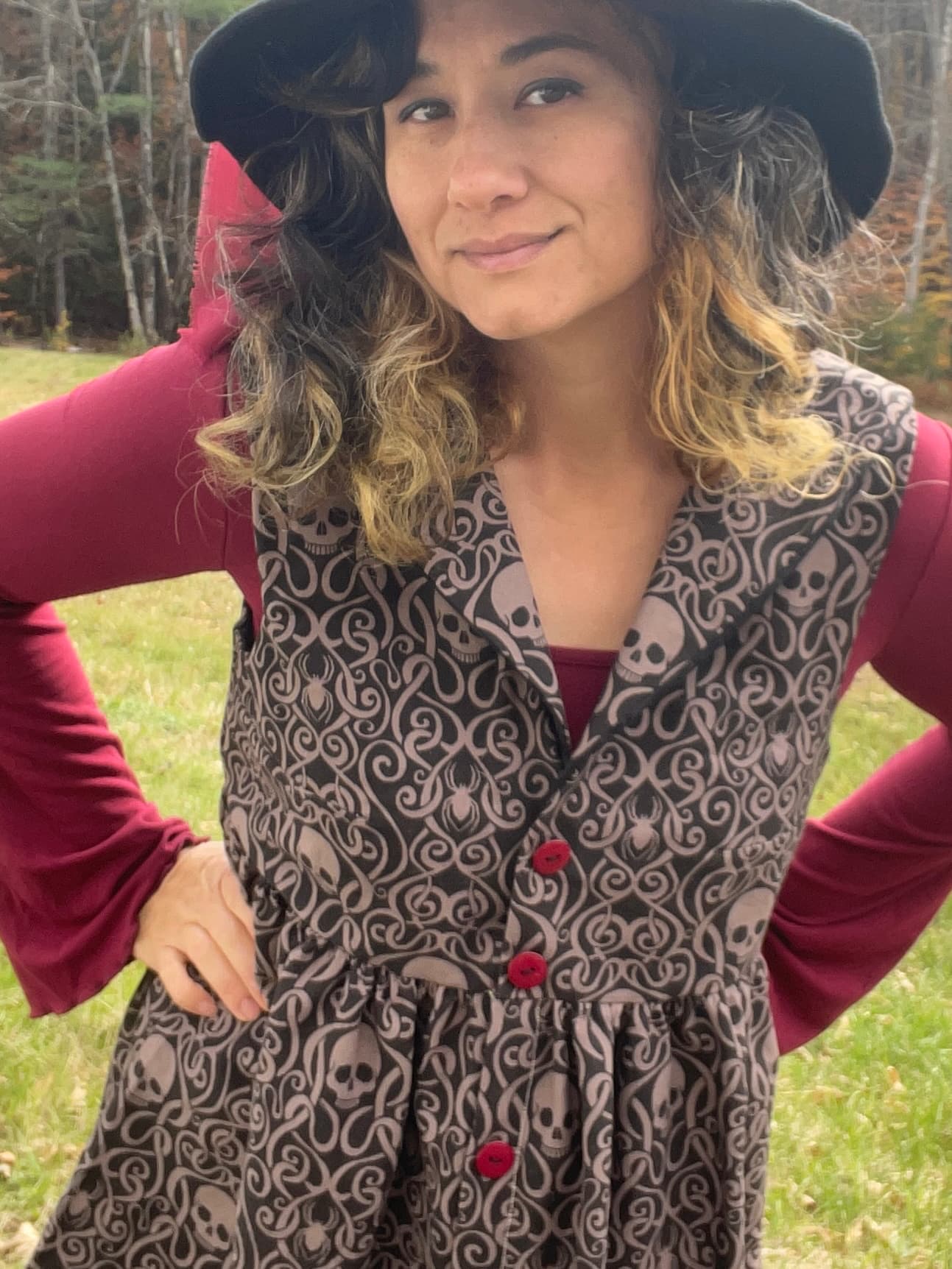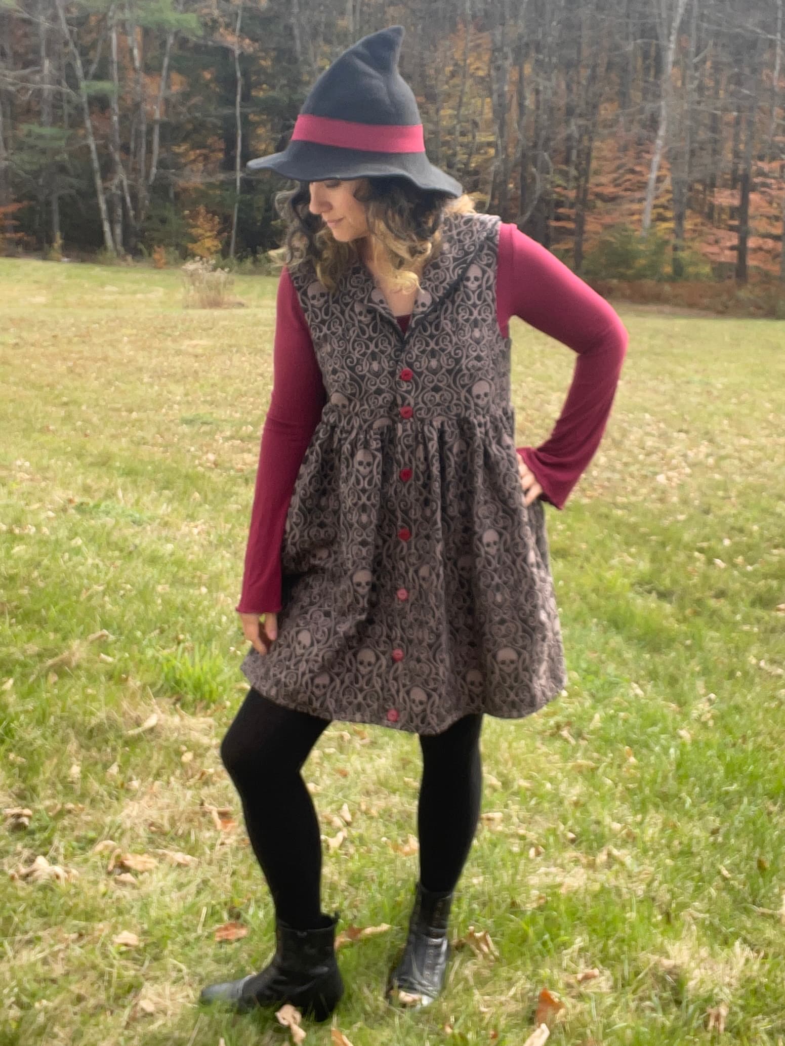 While waiting patiently I was also scoping out our local thrift shop for fun items that I could use in the All Hallow’s Eve swap. I found a skull and spider tablecloth. I knew it was destined to become the Darcy Dress and so it did.