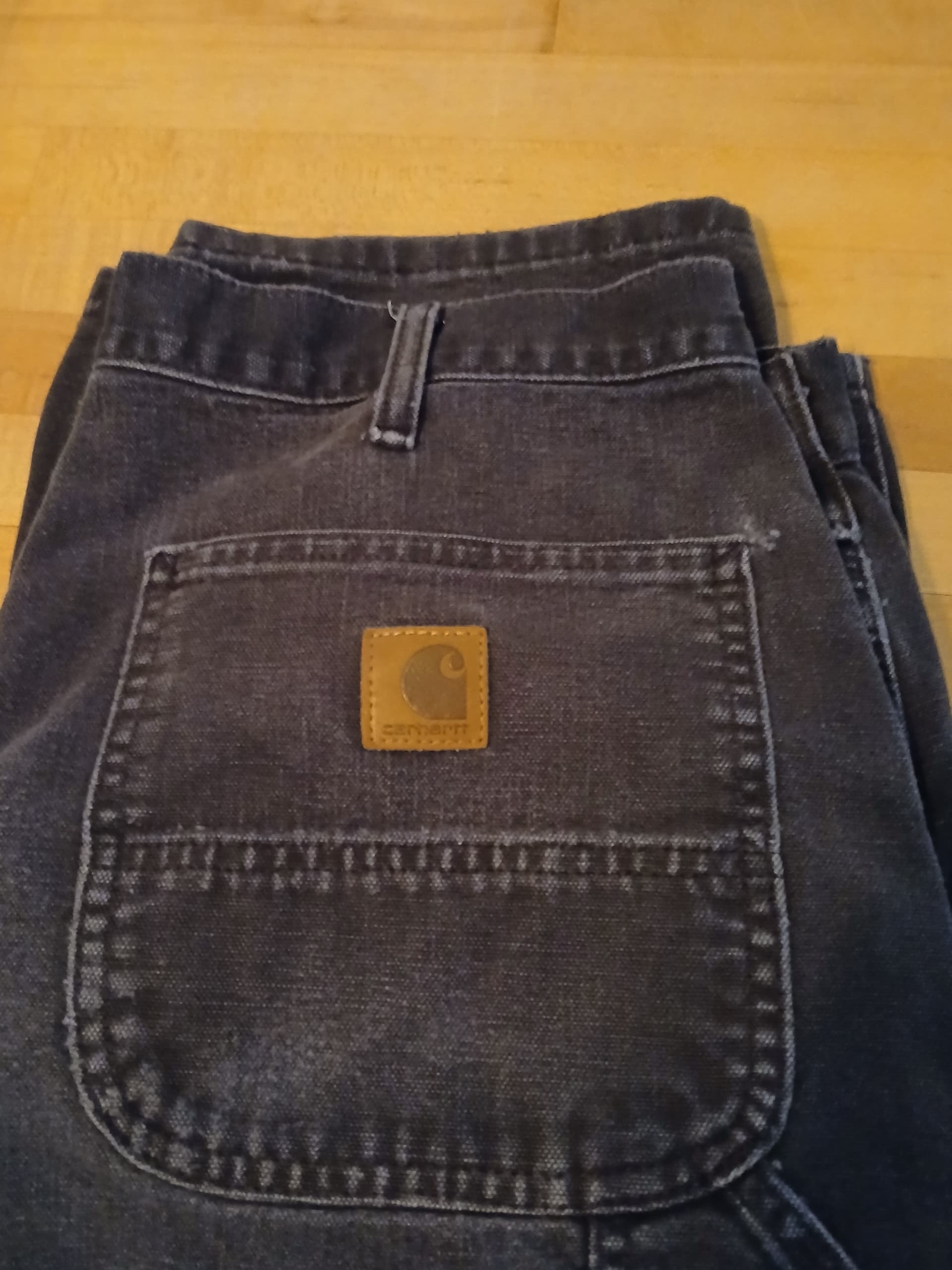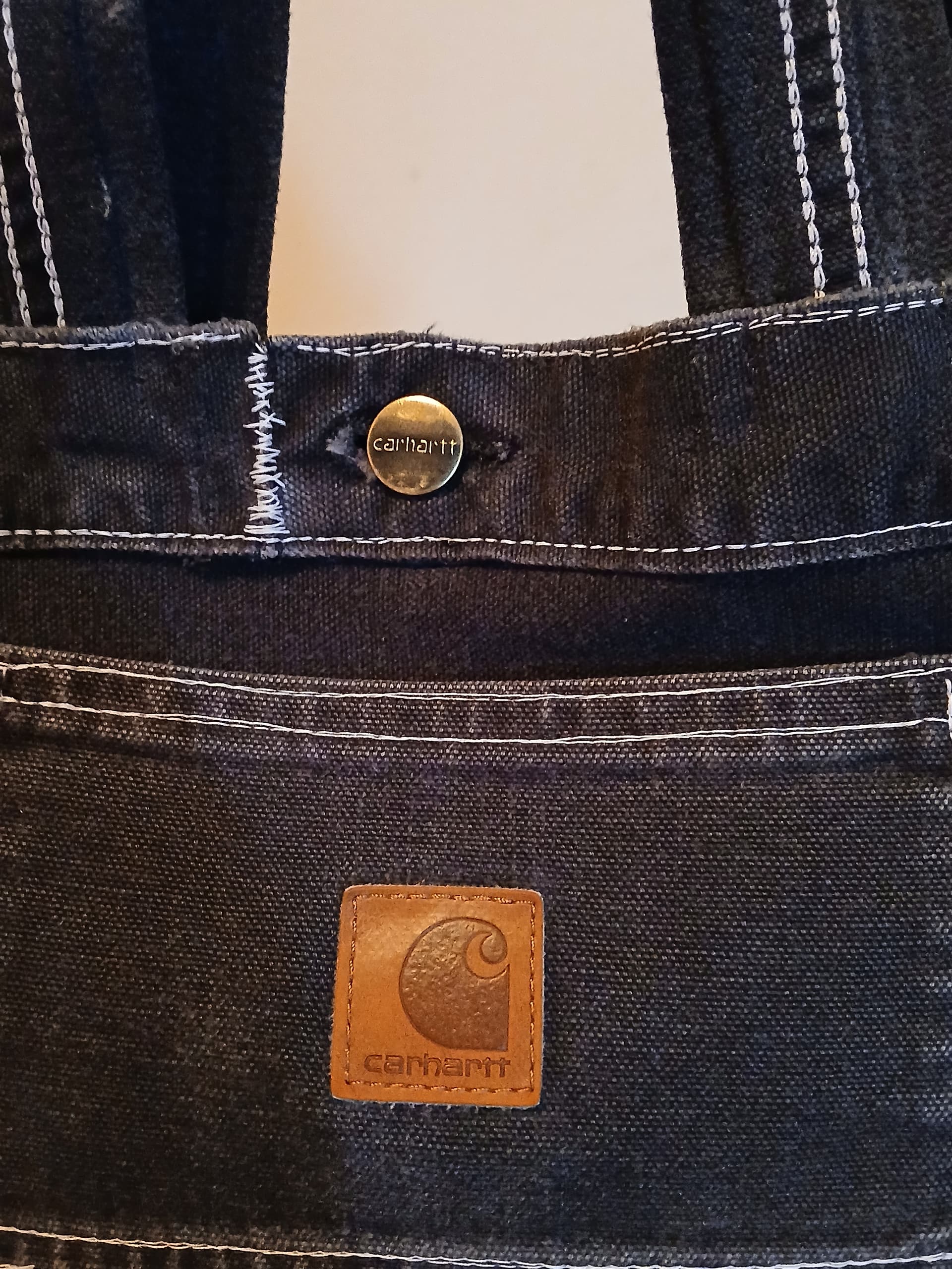 Must find a purpose for 5 discarded pairs of husband’s work pants. New, these pants are black with black stitching, now they are grey and grey. Turn them inside out and they are black with bright white stitching. I used the bottom of the legs for the bag then cut off the inside seams to add contrast to the handles. I removed the waist band then cut and repositioned so the brand logo button and original buttonhole could be used to close the bag. I replaced black stitching with bright white thread to continue the contrasting look.