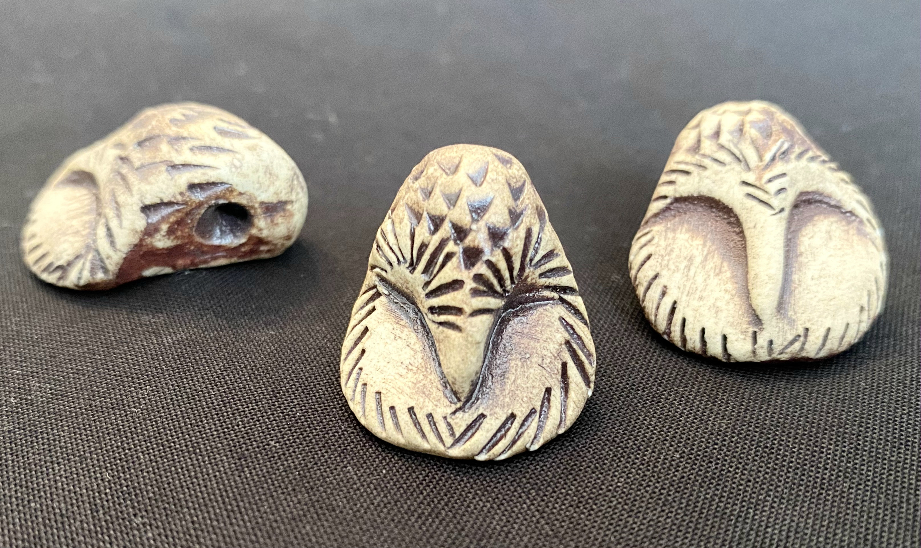 A Trio of amazing owl pendants! I can’t wait to turn these into jewelry pieces. Each has a hole through the top of the head, with a nice wide hole for stringing through.