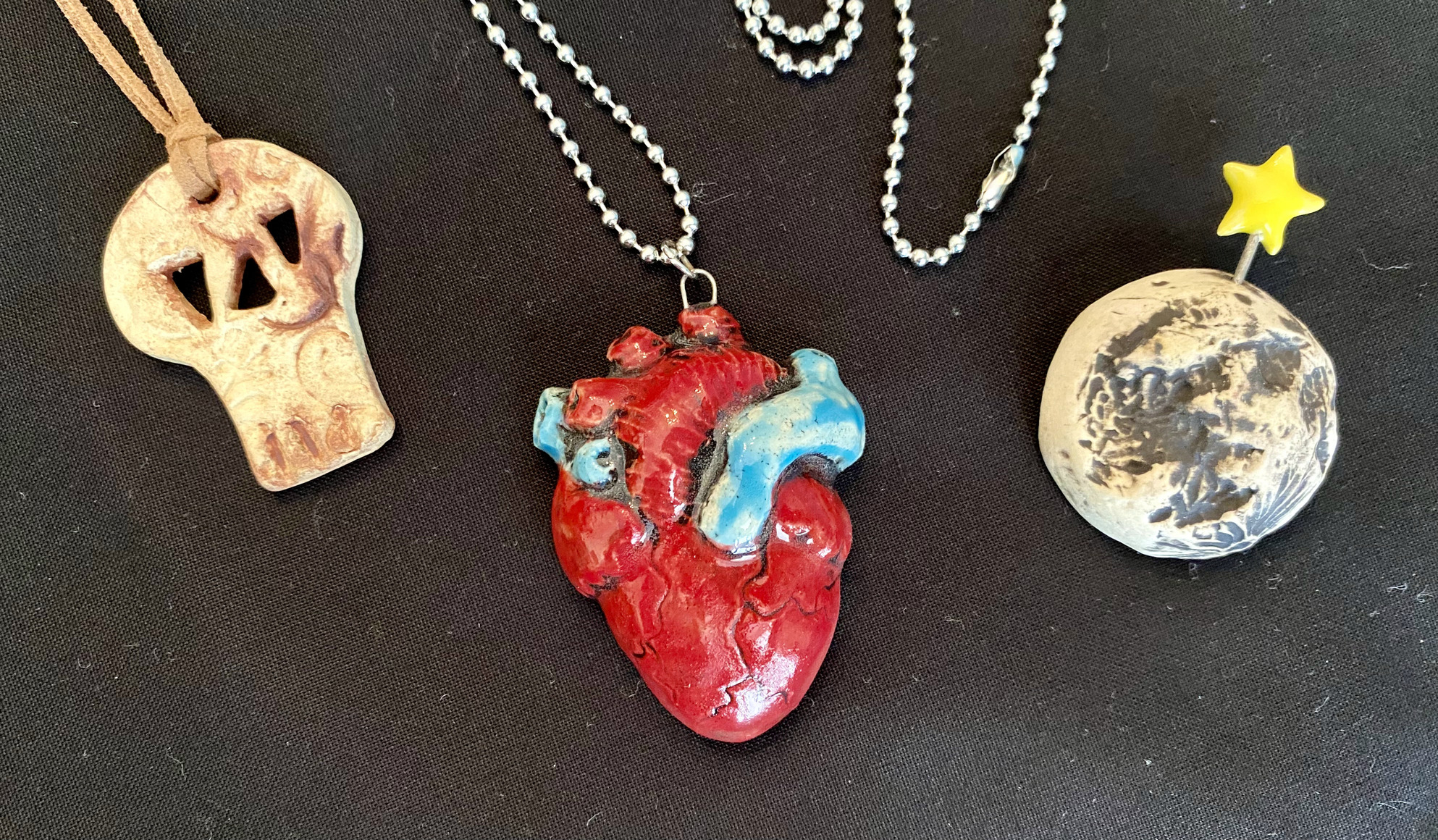 To continue with the jewelry fun, three awesome little pieces: A skull pendant (anyone else thinking about the Goonies ‘Play the Bones’ key pendant???), an anatomical heart pendant, and a moon & star pin.