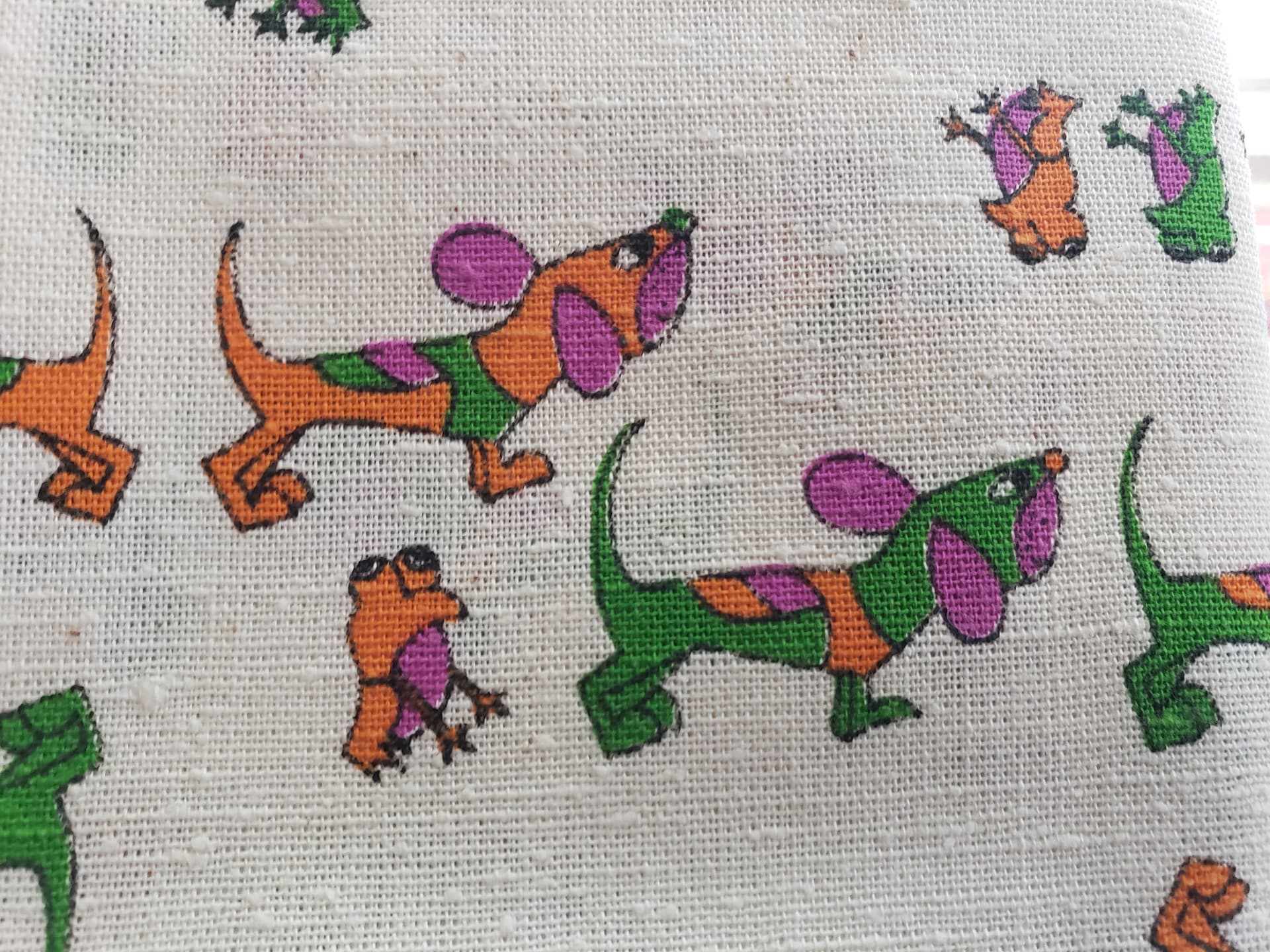 Those are the colors that are part of my go to palette…orange, green violet! What an odd print…frogs and dogs…lol