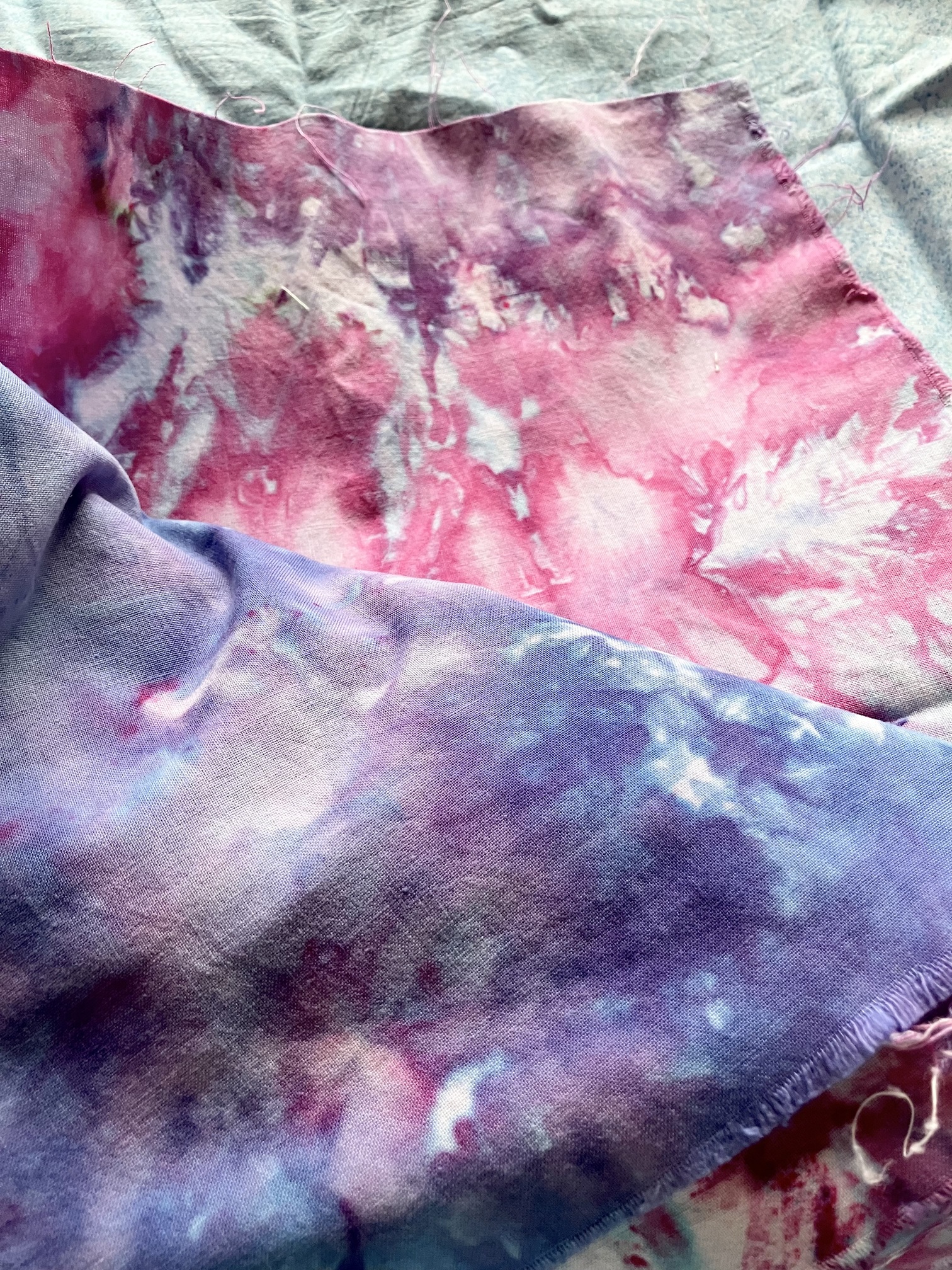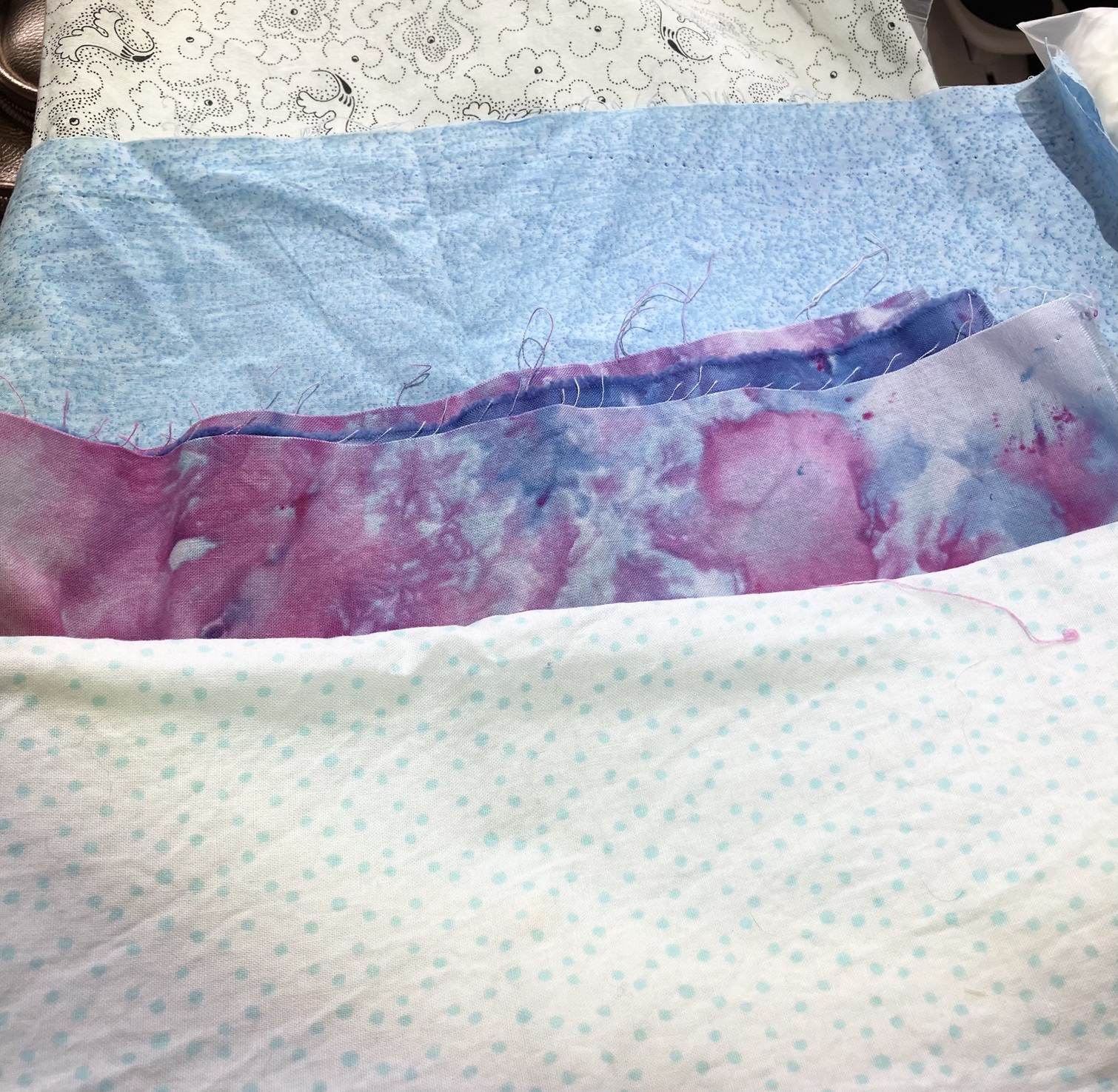 I’ve gone through my small, but mighty stash and here is what I found that might work although the tie dye one might be too bright, but there is variation of color so I could cut a square in the more blue section.