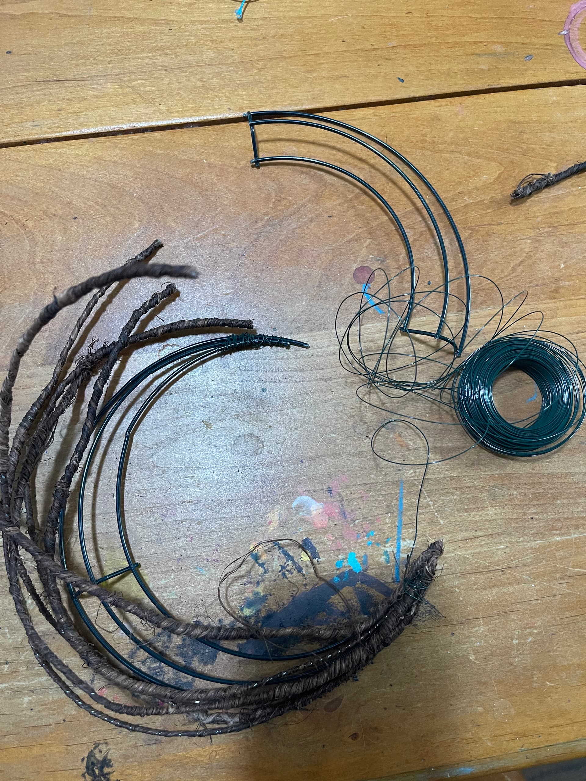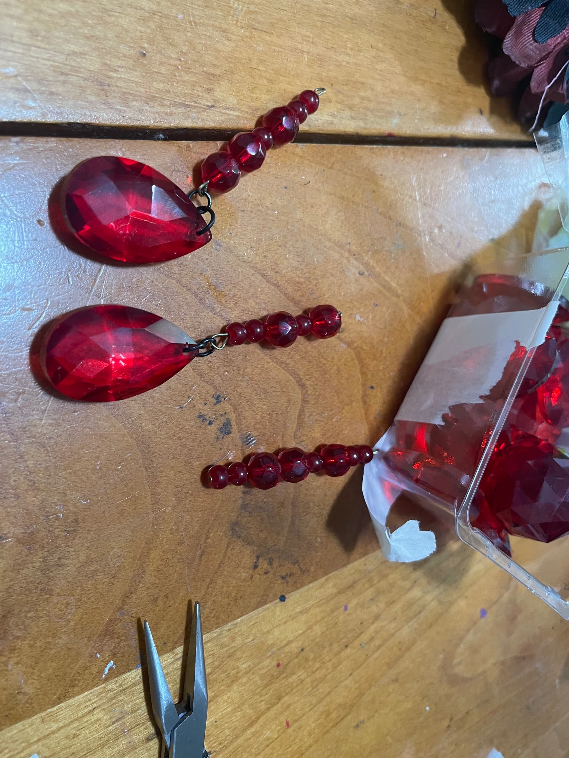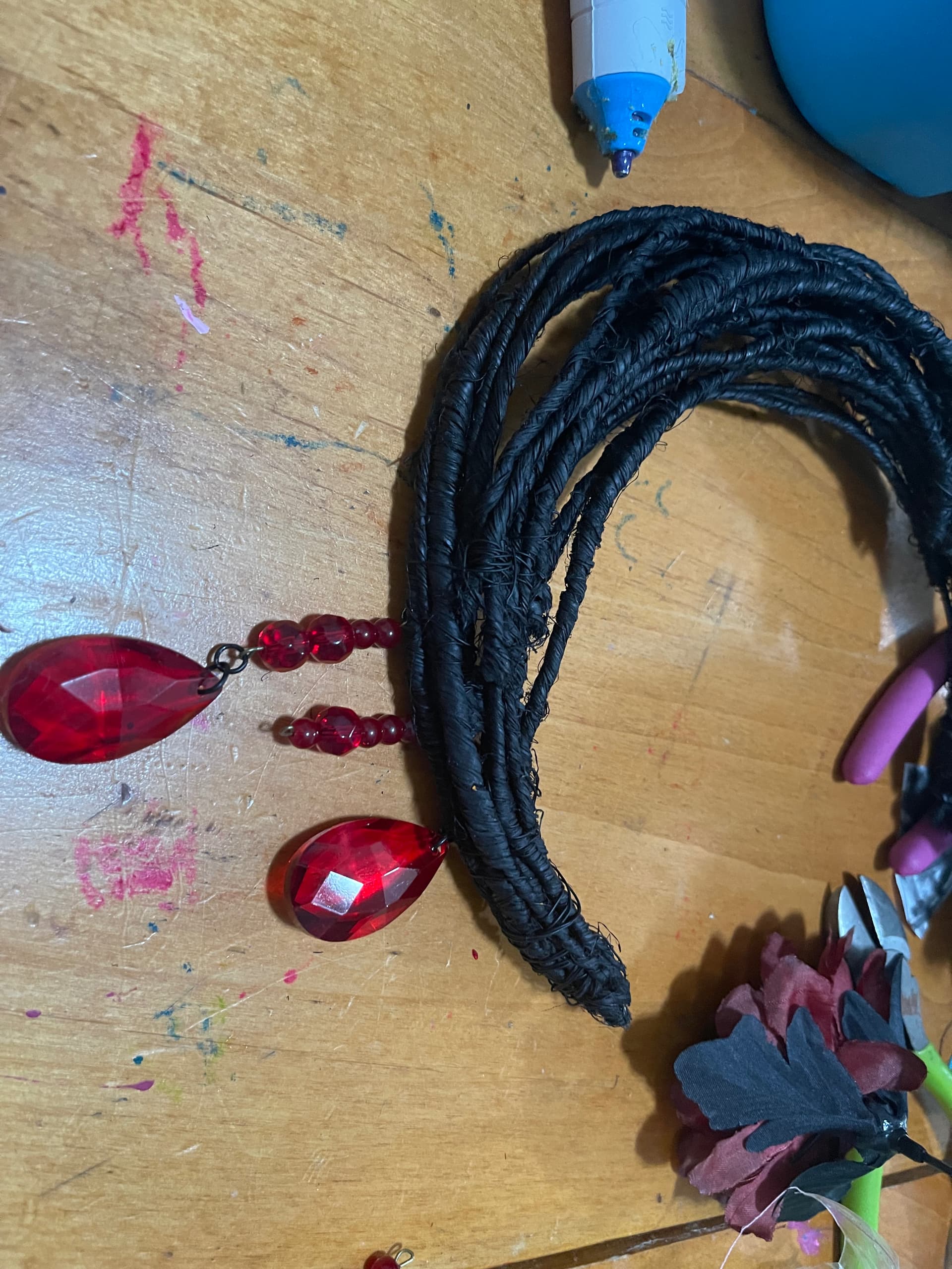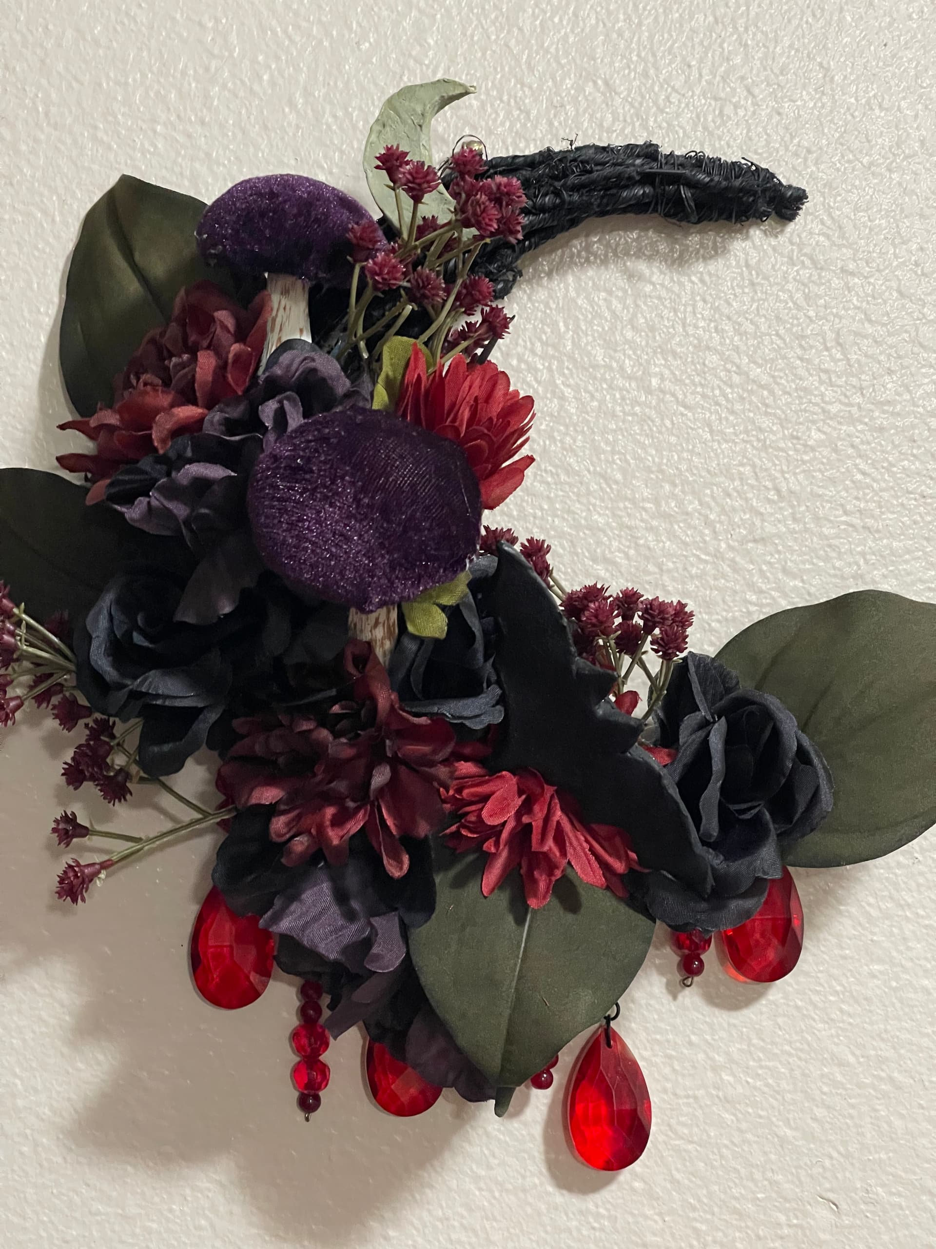 Here is another wreath I made for another partner in the All Hallow’s Eve swap. With this one, I went with a vampire/gothic kind of vibe. I did a half moon wreath (I cute a wire circular wreath) and added some vine wire. I also added red needs to make it look like blood dripping.