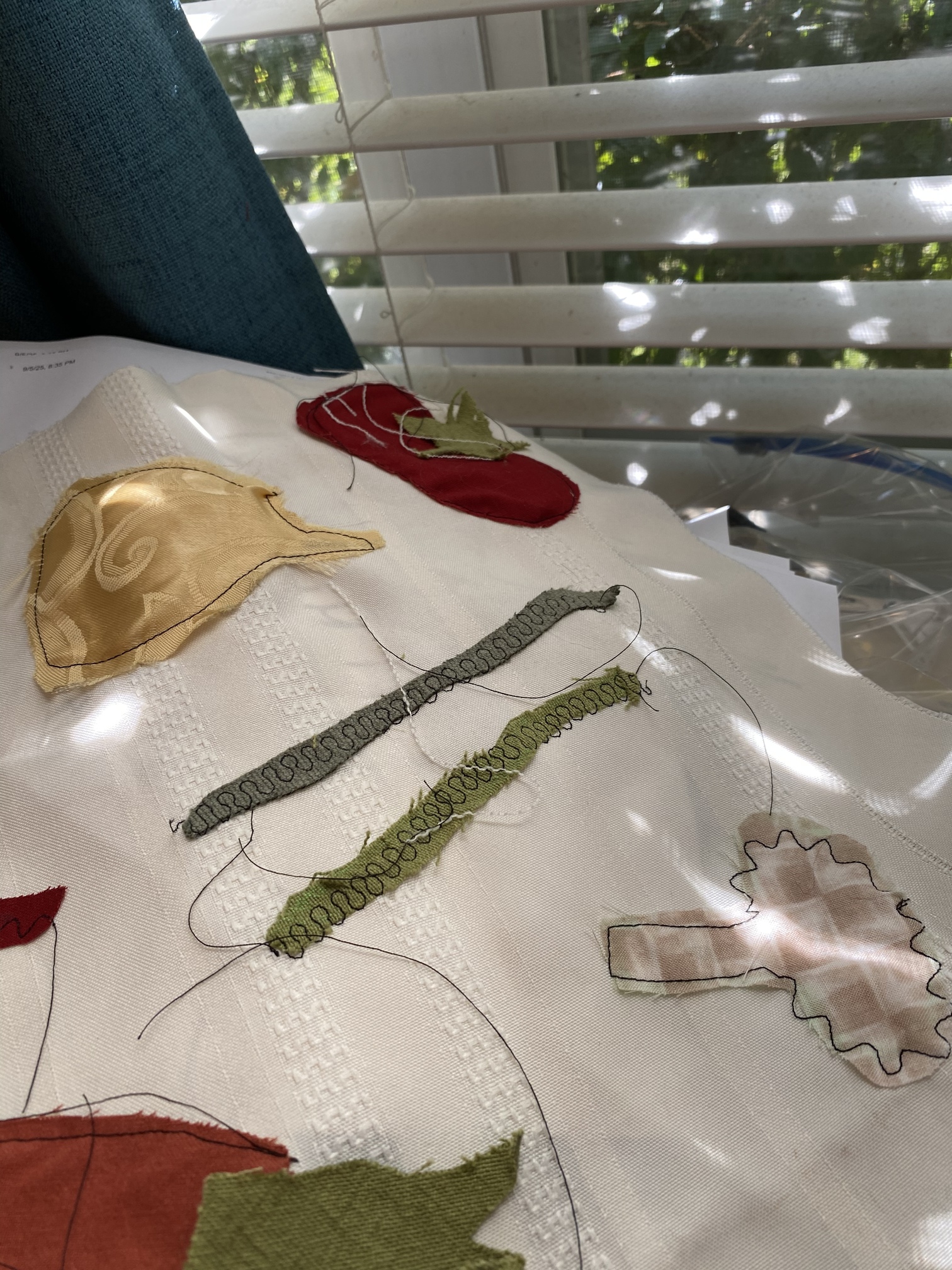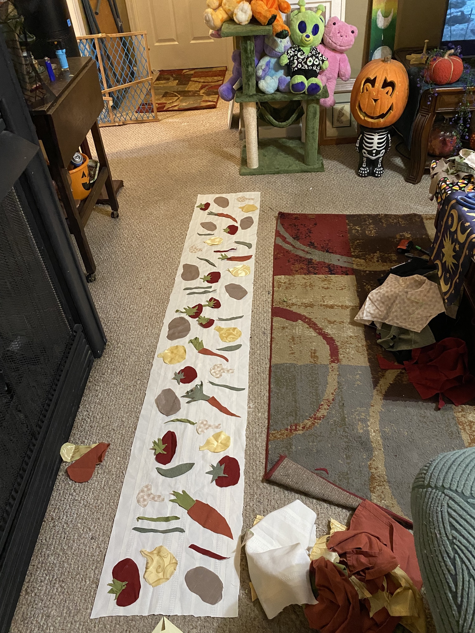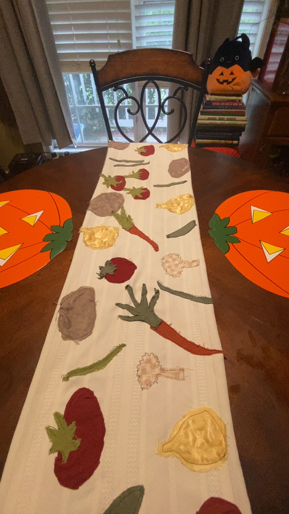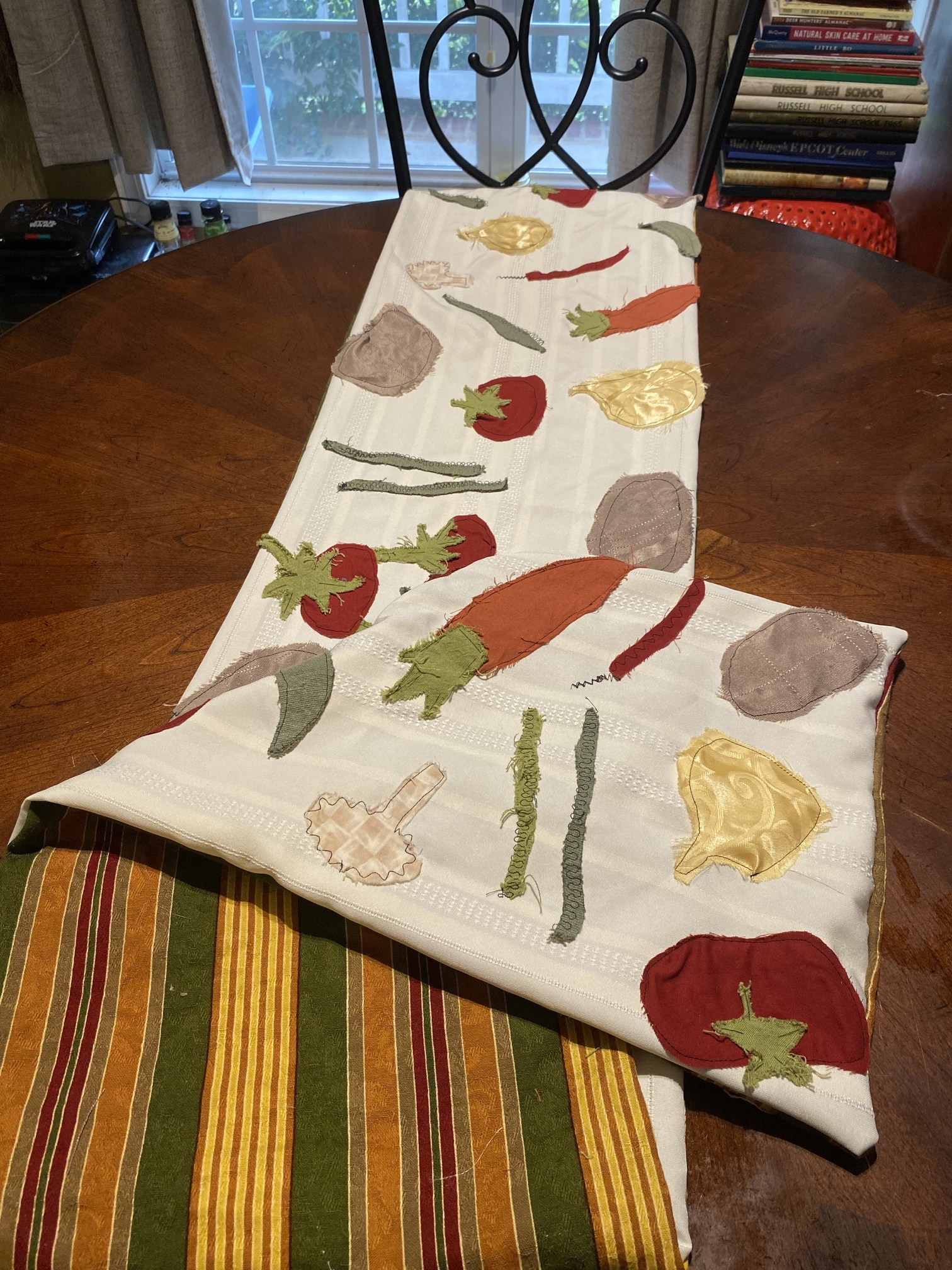 The veggies were cut from old placemats my mom had in the scrap box she gave me, machine sewed them all on, the bottom is the leftover fabric from curtains my mom made almost 20 years ago!