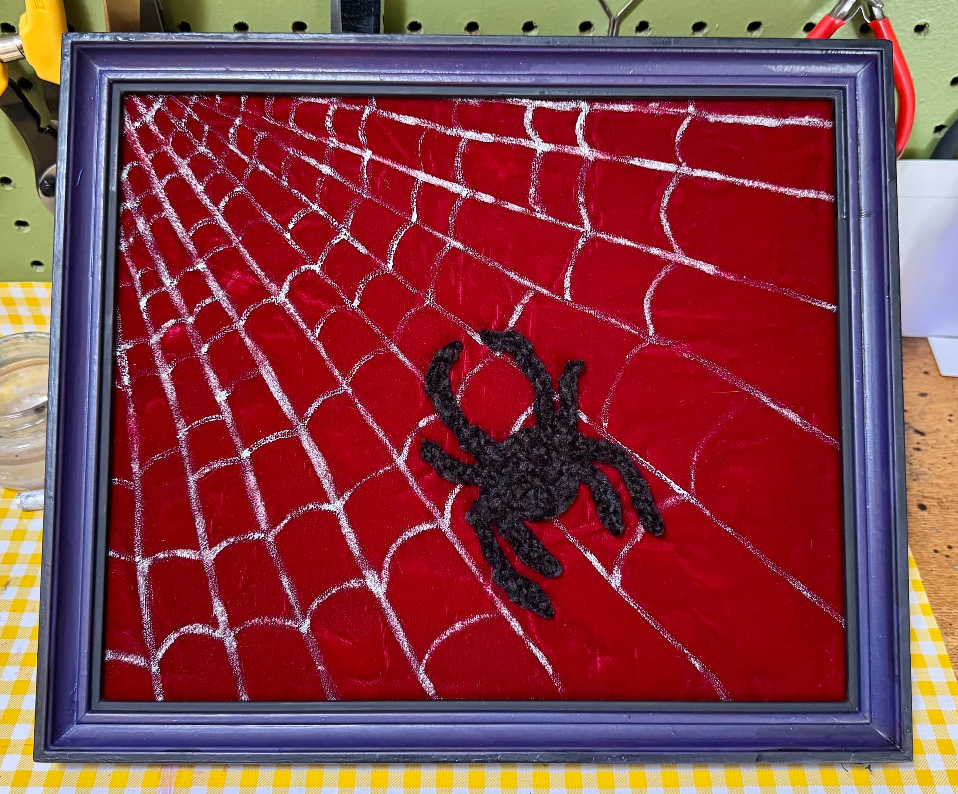 The red fabric is actual velvet, leftover from a project from 20 years ago. I painted the spiderweb on with silver acrylic paint, which was not as easy as I had expected. But, I’ve never painted velvet before! During this part, my DH walks by and says something about velvet paintings needing to be of Elvis. So, the crochet chenille spider got named Elvis! He felt that was satisfactory. lol…