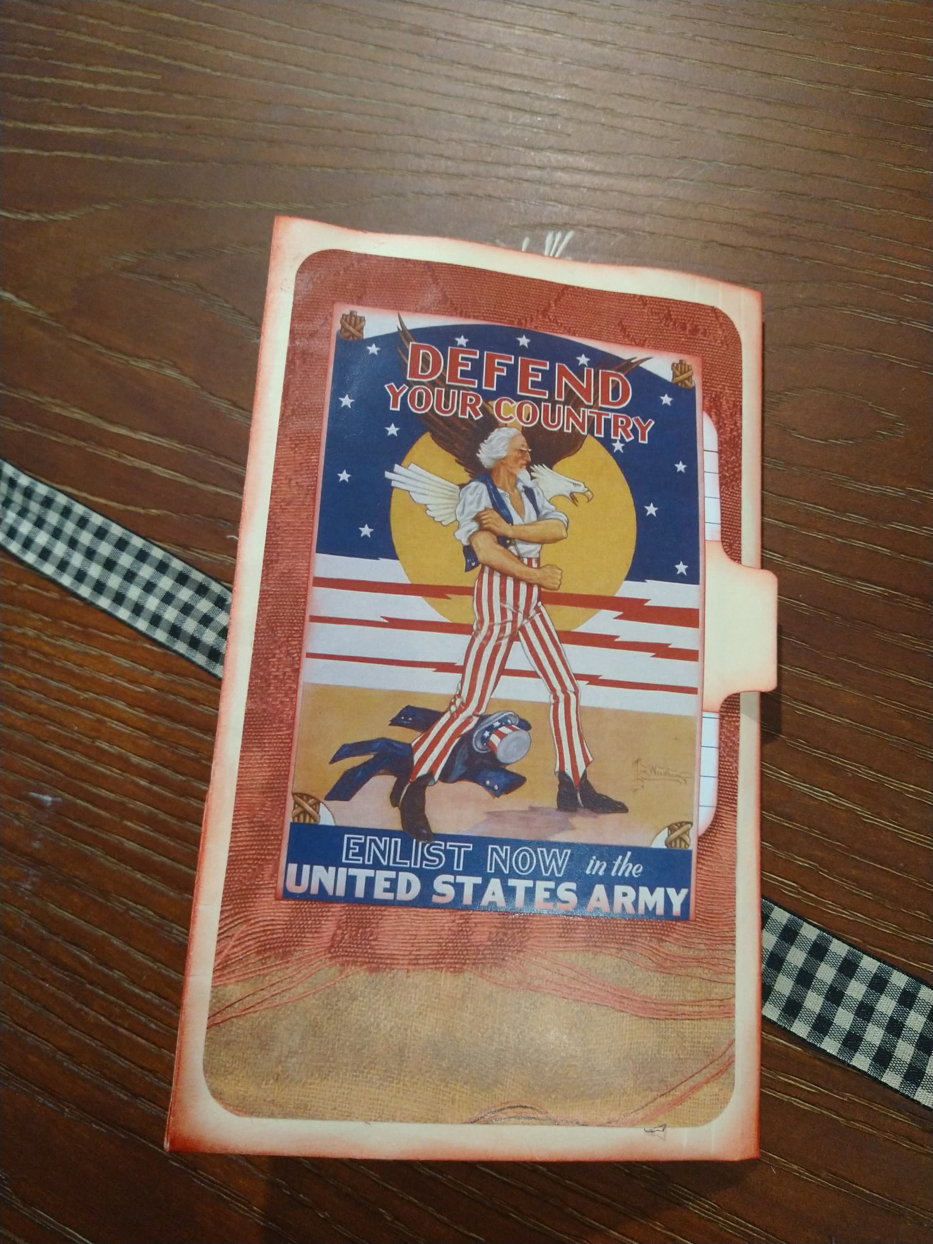 It’s a manilla file folder. All folded up, it’s 4.75” x 7.75”.