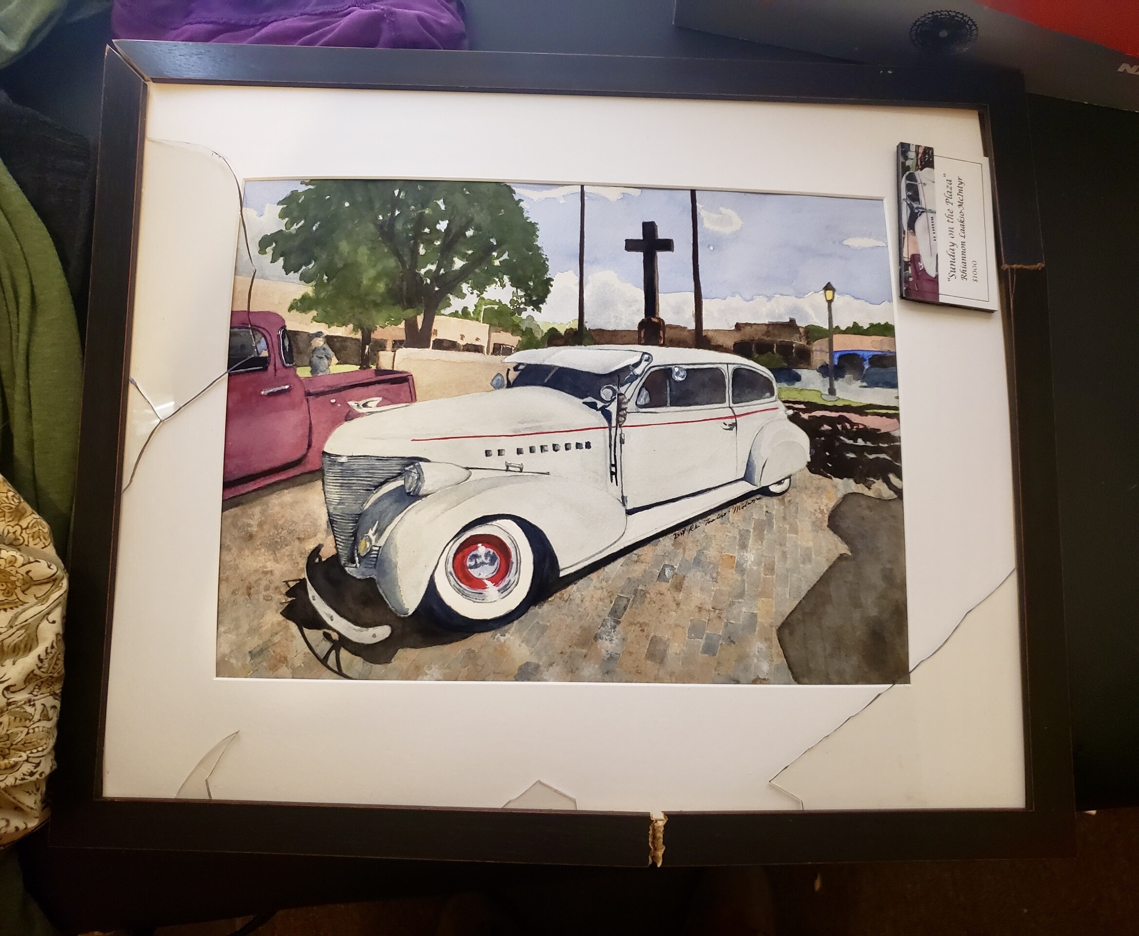 I don’t know yet exactly how it happened, but my painting’s frame was destroyed while it was hanging up at a local restaurant. I am just crushed. Waiting for a friend to call back to tell me what exactly happened.