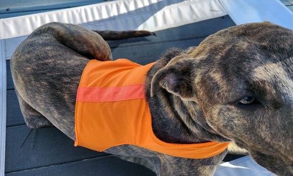 I used a store bought, light-weight harness we had as a pattern and a few different bright orange fabrics from my stash. The outer is a rip-stop nylon that I had to seam up the middle, so I reinforced that with s bit of a closer-to-pink florescent bias tape. The inside is safety orange polar fleece. It’s fastened with hook and loop, so is technically reversable, but it seems like the more moisture-resistant nylon would be out the most.