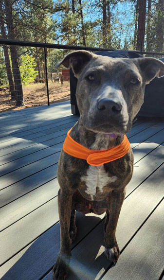 Well, it’s hunting season and even though Viv is much smaller than deer, she is shadow-colored, so he asked about some bright orange something for her to wear.