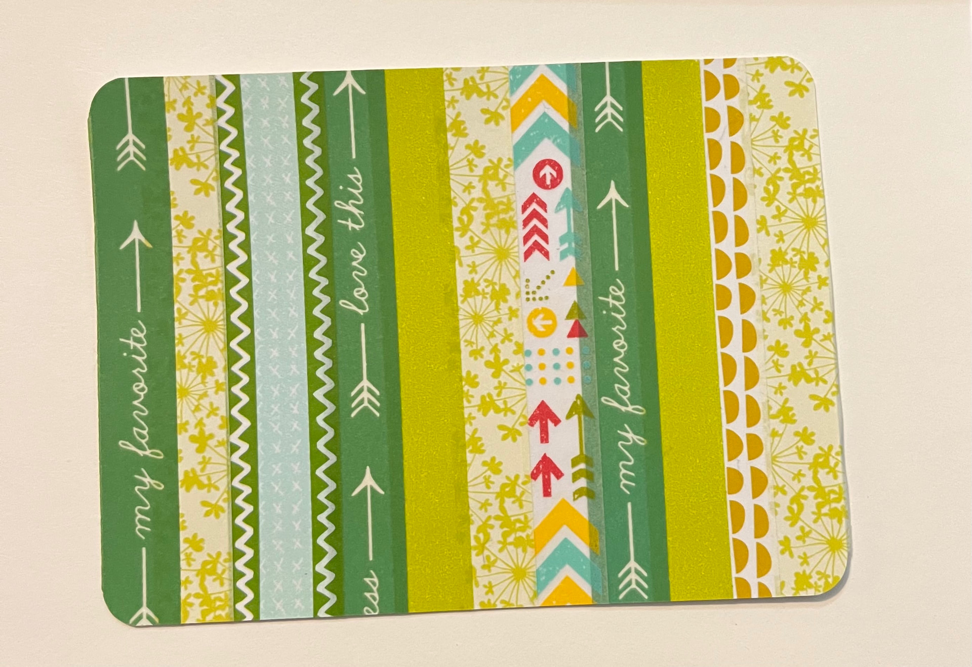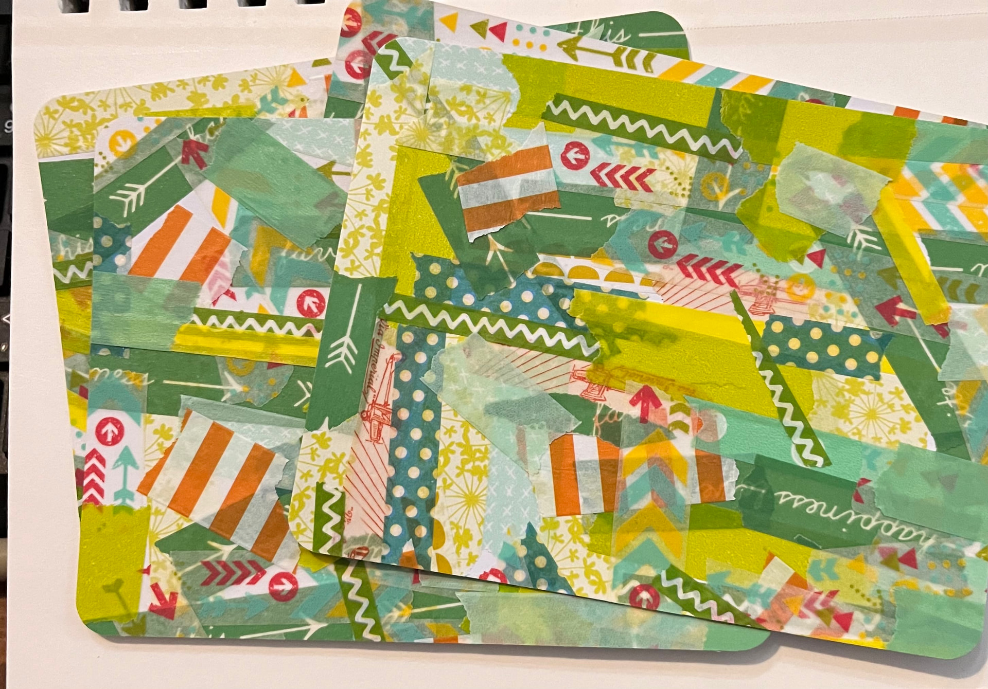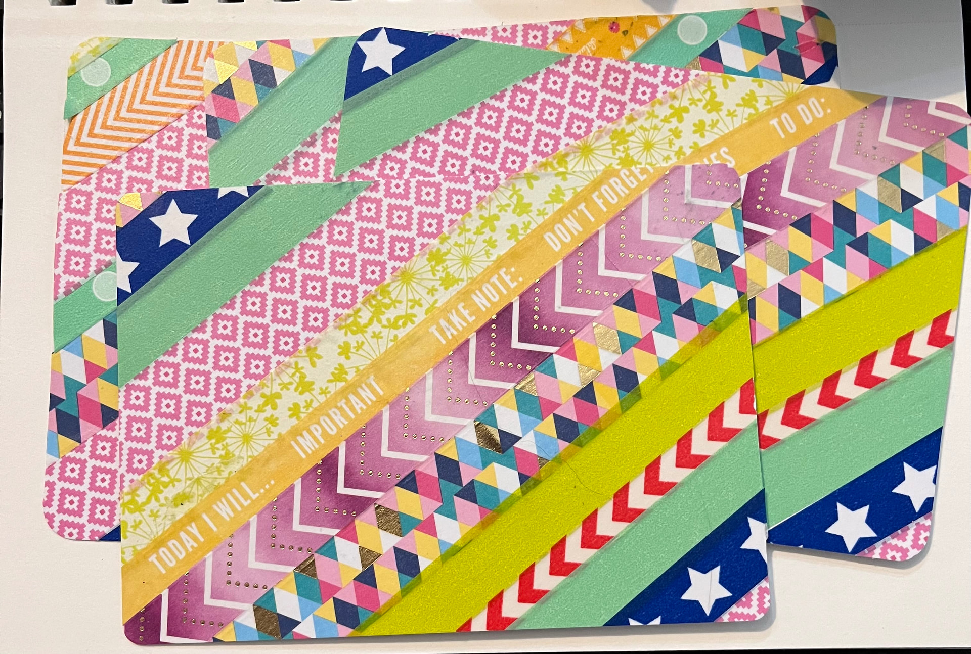 I covered sheets of 90 lb paper with washi, using a little bit of glue stick for the washi that wasn’t so sticky. Then cut down into 4s and rounded the corners