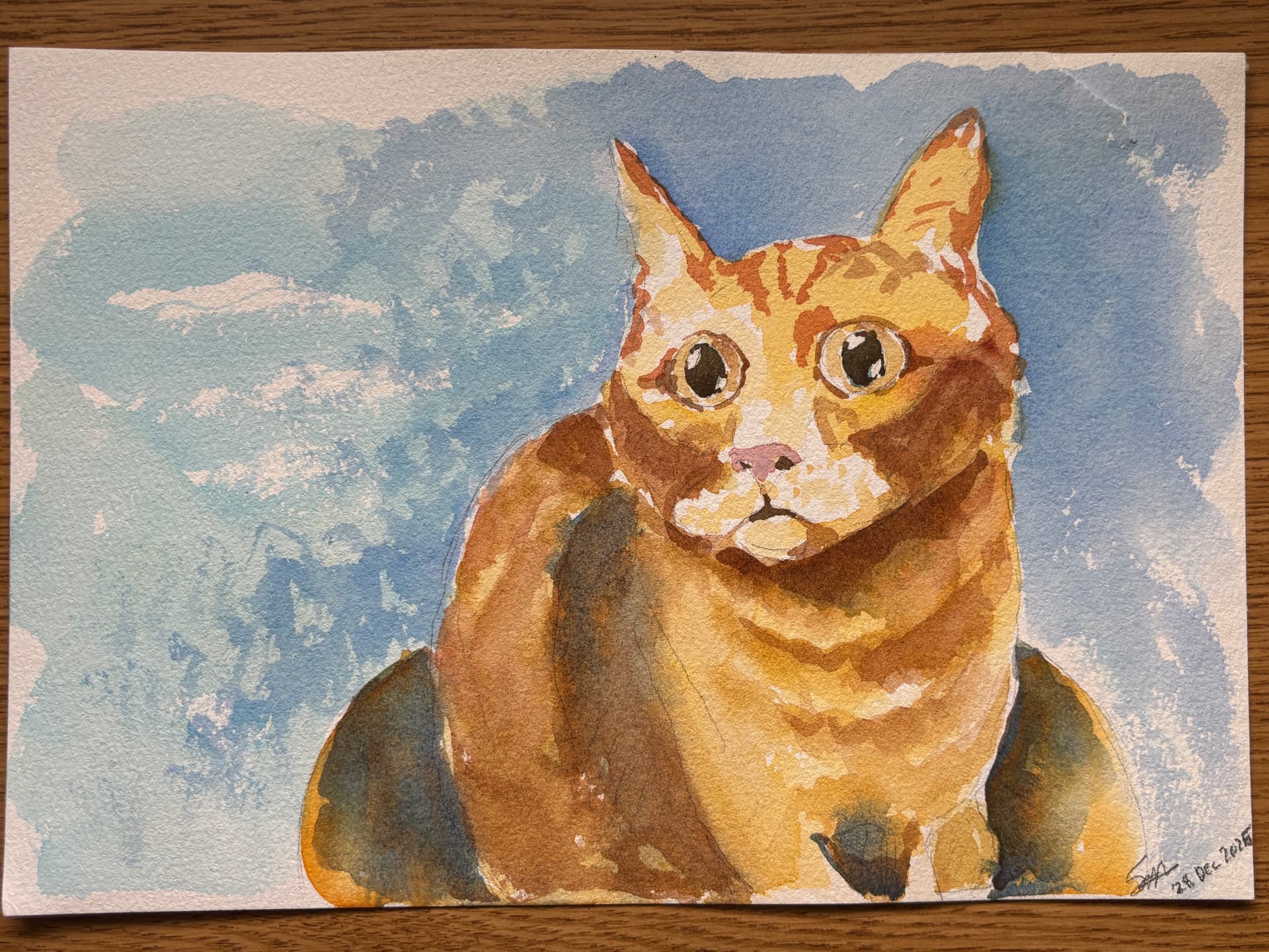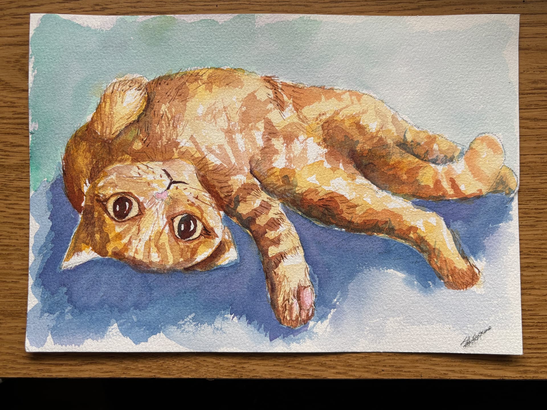 A few days ago, I took them back out and started just spending a little thoughtful time painting subject matter super close to me β my little orange tabby, Quilly!