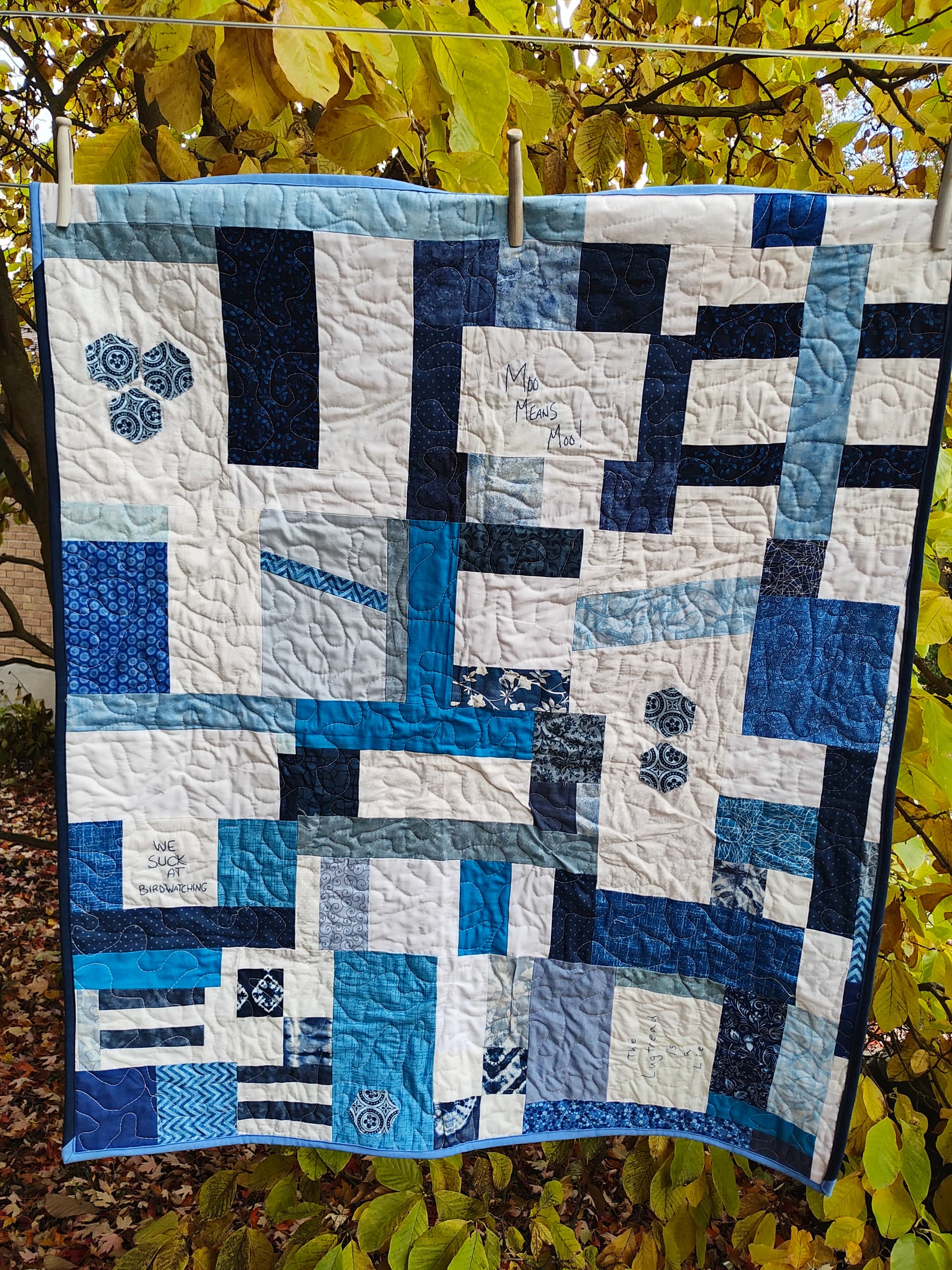 In 2015 D and I completed our first local shop hop. The theme was blue and white. And me, not being one who loves rules, made an improv quilt from the fabrics we collected instead of following the patterns. For reasons that I don’t quite remember now. I embroided three phrases as well.