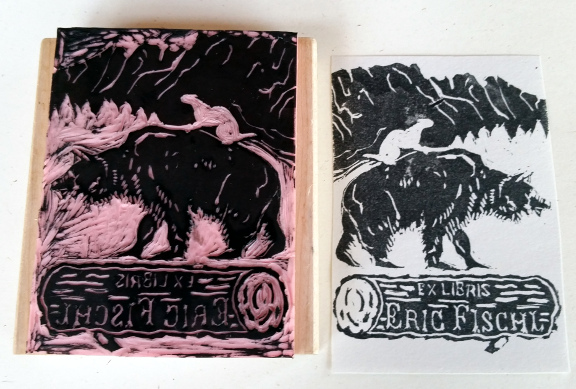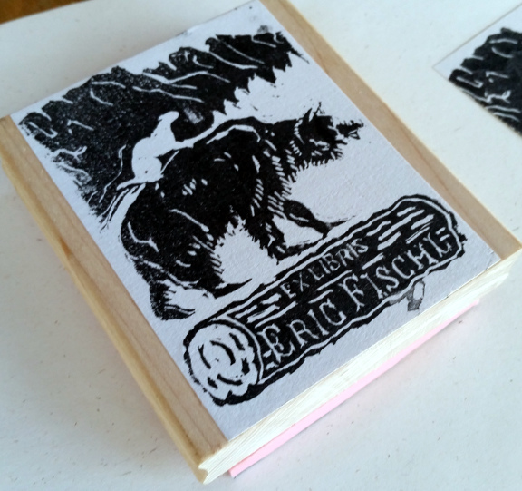 I made this for TheMisterT who has a big book collection. I had commissioned a weasel riding a bear drawing from a friend for another project for him and reused that for the stamp. The background is a notable mountain crag formation in our area.