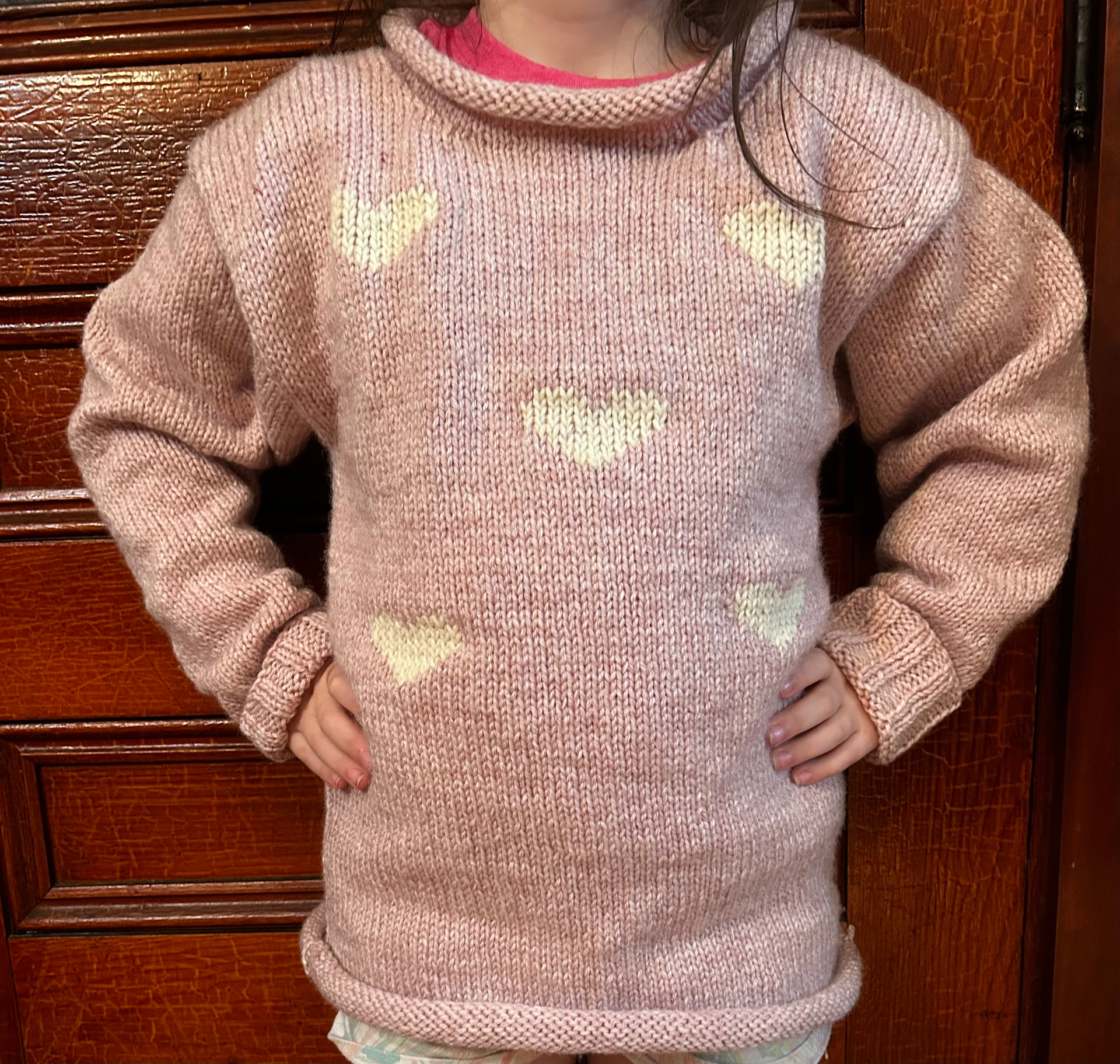 Kidlet’s latest sweater is finished and she loves it. She chose the yarn colors and the embellishment hearts which I added as duplicate stitch after construction and before seaming.