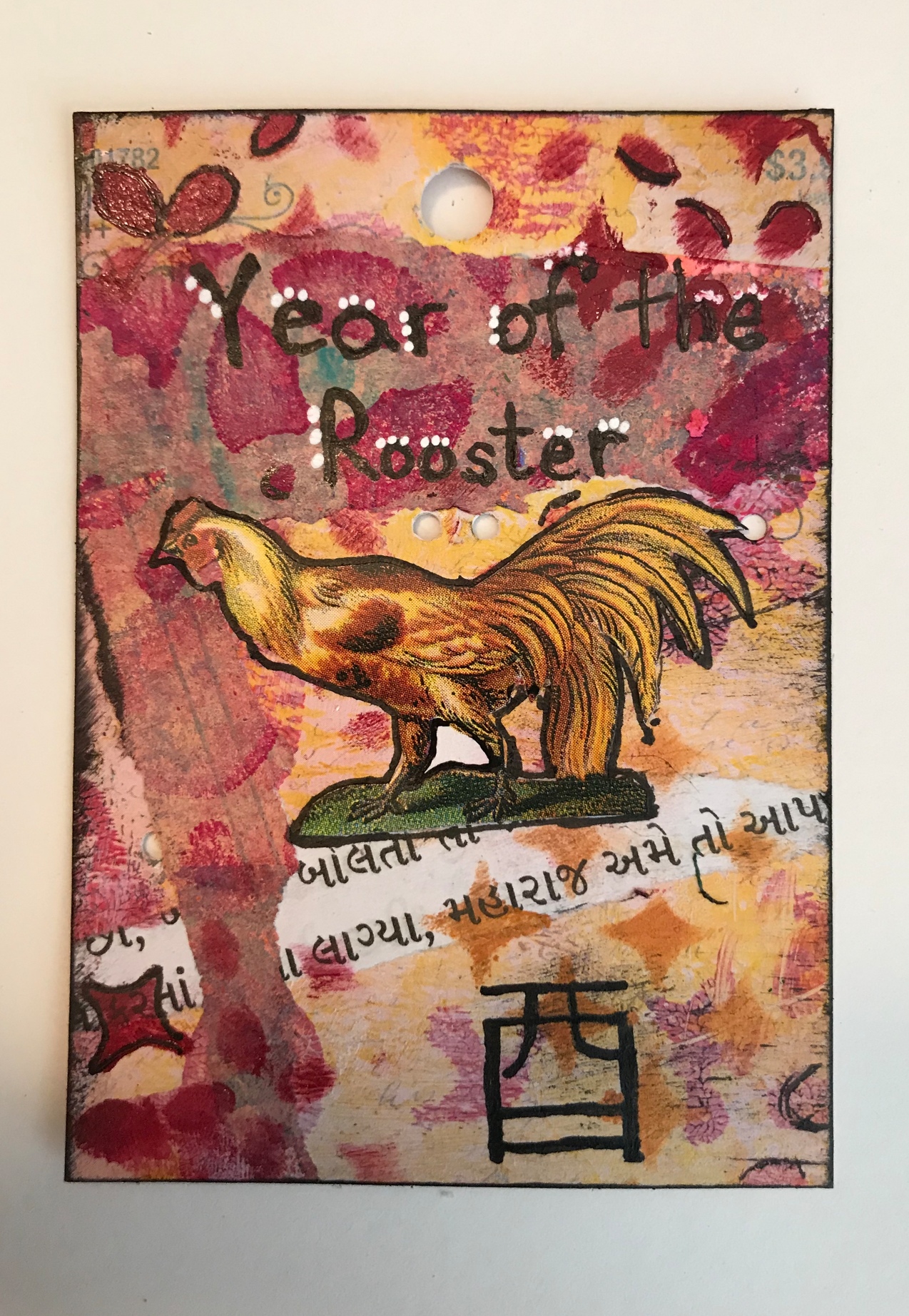 Zodiac - I chose the chinese symbol of the rooster. I made this on a tag that had charms attached to it. You can still see the holes. I thought it gave it some interest.