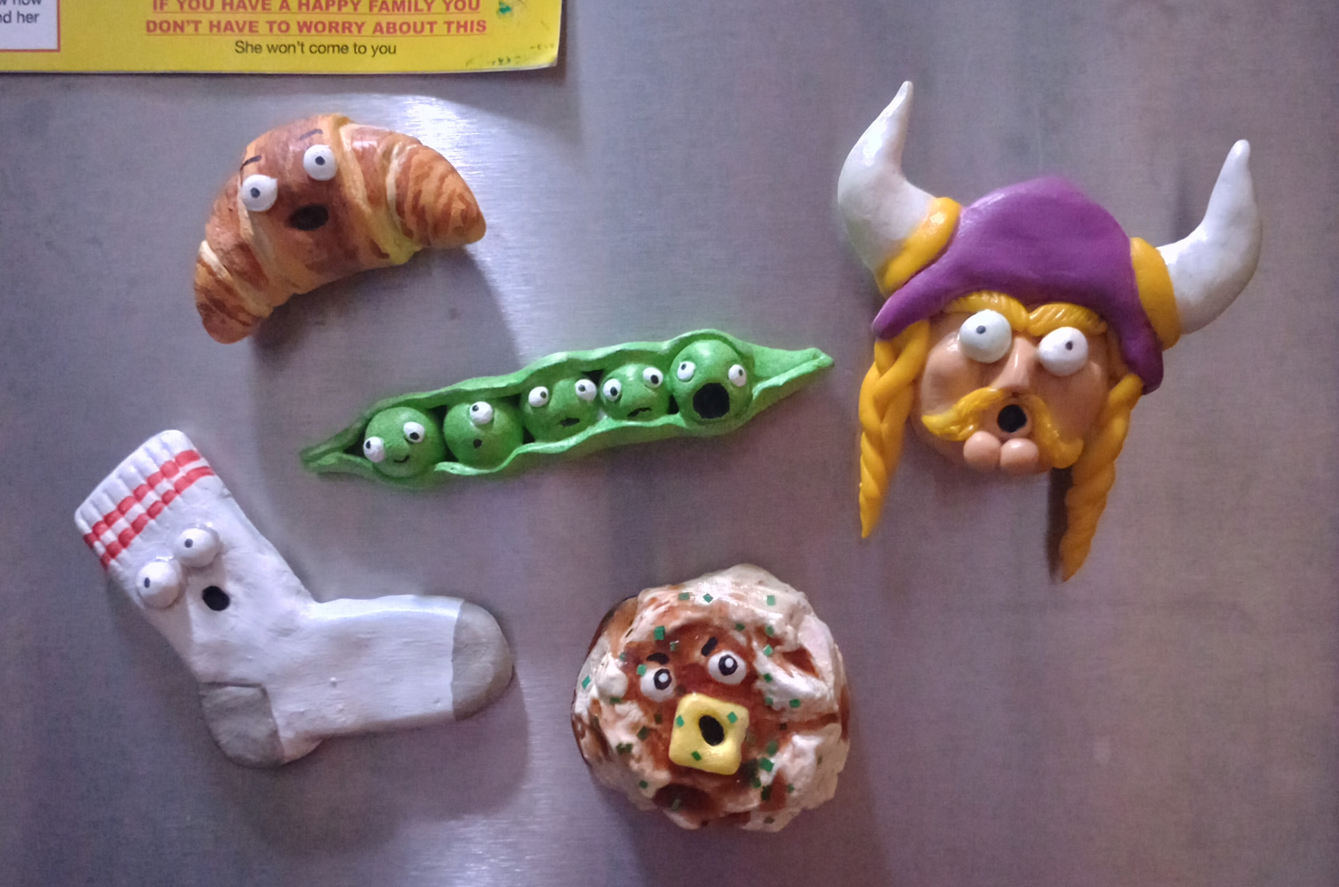 I made a Minnesota Vikings mascot magnet, a croissant, a peapod, mashed potatoes, and a sock. Our relatives are a little kooky so I thought they might like these freaked-out lil magnets. Lol.