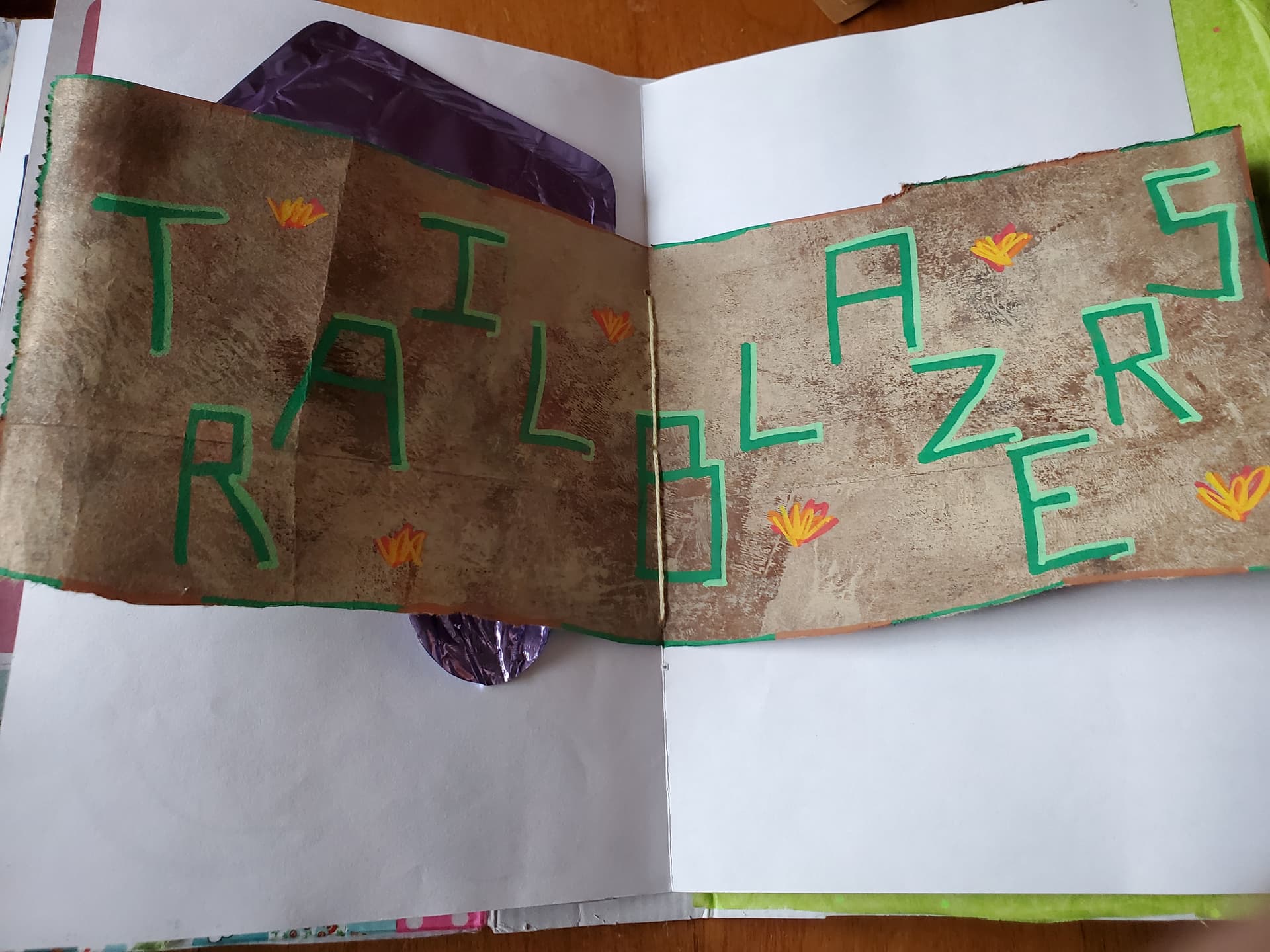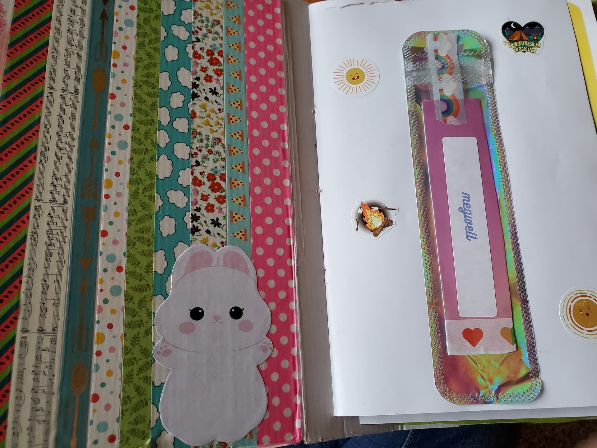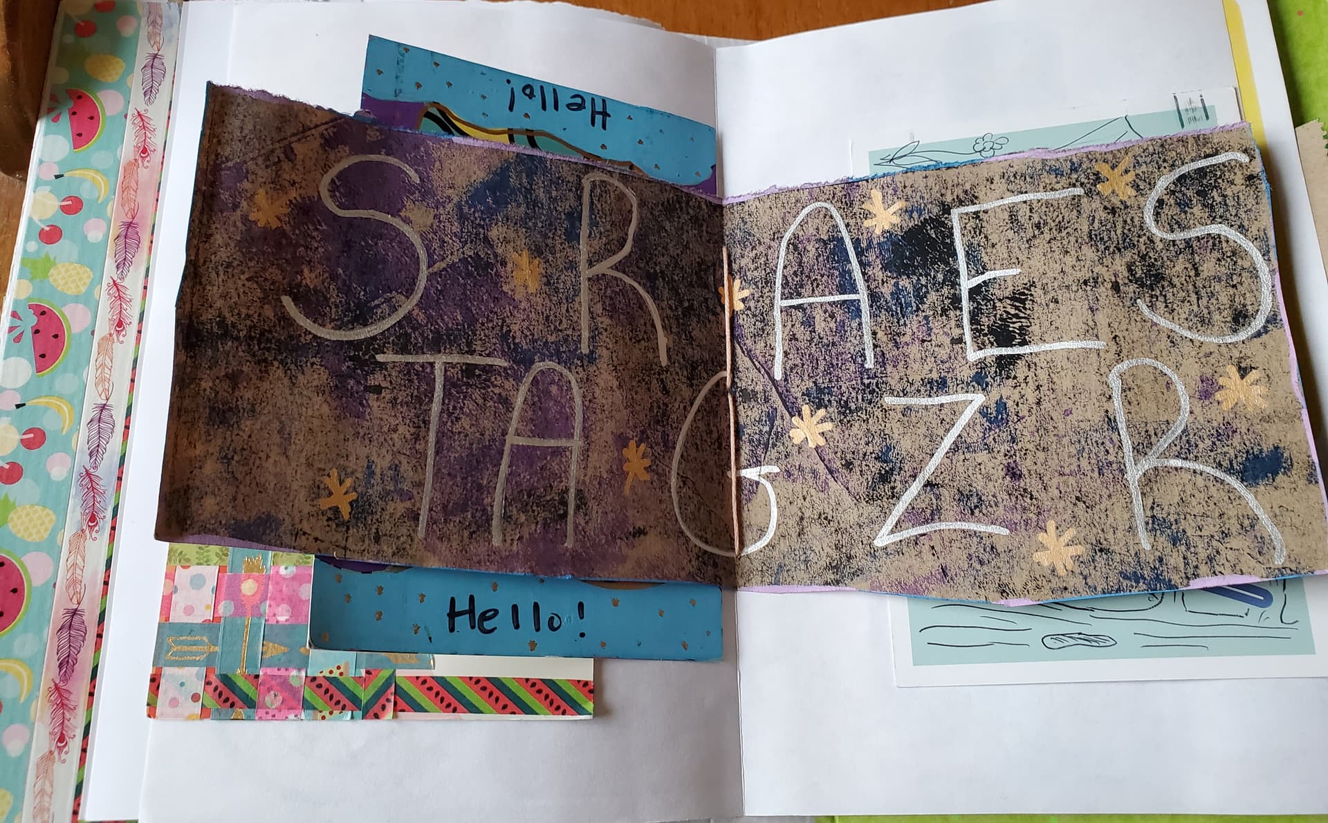 The cover is the rainbow box all the pre-camp stuff came in. The pages are the various camp activity explanations plus a couple of cabin flags from a capture-flag-prank (#CabinFingerPainters). They’re bound in with embroidery floss from the camp arts and crafts club kit and decorated with various other camp stuff, including altered postcards from @Mountains_and_Clouds, @bluebird, and @Smeddley.