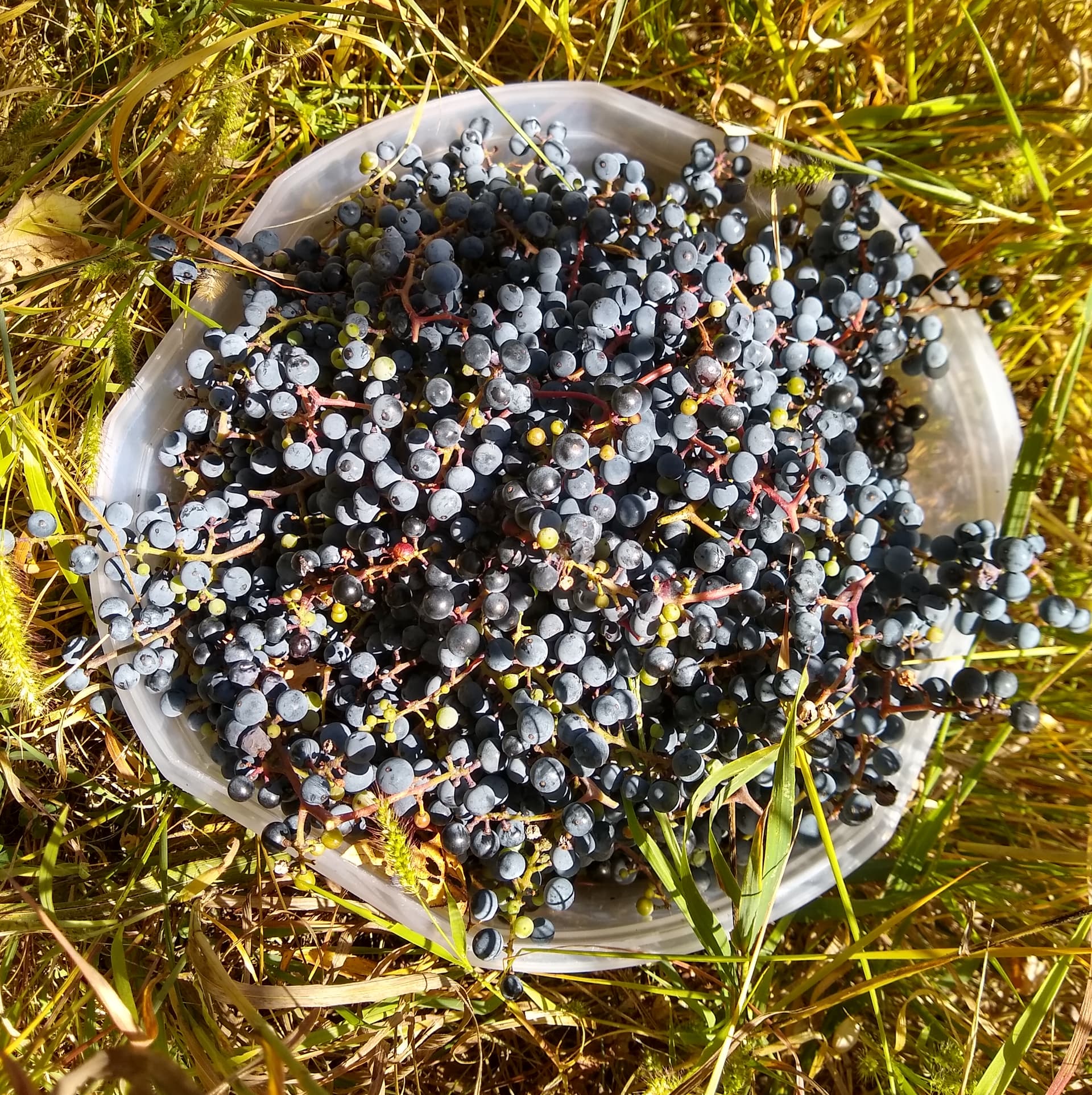 It was a delightful surprise to discover wild grape vines growing through the brushline on the back of my property (I grew up in the woods and never thought there’d be foraging opportunities in town - especially with all the gross lawn grass/turf covering my acre). I made a batch of wild grape jelly early in the season; the grapes were probably quite tart, but there was a lot of sugar in the jelly. Surprisingly, the birds didn’t swoop in and strip all the ripe fruit away when it was finally at its peak, so I decided to look into whether it was possible to make an easy “wine” with wild grapes.
