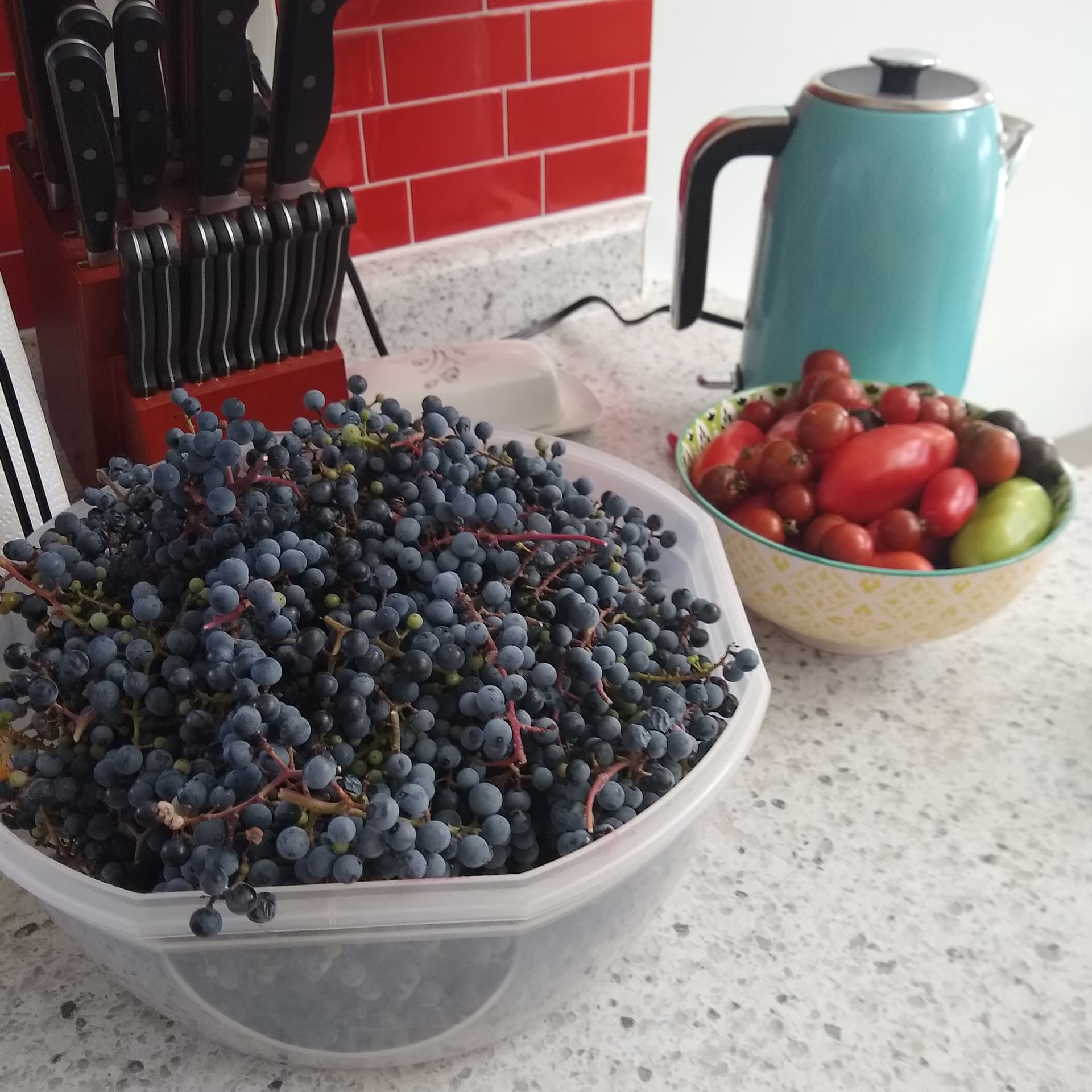 After cleaned and put in jars; just a quick rinse - don’t want to lose the yeast on the skins; recipe says put a couple tablespoons of honey - I had some local honey so this is 100% local wine!