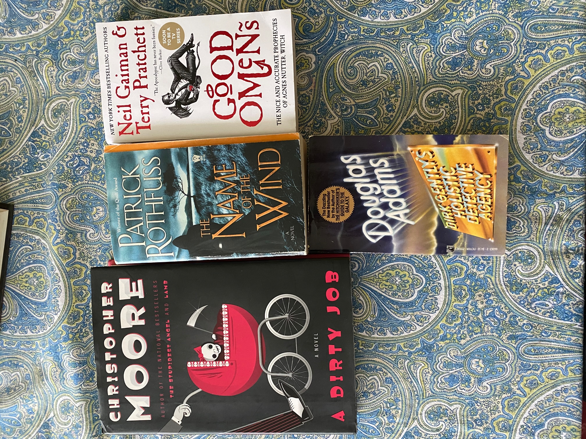 Lacey got me four books! People have been telling me for years that I need to read Good Omens and now I finally have a copy! And Dirk Gentlyâs is literally the ONE Douglas Adams book I didnât have yet! And itâs even the same publisher and style as all my others!!!