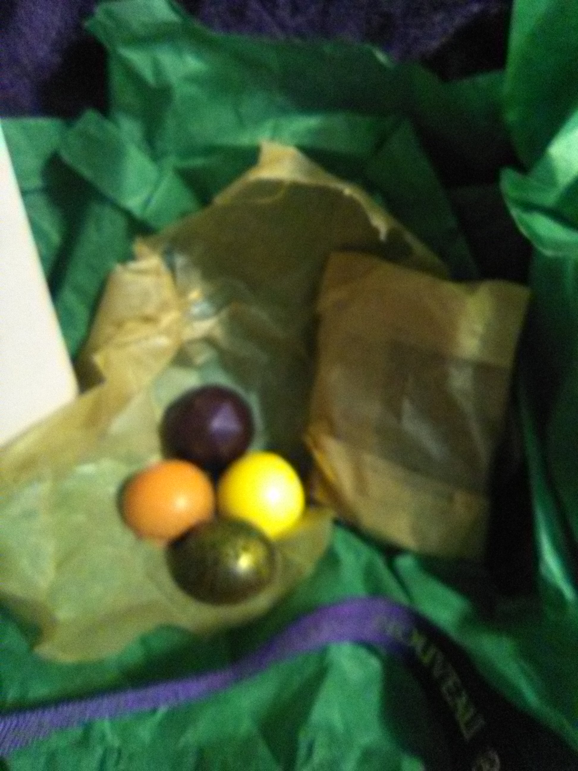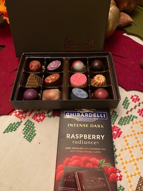 Those chocolates are from a little shop in the next town over. And, I have to admit, I picked them out based on appearance, not on flavor! There should be a card in the box that tells you what each one is.