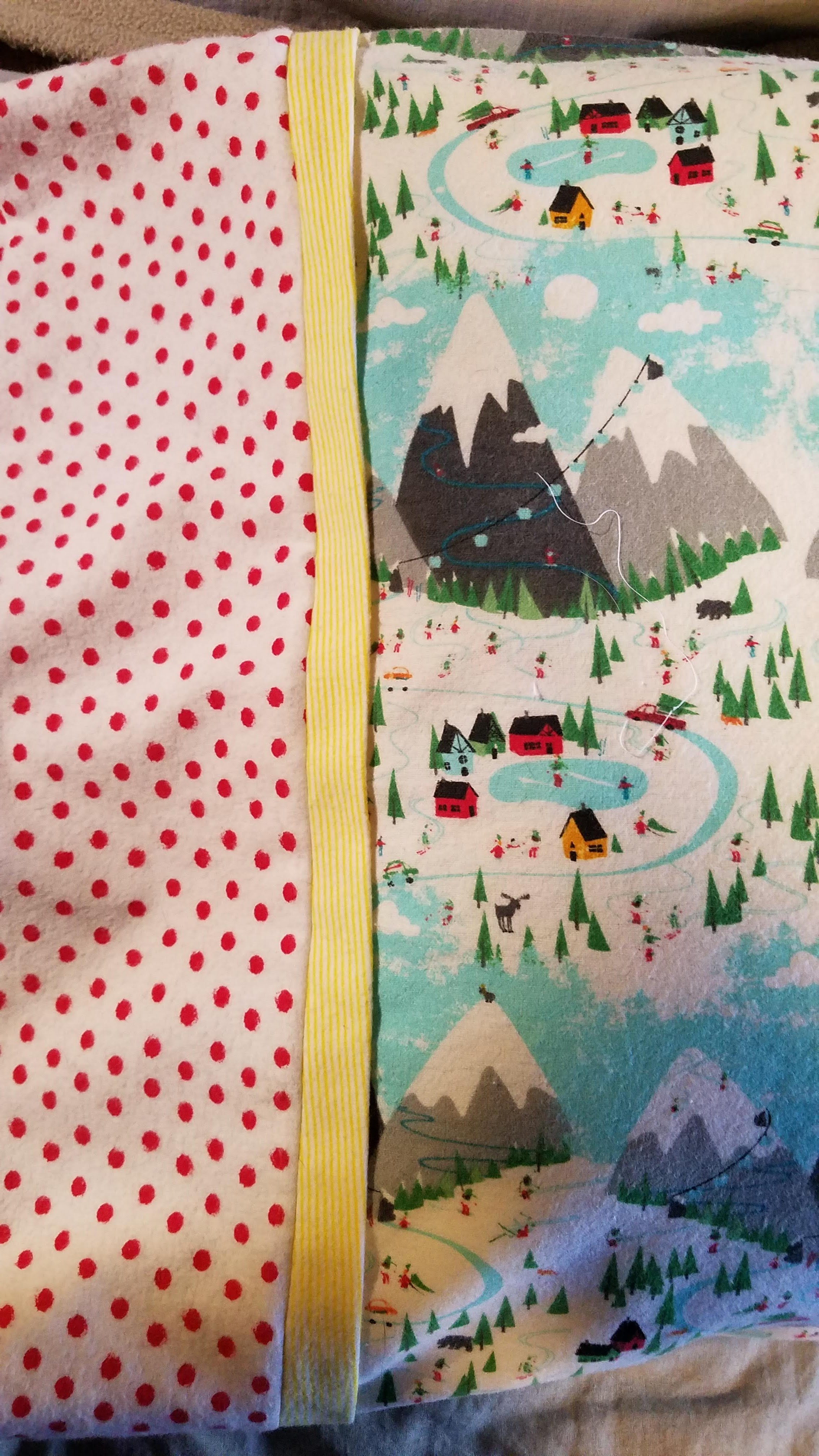 I was glad to find a cute winter print that included some grey that wasn’t holiday specific so we can use them for more than just December. And all the flannel at JoAnn was on sale so it was pretty inexpensive! I also bought the red dot, but the yellow striped was from stash. Please forgive the stray thread in the photo. How embarrassing!