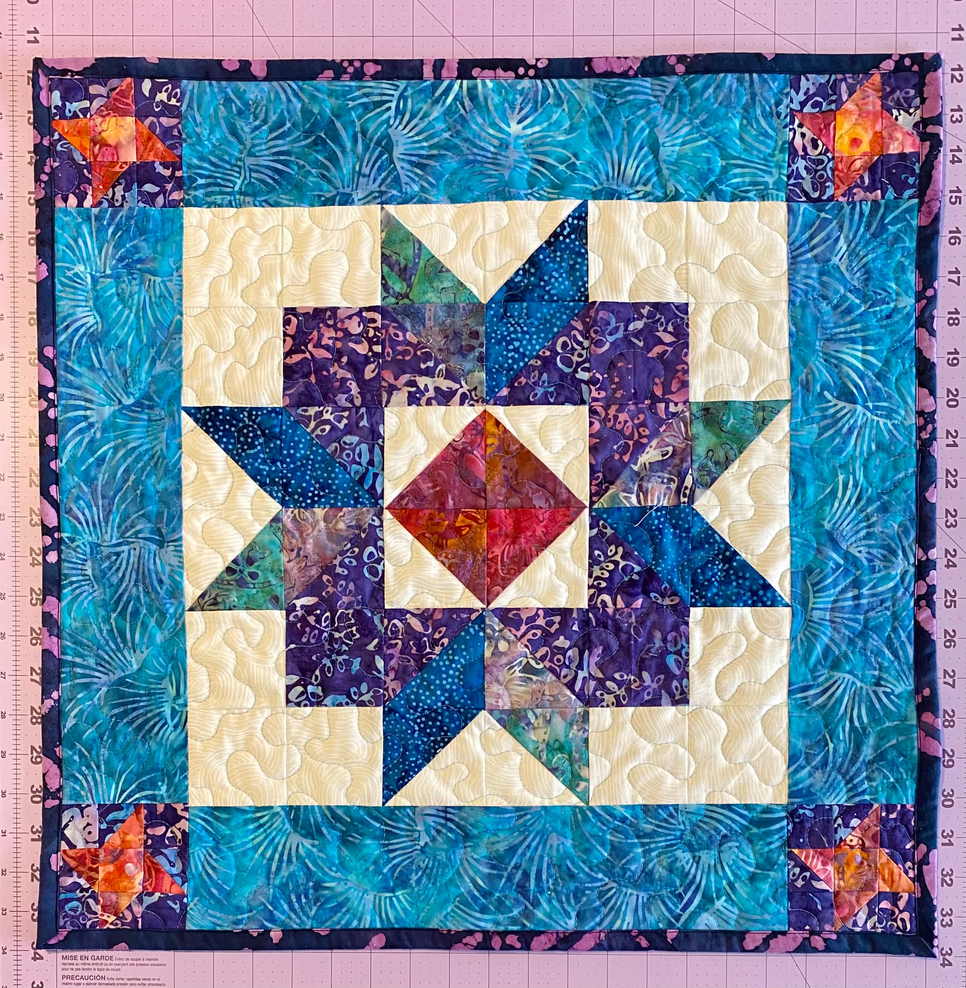 The fabrics are a 5-Fat Quarter bundle of cool batiks I bought at Joann’s about 2 years ago. The block is called Cordelia’s Garden, which I found in my copy of The Skill-Building Quick & Easy Block Tool. (I’ve tried looking for a free version, but can’t seem to find one to link to.) I made it in the 15" version, and altered it a bit to add the central diamond, so I could include the purple-orange fabric. After that I made mini 3" versions of a Friendship Star block for the corners. The whole piece is about 21” square. A quick and easy stash project to start the year off right! I’m already thinking of making a few more to switch out over the course of the year.