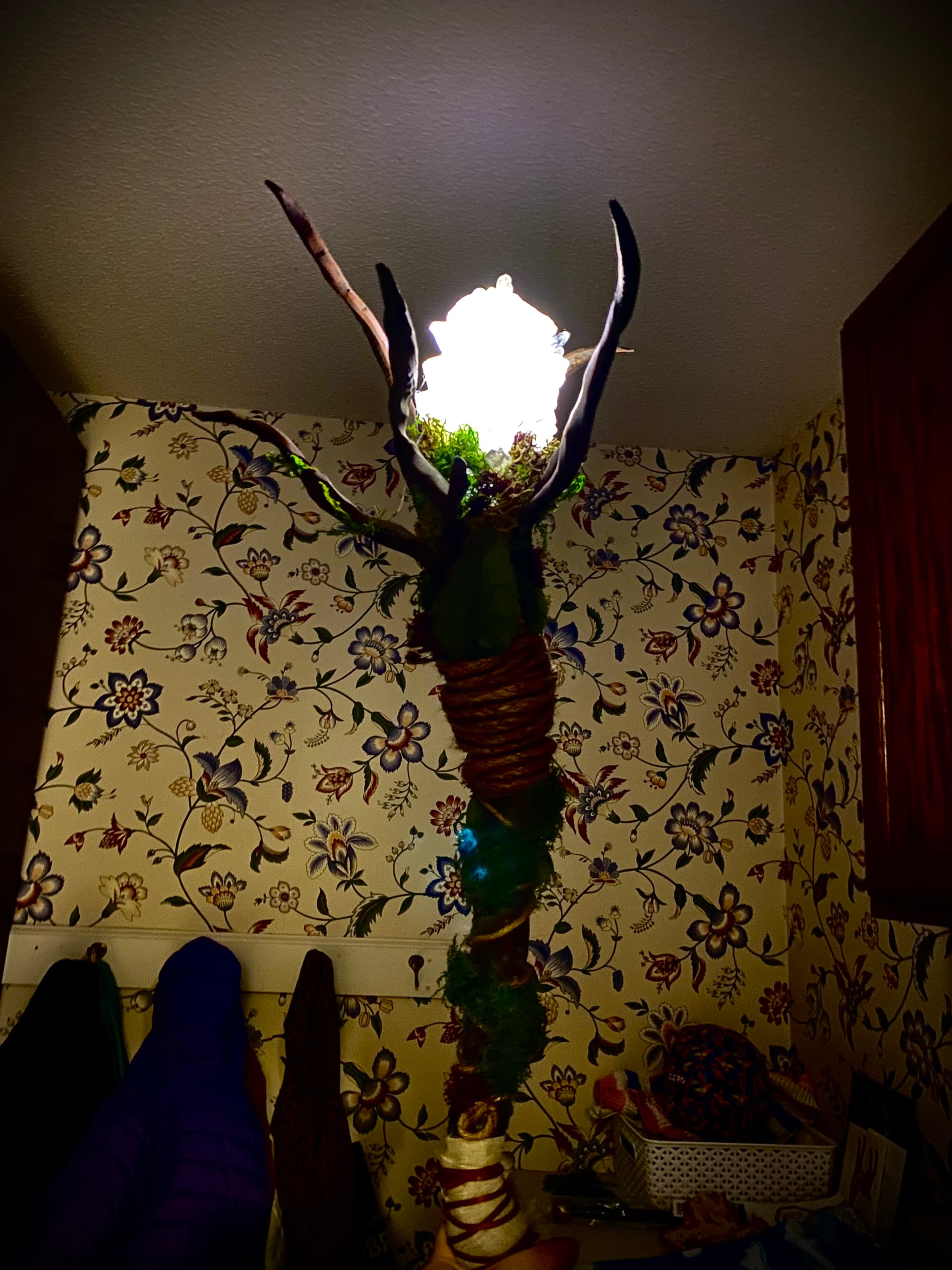 The branches at the top are made from bits of EVA foam, that I scrounged from some floor tiles we bought for Ada when she was learning to walk.  She kept pulling up the straight edge pieces to chew on, so we eventually took them away, and put them in the closet.  I cut them with kitchen sheers, and melted them with the heat gun too.