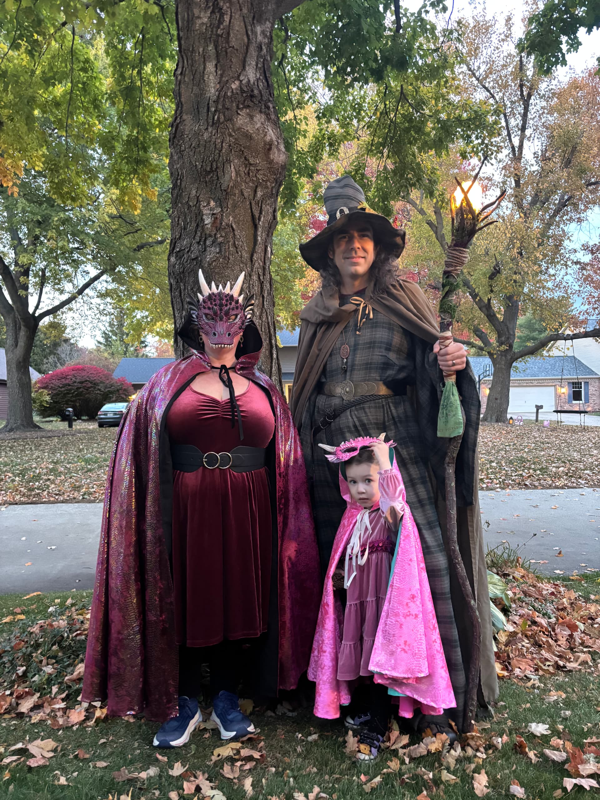 While I’m proud of the whole set of costumes, I think I’m most pleased with the staff. We trick or treated with our neighbors and a little girl from Ada’s preschool, who just moved to town. Her family is from Ecuador and Halloween was a new experience to them. But the kids all became fast friends, and they were able to see & follow Jim easily in the dark. His silhouette was unmistakable. Even when he was standing back from the doors, draped in shadow, people kept saying “Whoa! You’ve got a wizard!”
