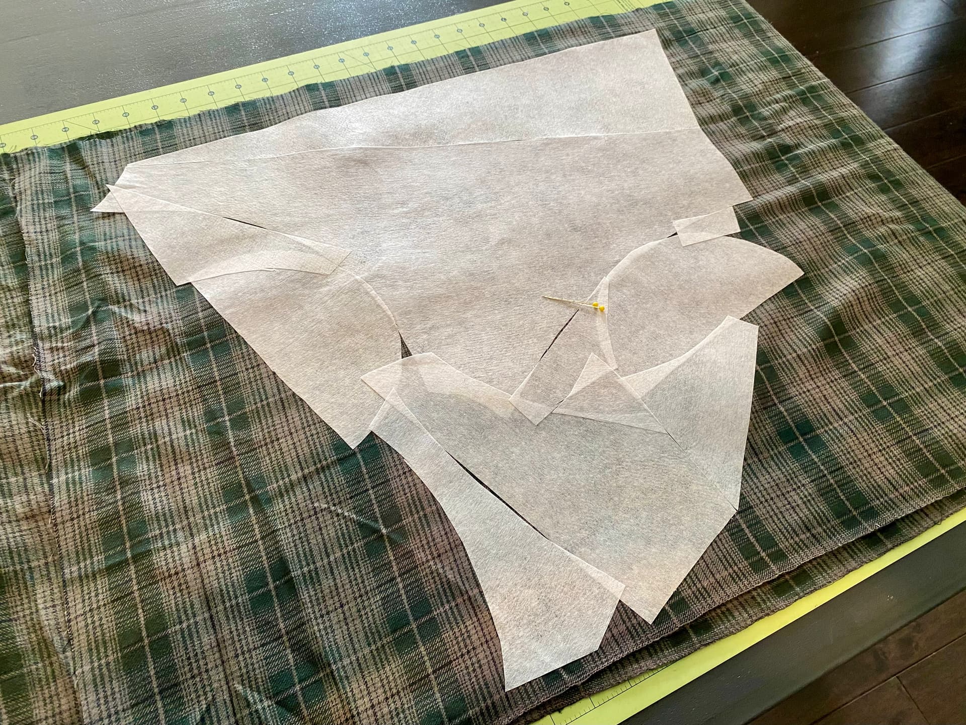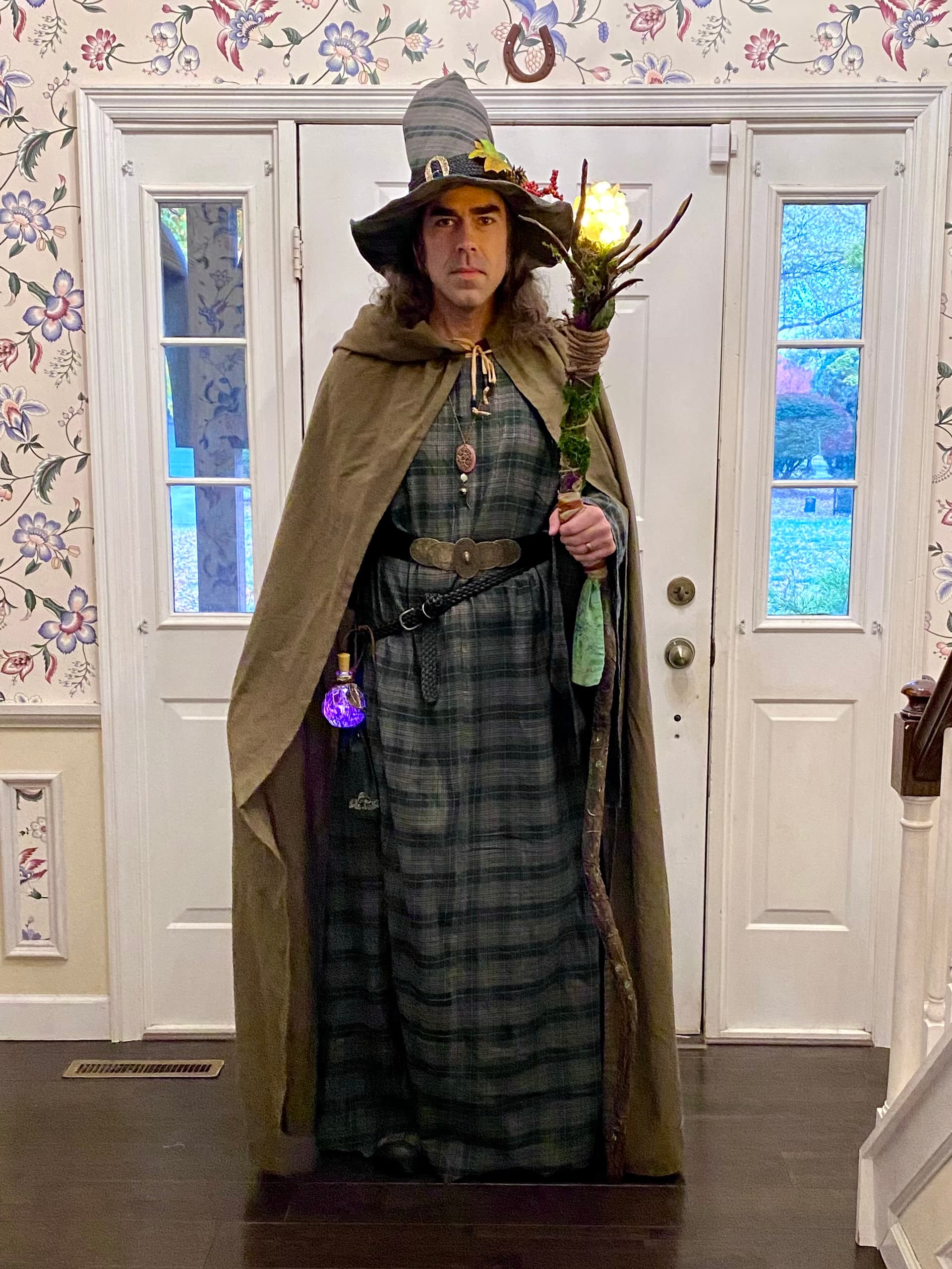 As all of this was going on, I was trying to figure out what to do with my husband.  He’s a good sport, and would wear whatever I handed him (see that previous Strawberry Shortcake costume to see him as Huckleberry Pie) He’s also a big fan of D&D, so I thought he might like being a D&D type character.  Jim works from home, for a tech company, and can wear what he likes.  That usually means a tee and a cozy flannel.  He has long black hair streaked with grey, and as he walks around the house, both the hair and flannel shirts billow out behind him.  Because of that, I often call him my “Flannel Wizard”.  After doing a reorganizing of my fabric stash this summer, I found an 8-yard cut of green & tan flannel, that I’ve had since about 2002.  It was time to use that sucker up. The color gave forest vibes, so I decided he’d be a Forest Flannel Wizard.