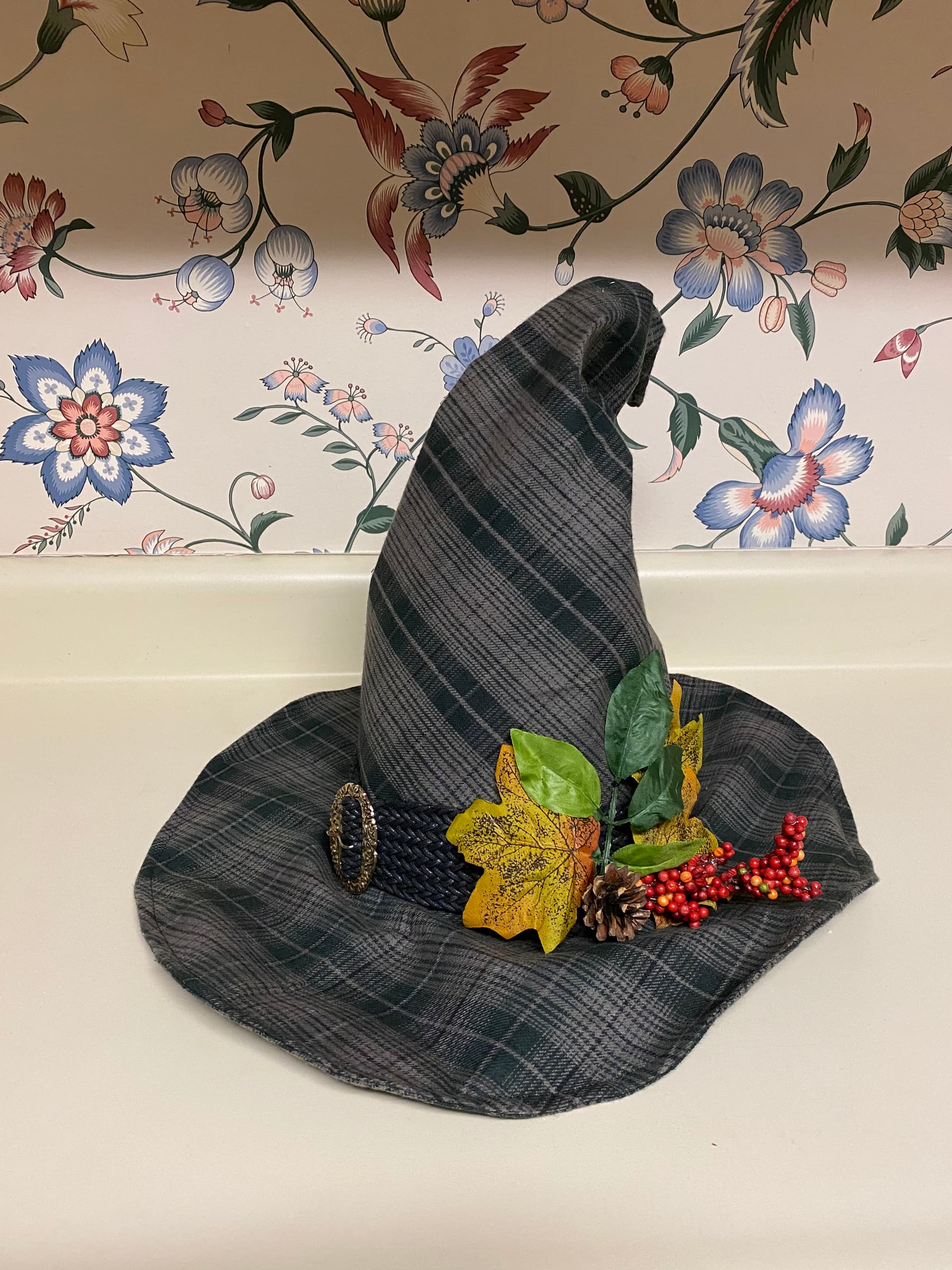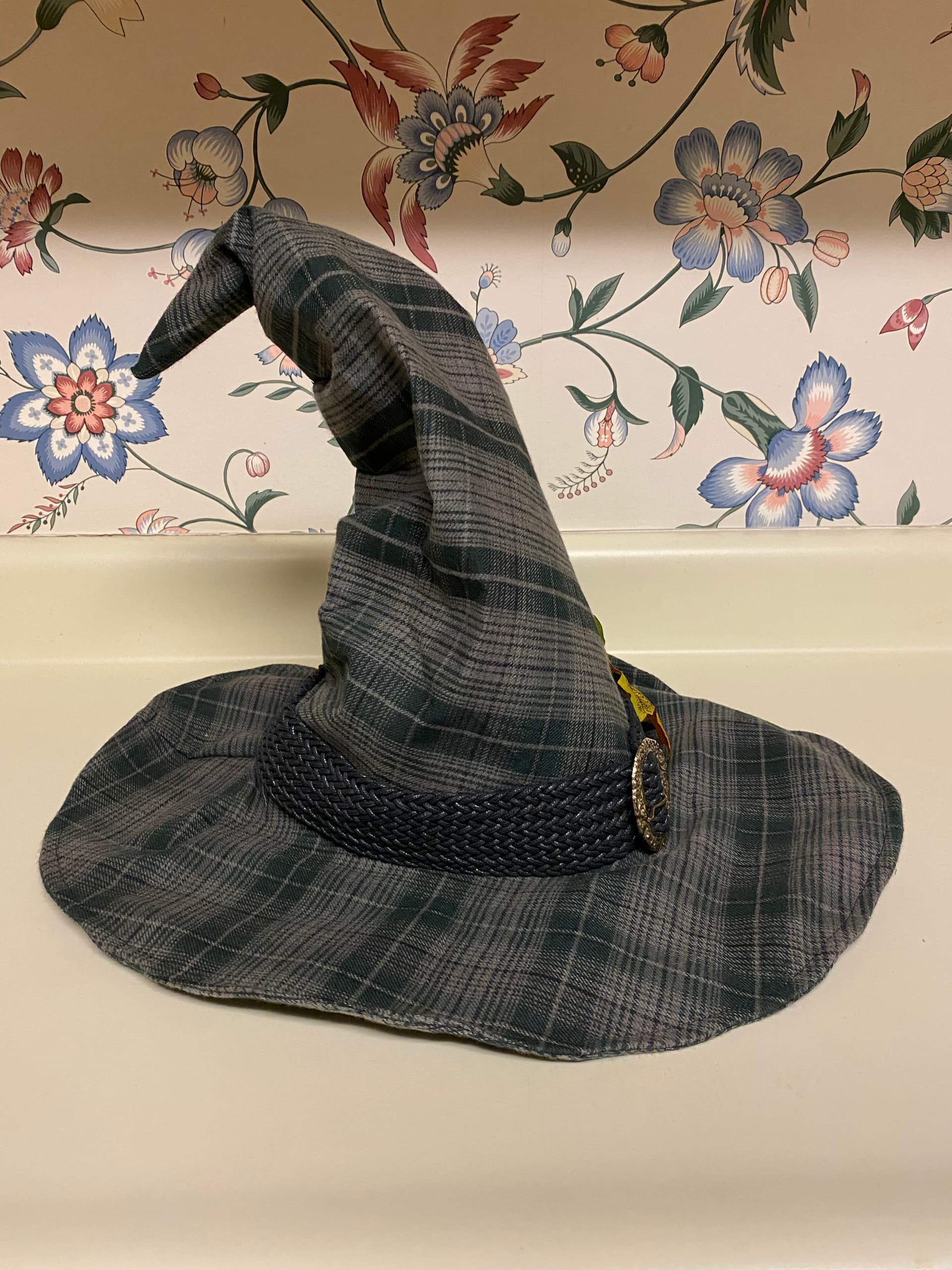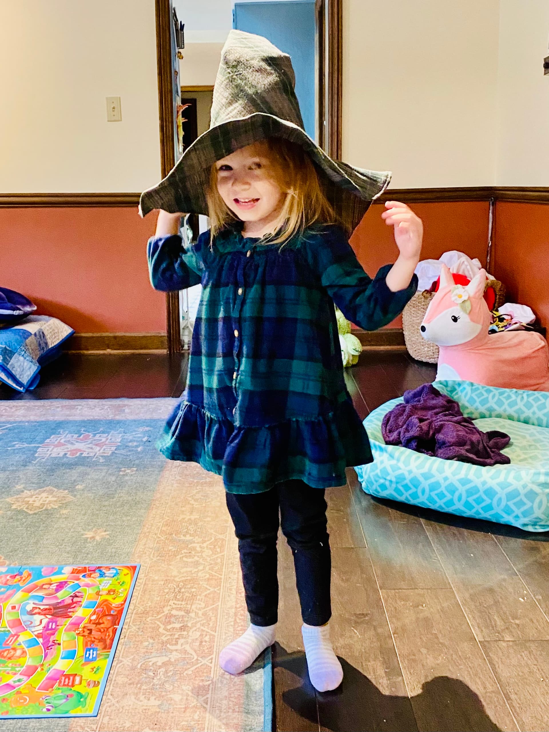 A wizard just isn’t a wizard without a hat.  Since it’s been decades since I last made one, I watched some fun YouTube tutorials, and started with a basic hat.  But I seem to have been distracted while drafting the pattern, and ended up making the crown too small to fit me, let alone Jim.  Oh well, it became another dress up piece for Ada, and I started again.