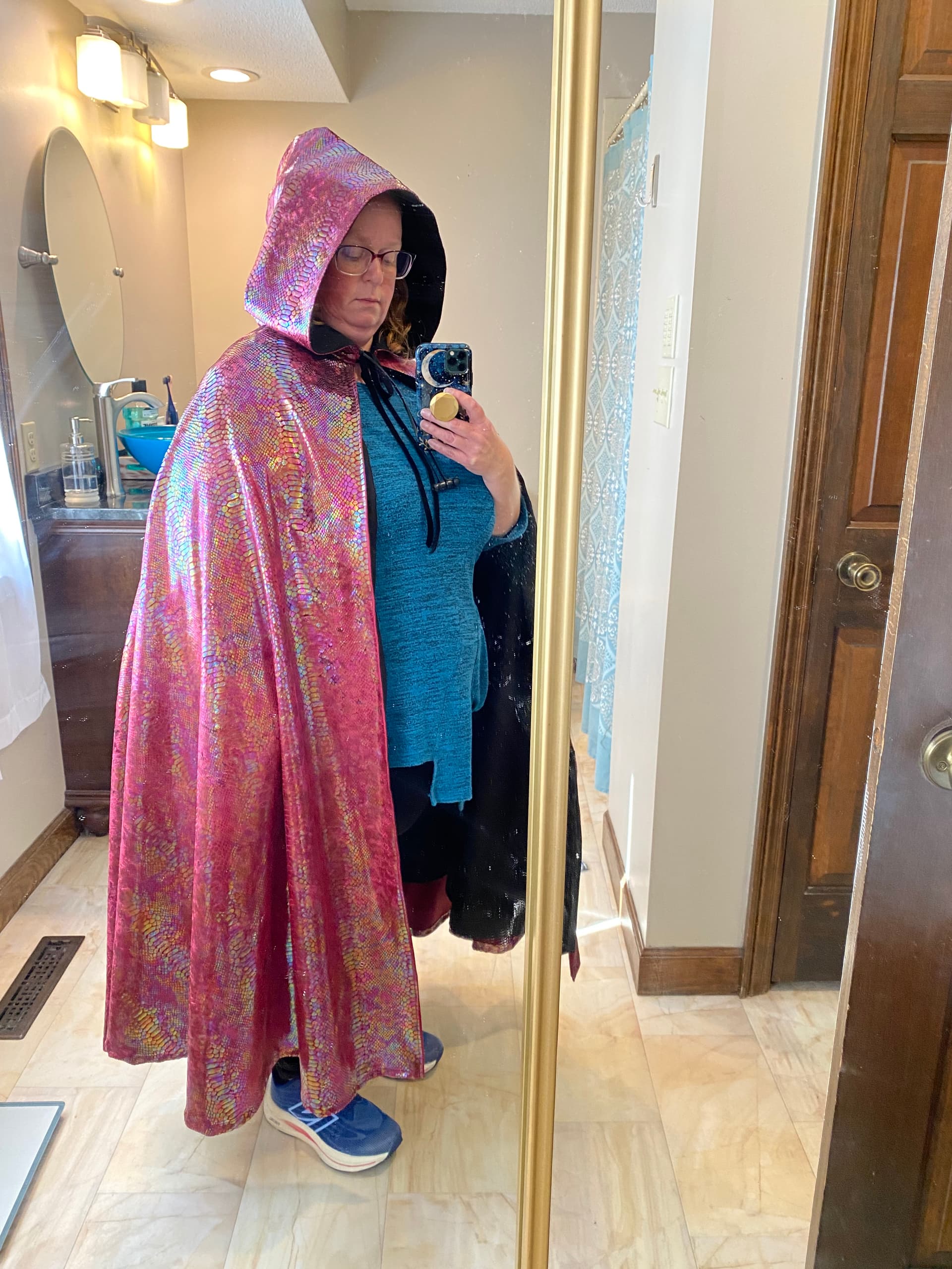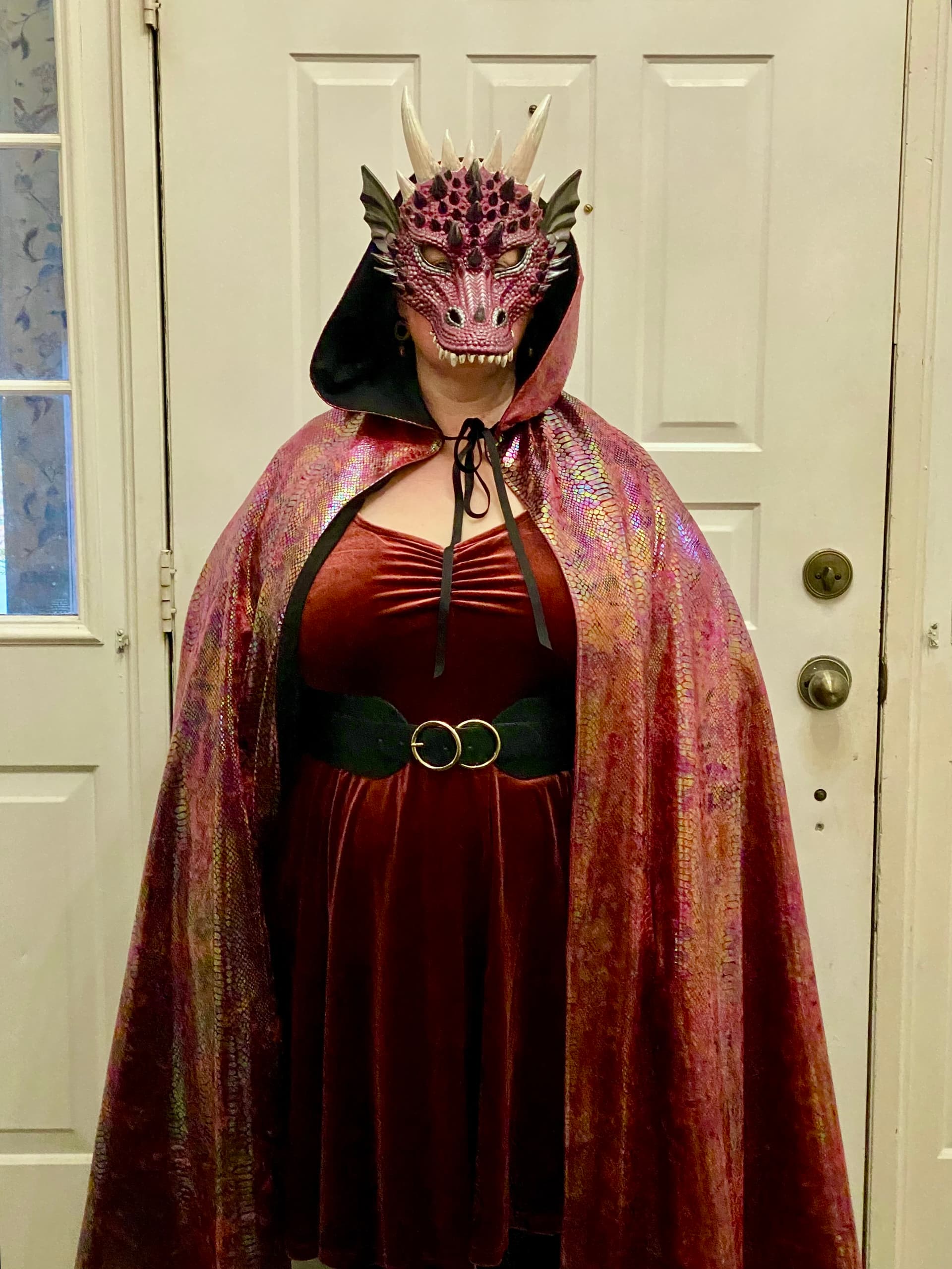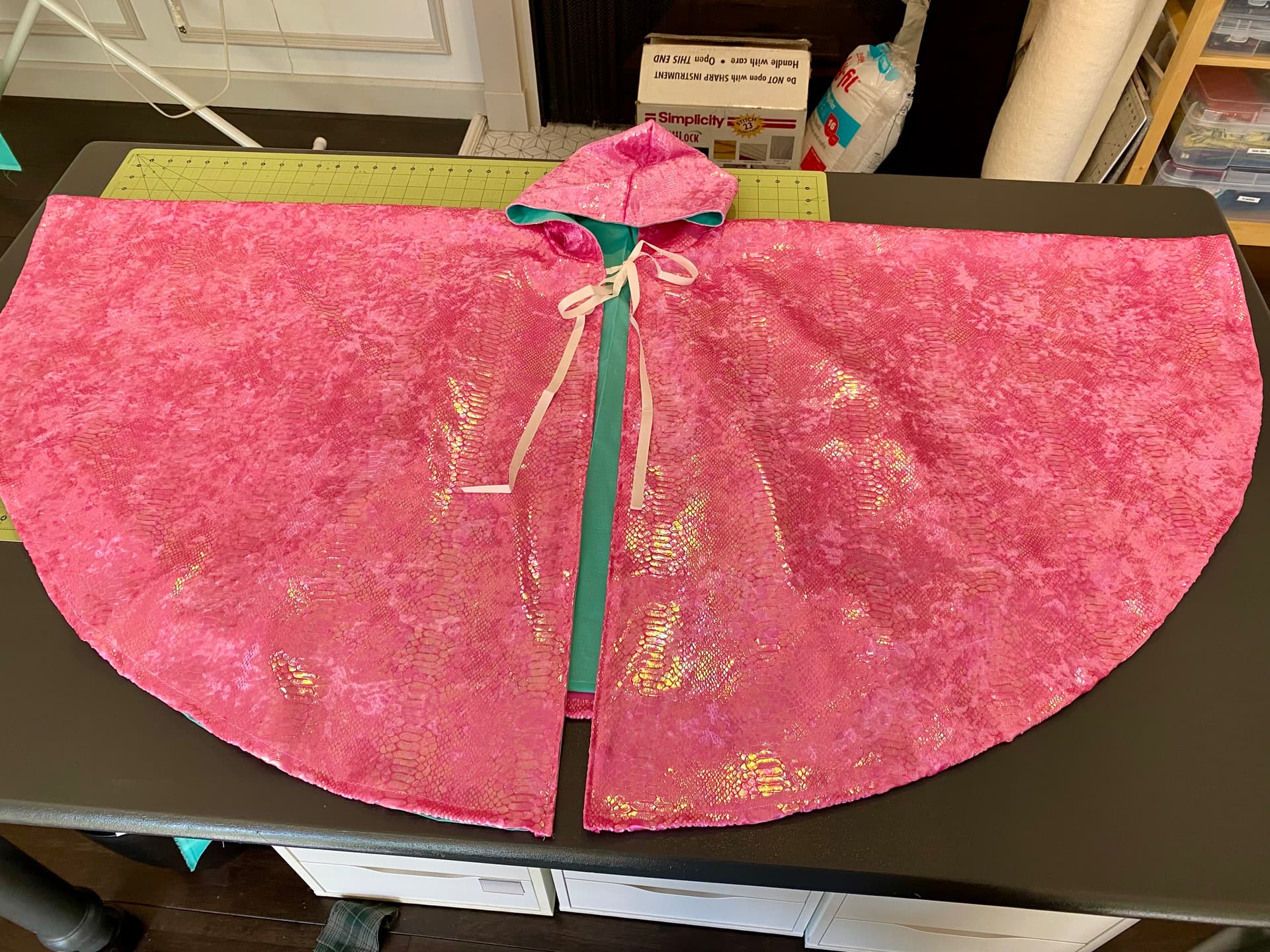 I found the fabric for the cape on Etsy. It’s an iridescent dragon scale print on crushed velvet. While I wasn’t planning on dressing my husband & I up, I did notice the seller also happened to have it in burgundy… It’s a full circle cloak with hood, and I lined it in some turquoise quilting cotton from my stash.