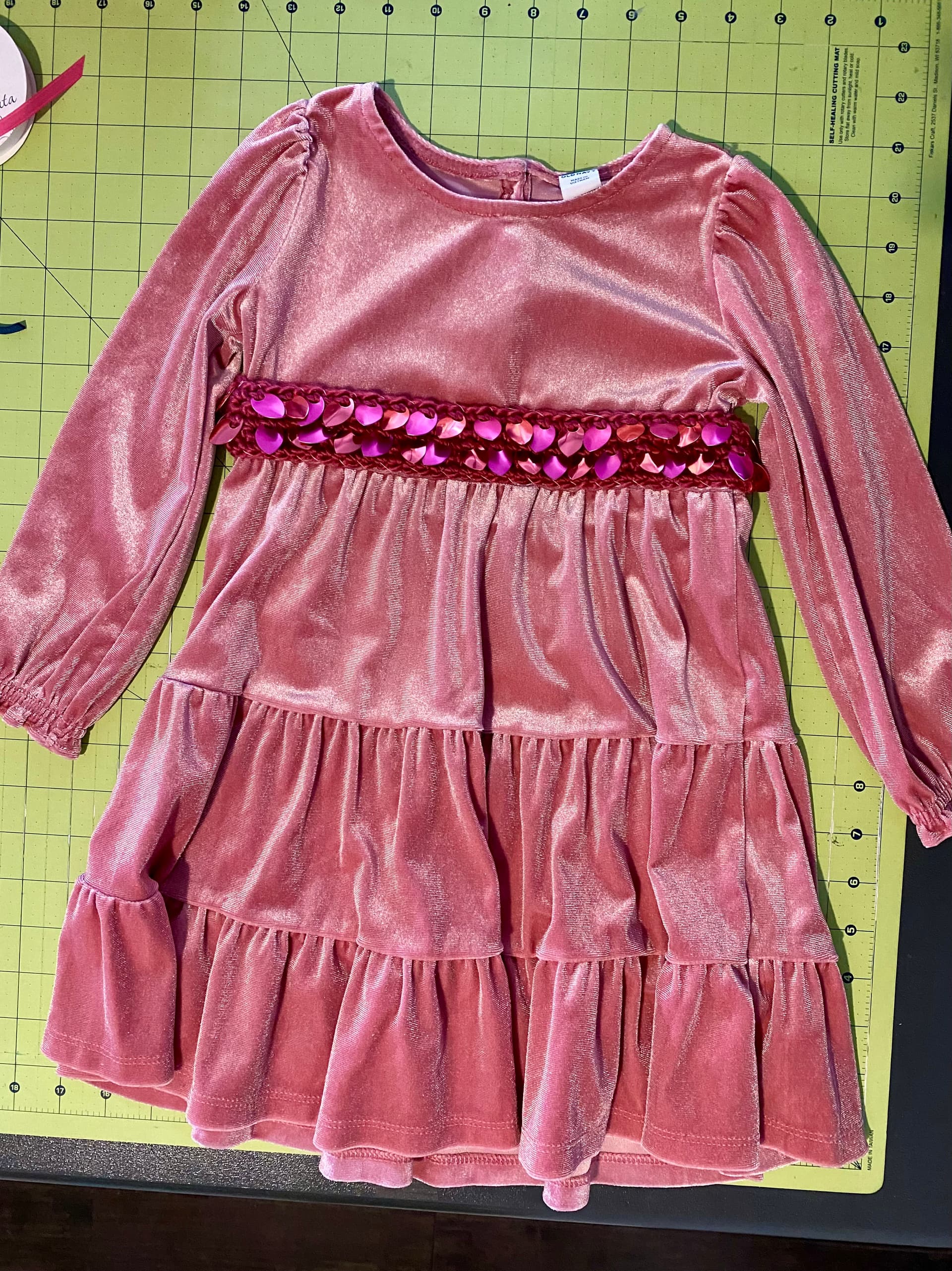 I poked around on ThreadUp (an online secondhand shop) and found a lovely pink velvet long sleeve dress for Ada to wear for just $6. It would keep her warm, be comfortable, and she could wear it as regular clothes after Halloween. ThreadUp also had a brand new burgundy velvet dress from Torrid, in my size for just $12. It looks like the Universe is telling Mama to be a dragon too! For Ada’s dress, I added a row of crochet and aluminum dragon scales that I usually use on dice bags. The scales go just past the side seams, as I didn’t want to make it too heavy. I whip stitched the crocheted piece onto the dress, so it can be easily removed, and I can add ribbons for her to wear it as a belt later.