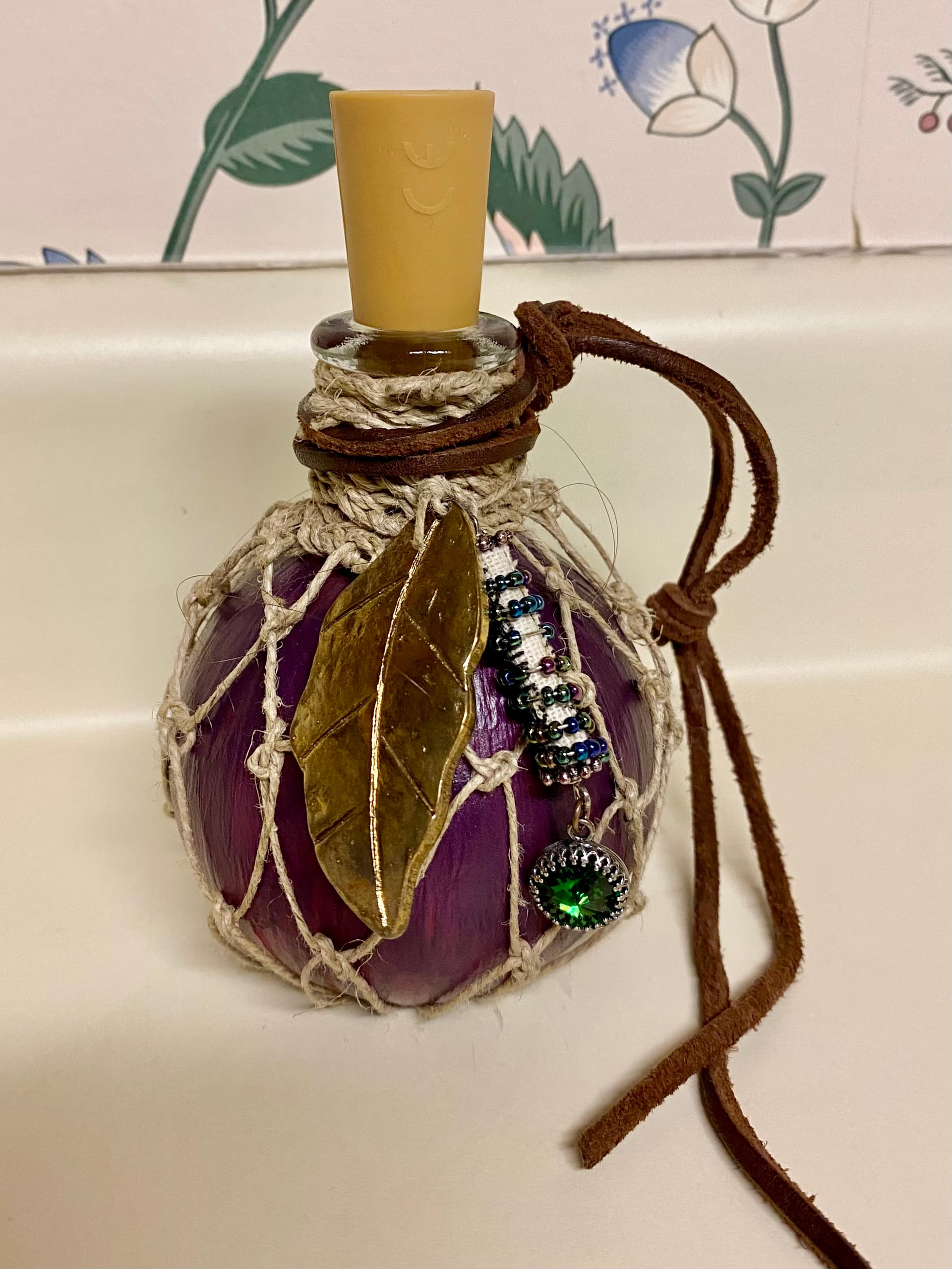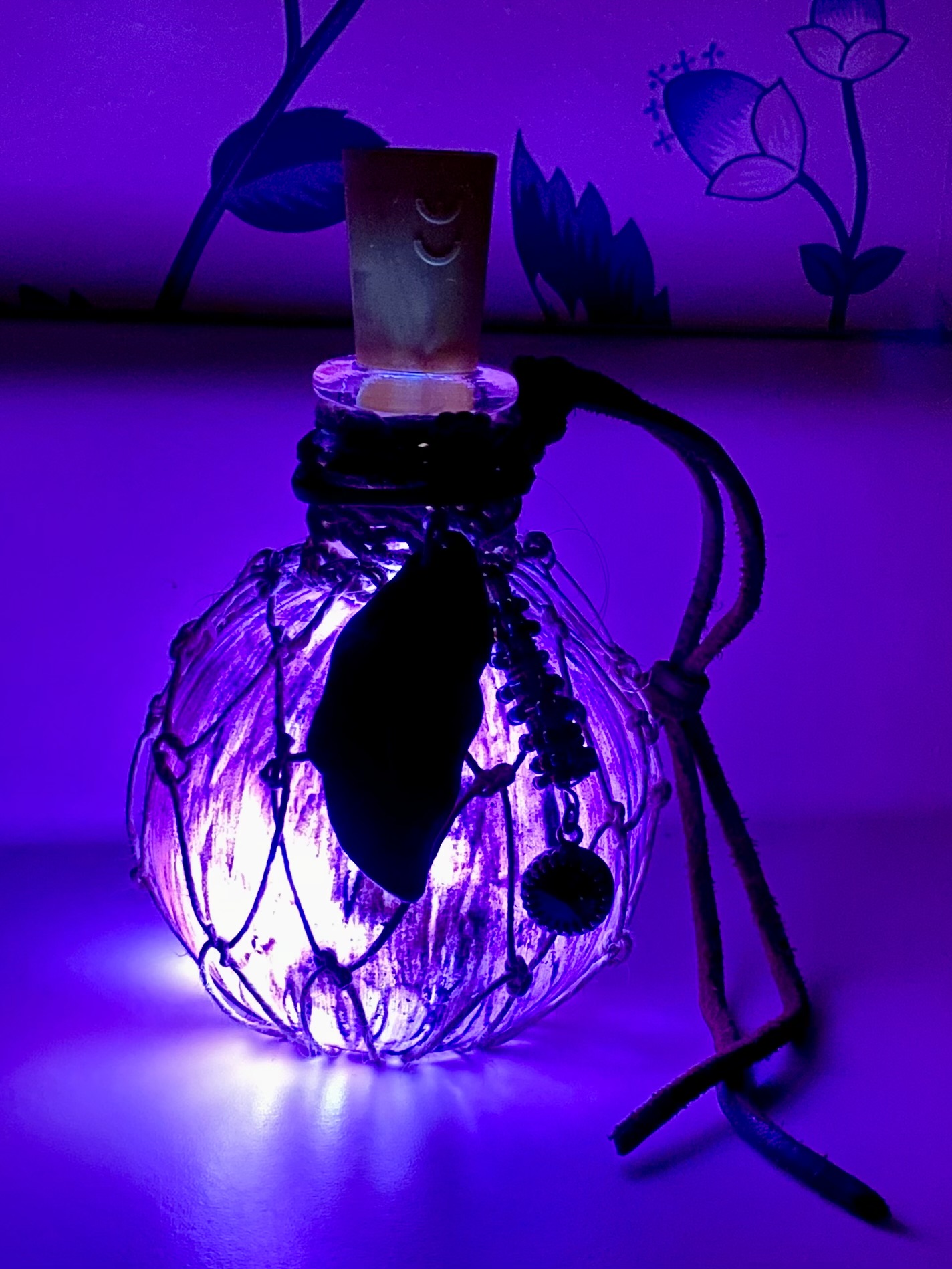 I bought a few blank potion bottles at Michael’s, and painted them with a mix of acrylic and mod podge, then decorated them, and added a bottle cork string light to help it glow.  The twine net was just made up as I went along, and the bits and bobs on the bottle all came from my jewelry making stash.  I started another potion, but didn’t have time to finish it.  Here is the purple one, all lit up.  It looked great, glowing on his belt last night in the dark.
