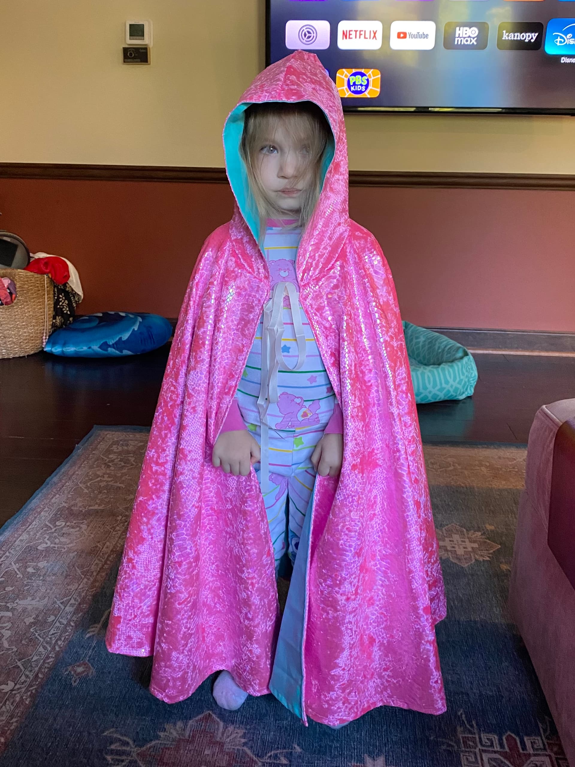If I could go back and do it again, I think I would make it a half circle instead, as it was a TON of fabric, and it’s pretty heavy for a preschooler, but she did keep it on all through her party, and all trick or treating.