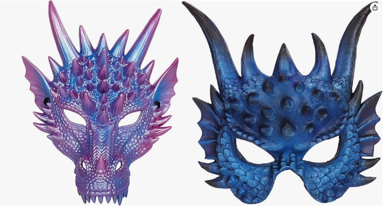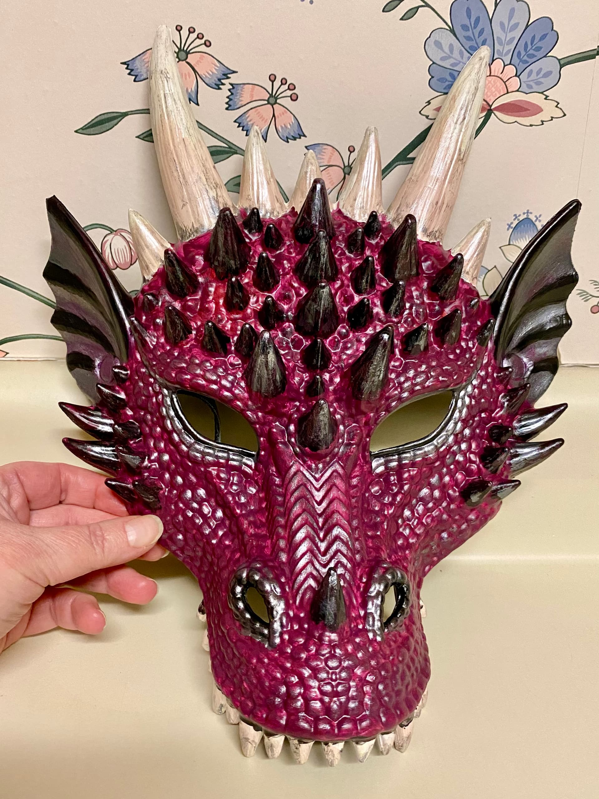 For our dragon faces I started with masks from Amazon. They are both a lightweight foam, and since I knew I’d do some painting to whatever I bought, I just went with whatever colors were least expensive from the same masks. I picked a full mask for myself, and a half mask for Ada, to help keep her comfortable.