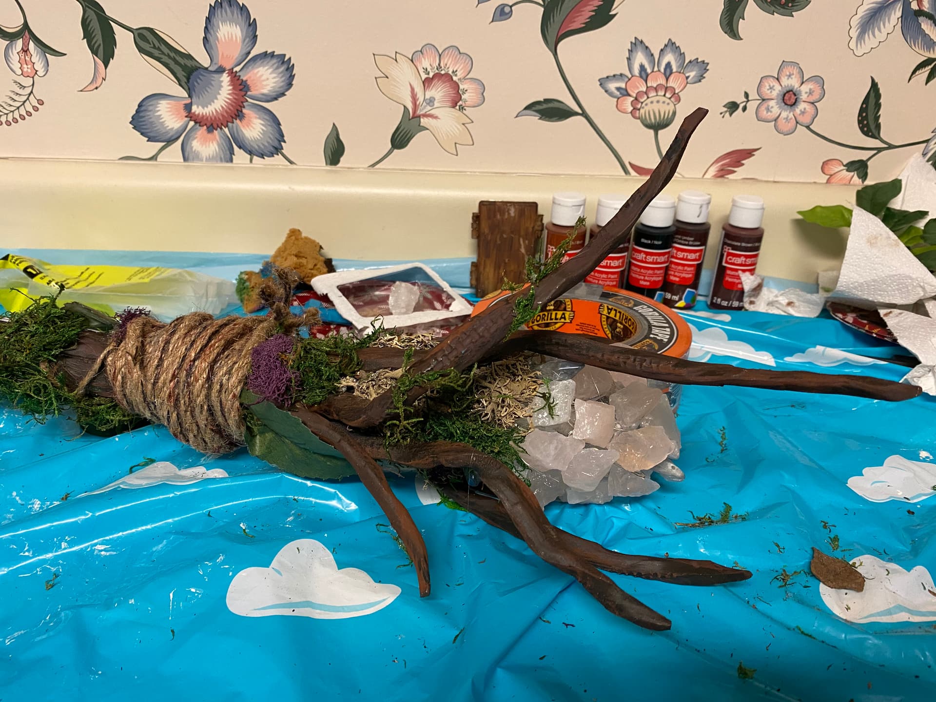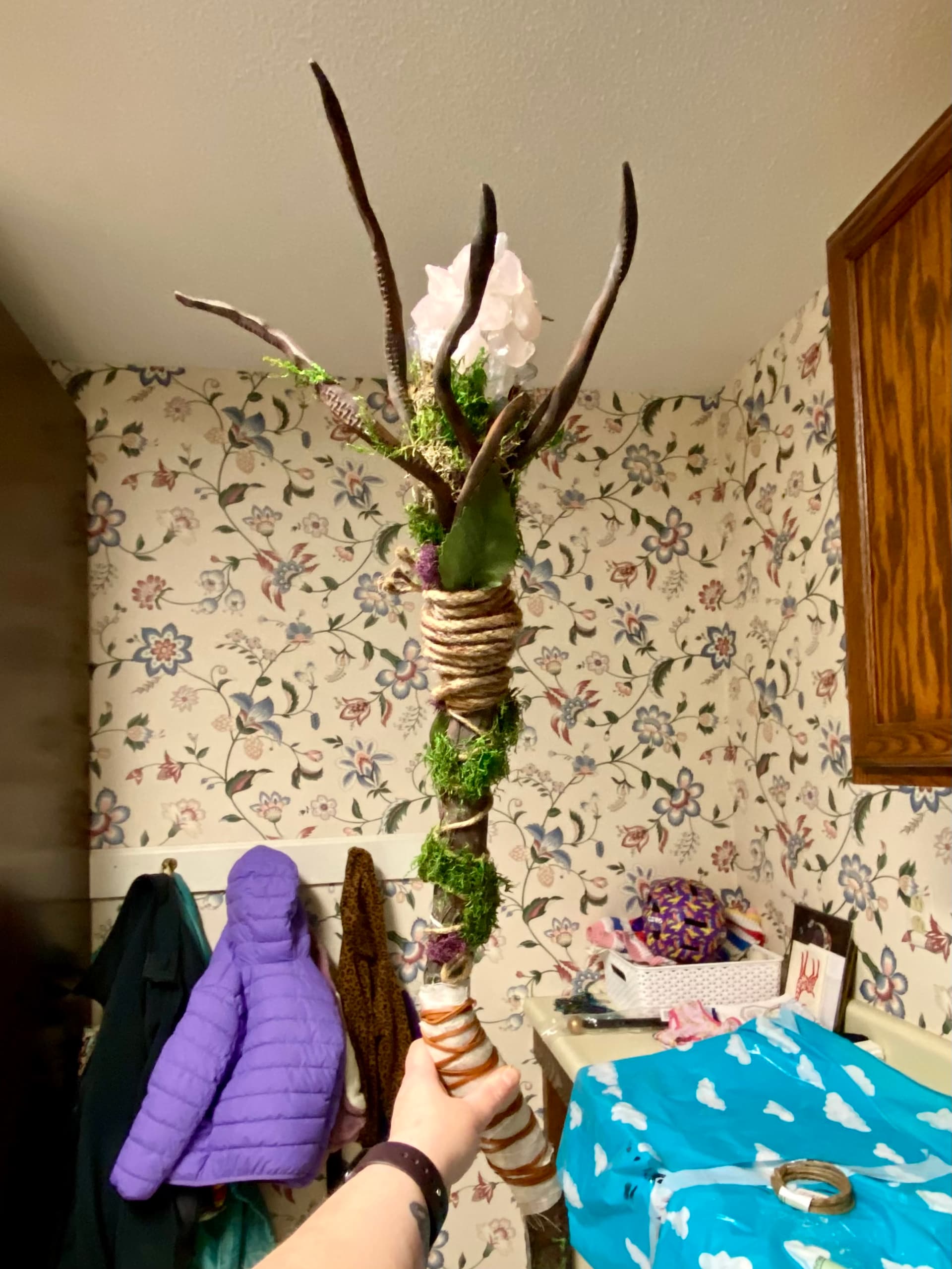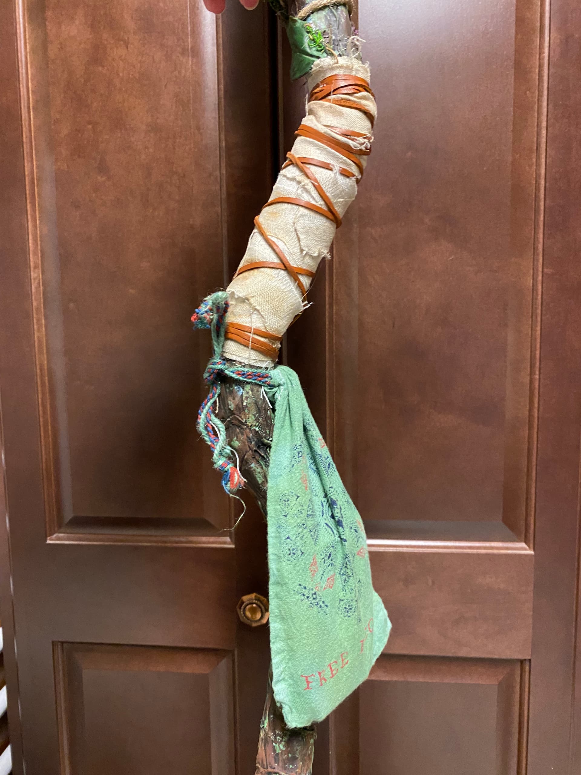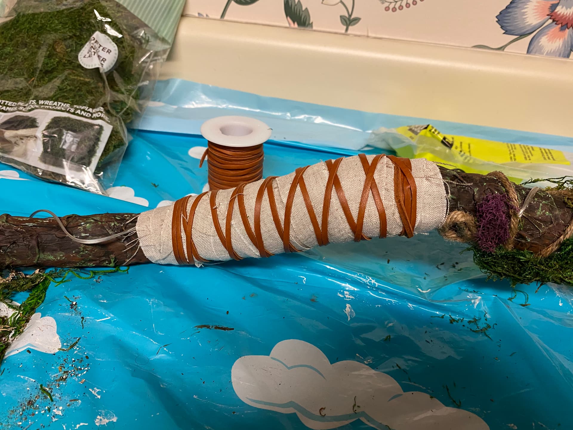 I put the open end of the bottle over the end of the pvc pipe, and use a lot of hot glue to fill the remainder of the opening.  I wrapped the wire that ran to the power pack along the staff in an irregular pattern, to try to disguise it, then covered it with jute-covered wire, just rope, dried moss, twigs, and faux leaves.  I gave the rope and wire some age with brown and black markers.