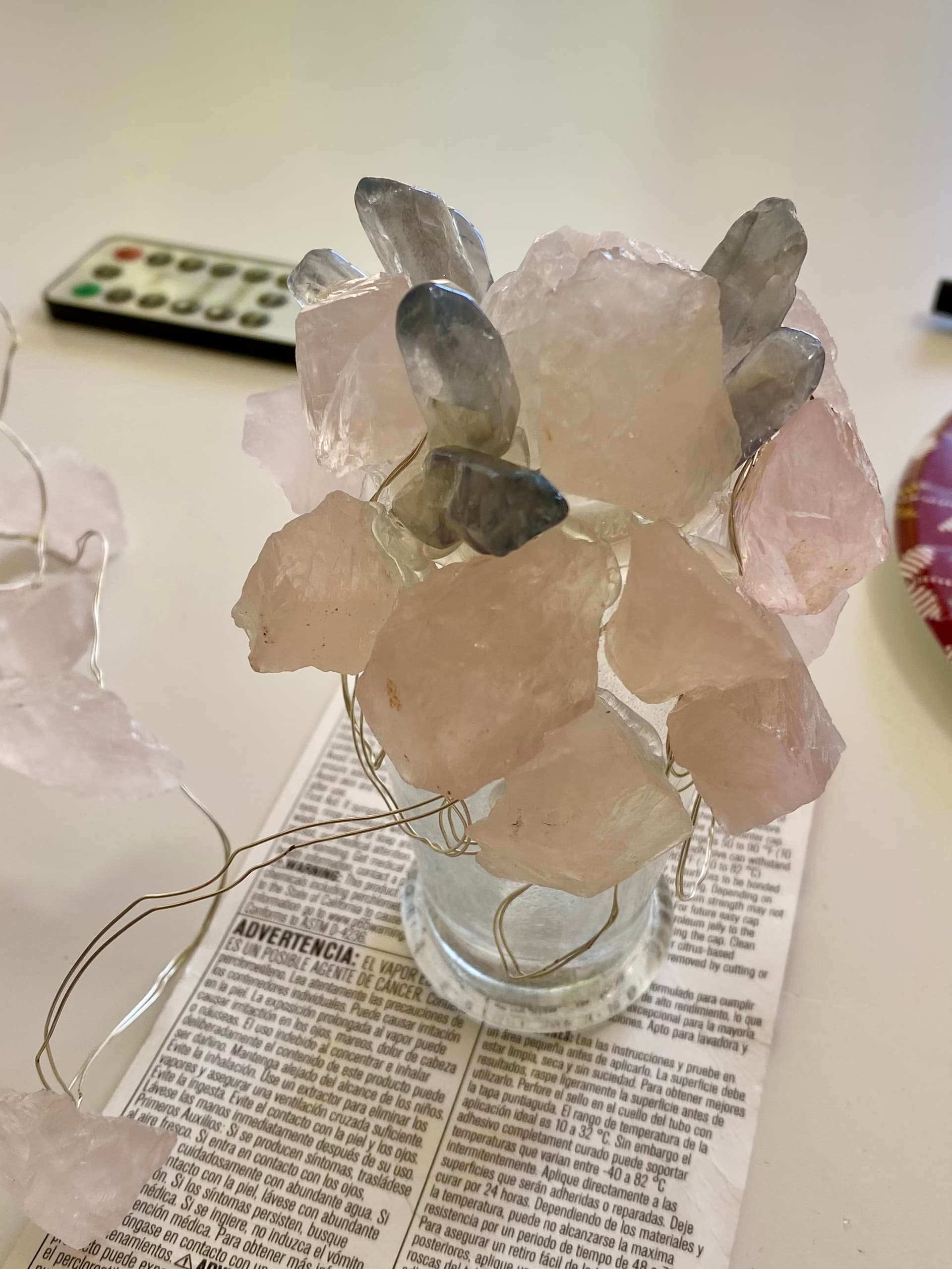 The magic crystal is actually a set of rose quartz string lights.  They came wrapped up in a small ball, and I decided I wanted the crystal to be bigger than that, so I took one of the glass potion bottles, and started gluing the stones around it the bottom.  When I ran out of string lights, I used some regular rough cut rocks along the bottom.  I used a string of grey/clear crystal point beads to fill in the holes and hide the wire, and to give it all a more organic appearance.