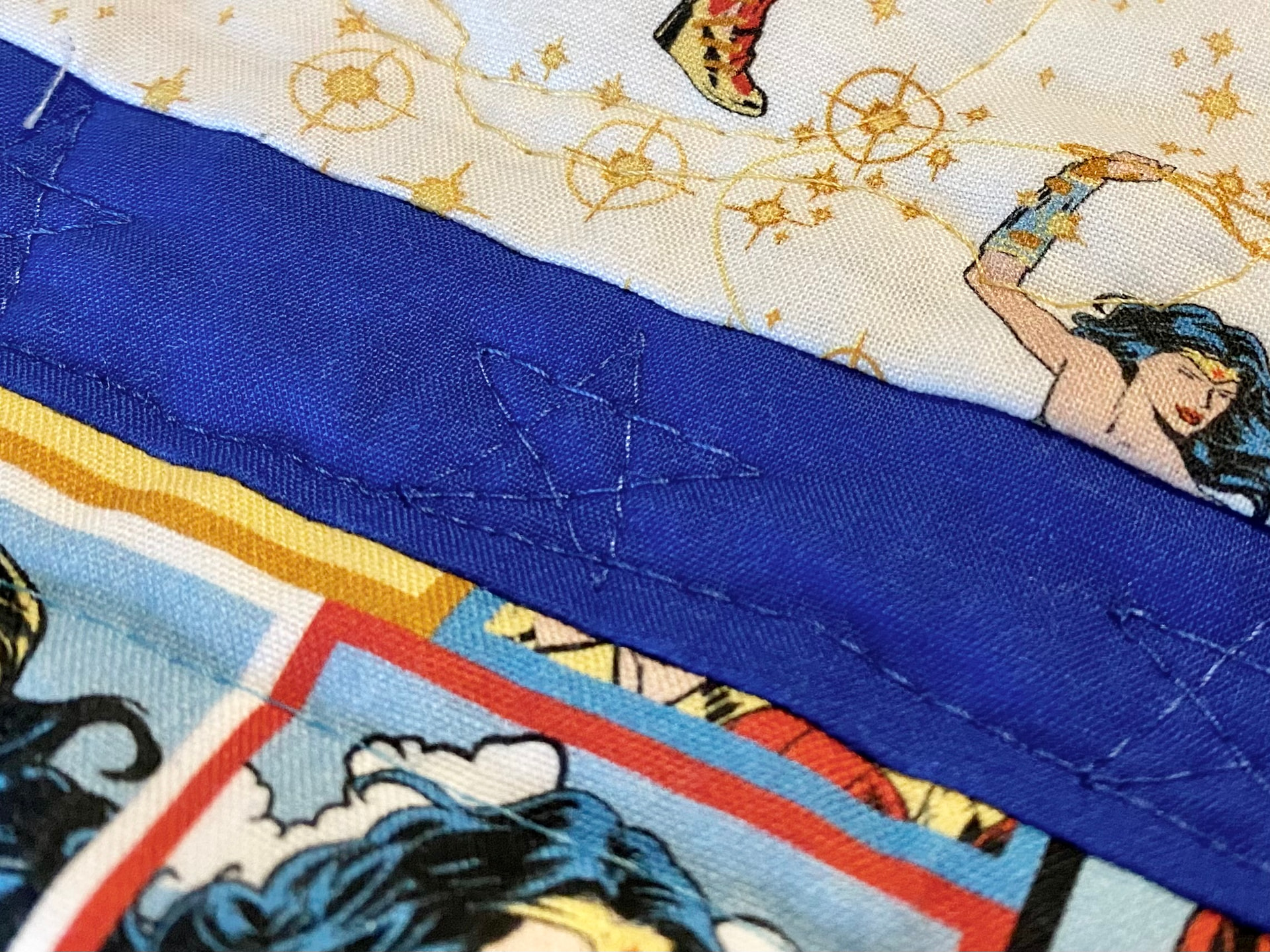 The binding was done with the comics print too. I think I managed to use all but three 2.5" strips of the Wonder Woman fabric! The few leftover strips went into my 2.5" strips bins. It will be sent to Quilts for Kids, to help a kid facing a really tough time.