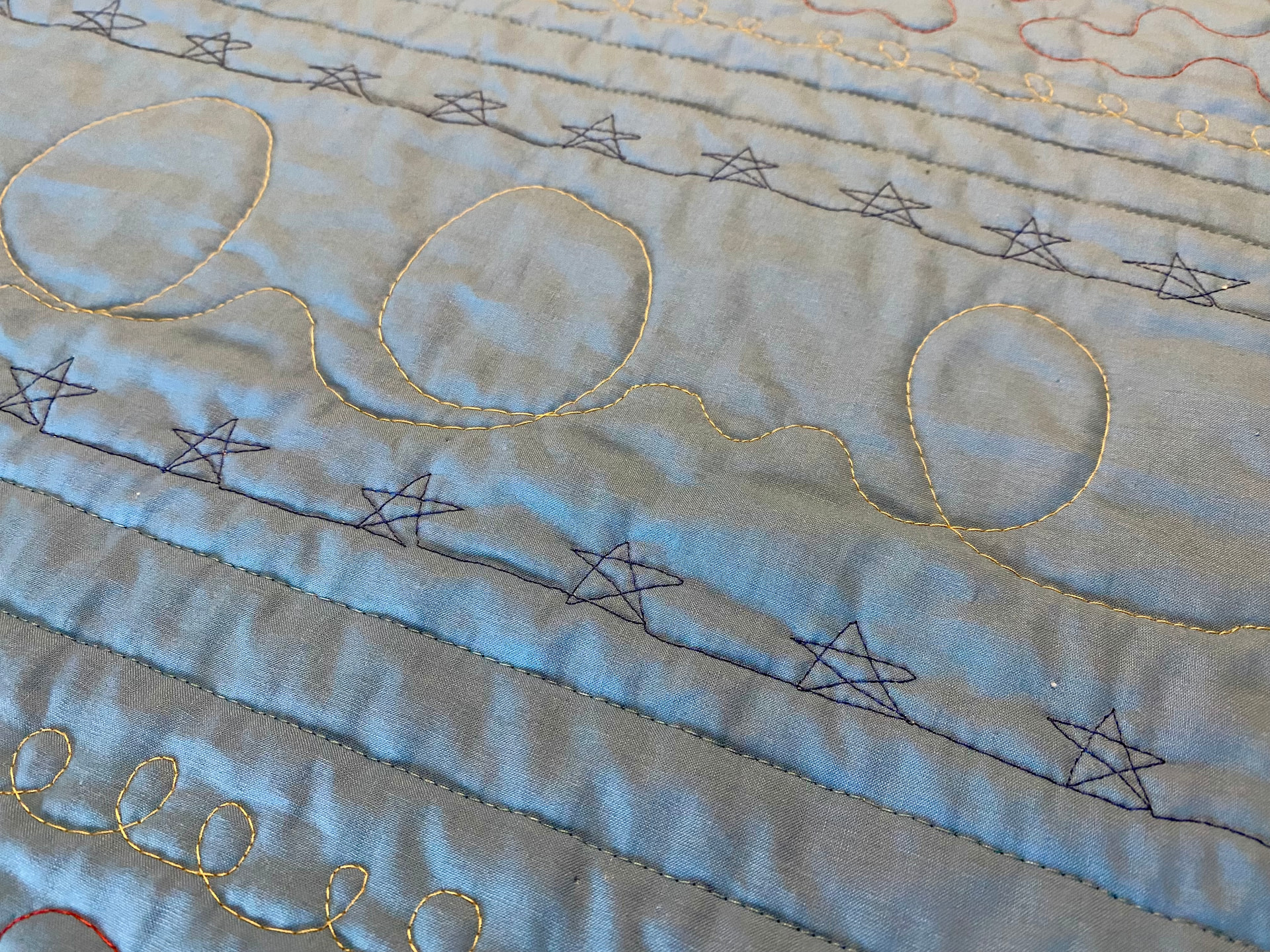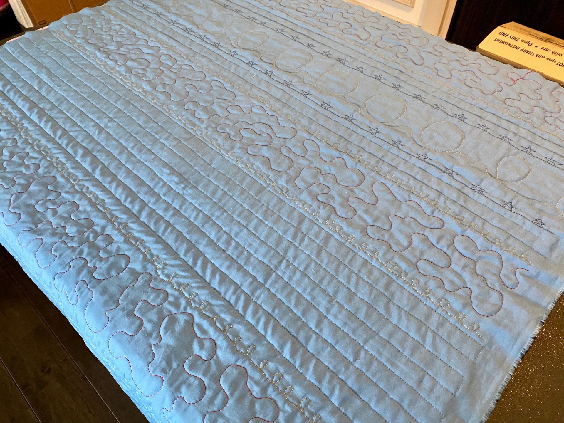 The yellow strips (cut to 1.5”) were a gift from @sheepBlue, and the cobalt blue strips and medium blue backing were in my stash. I couldn’t decide what kind of pattern to quilt, or what color thread would look good on all the stripes, and I wanted the stripes to feel individual, so I ended up doing a different pattern in each color. Yellow got loops.