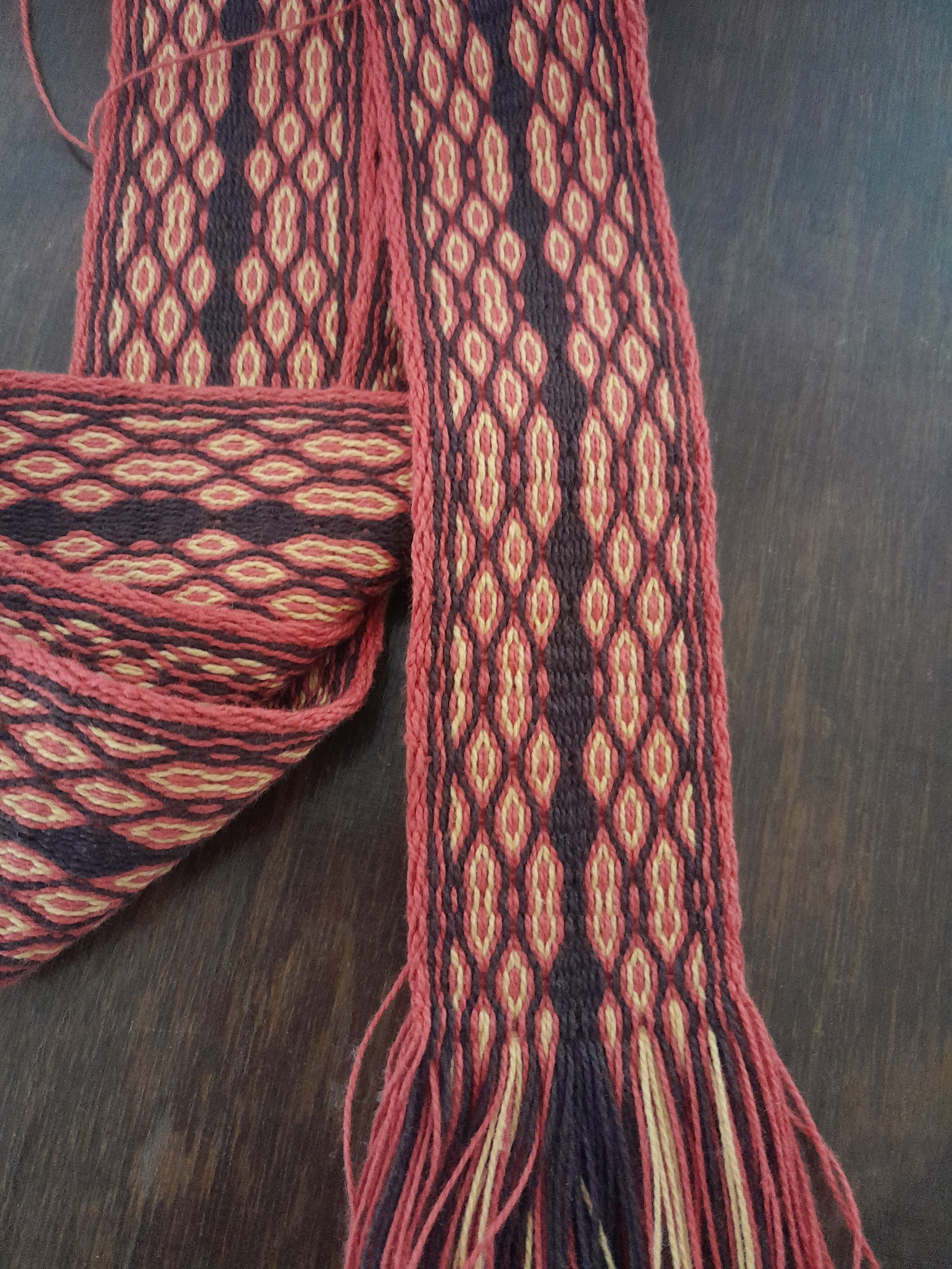 It was tablet woven on an inkle loom. A simple, twist neutral, all-together pattern which was quite fast to weave.